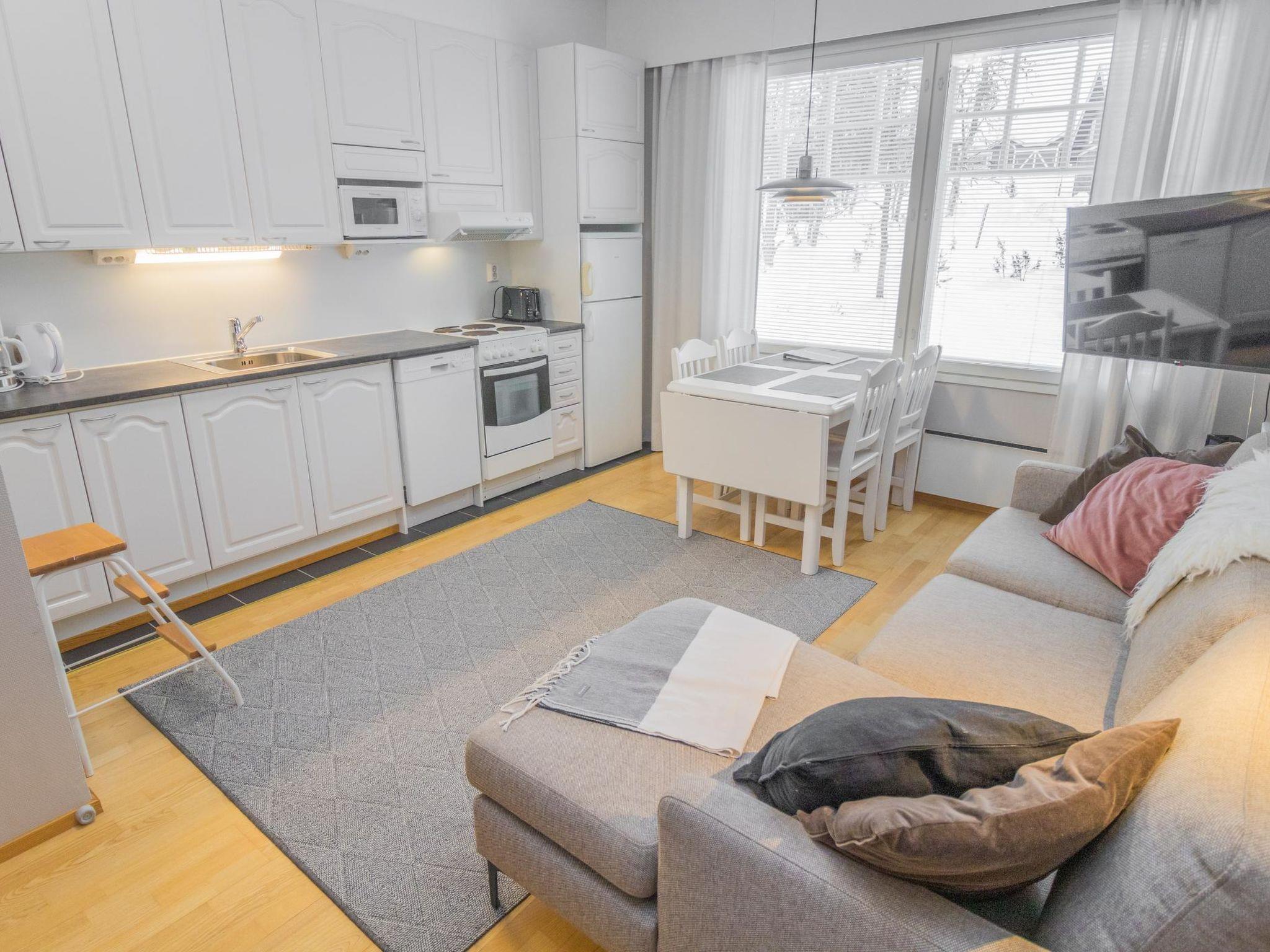 The kitchenette has everything you need for cooking and socialising. You can enjoy the warmth of the fireplace while dining, and the apartment's own sauna provides extra warmth after a day's excursions.