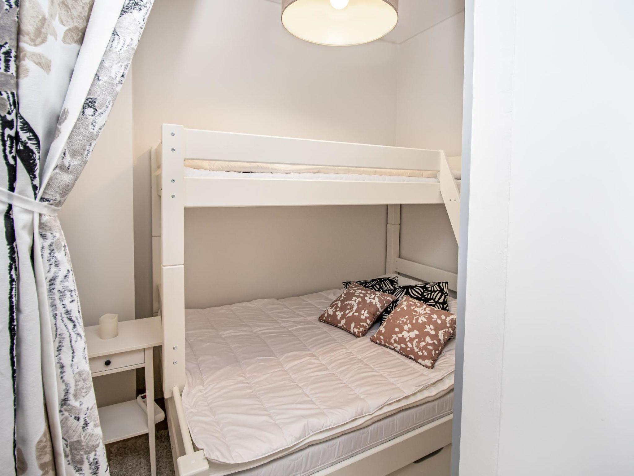 The accommodation consists of one bedroom and an alcove, providing a relaxing retreat after an active day. The bedroom (with sliding door) includes a comfortable 180 cm wide double bed with a box spring mattress, while the alcove, separated by a curtain, has a bunk bed with a 140 cm wide lower bed and a 100 cm wide upper bed.