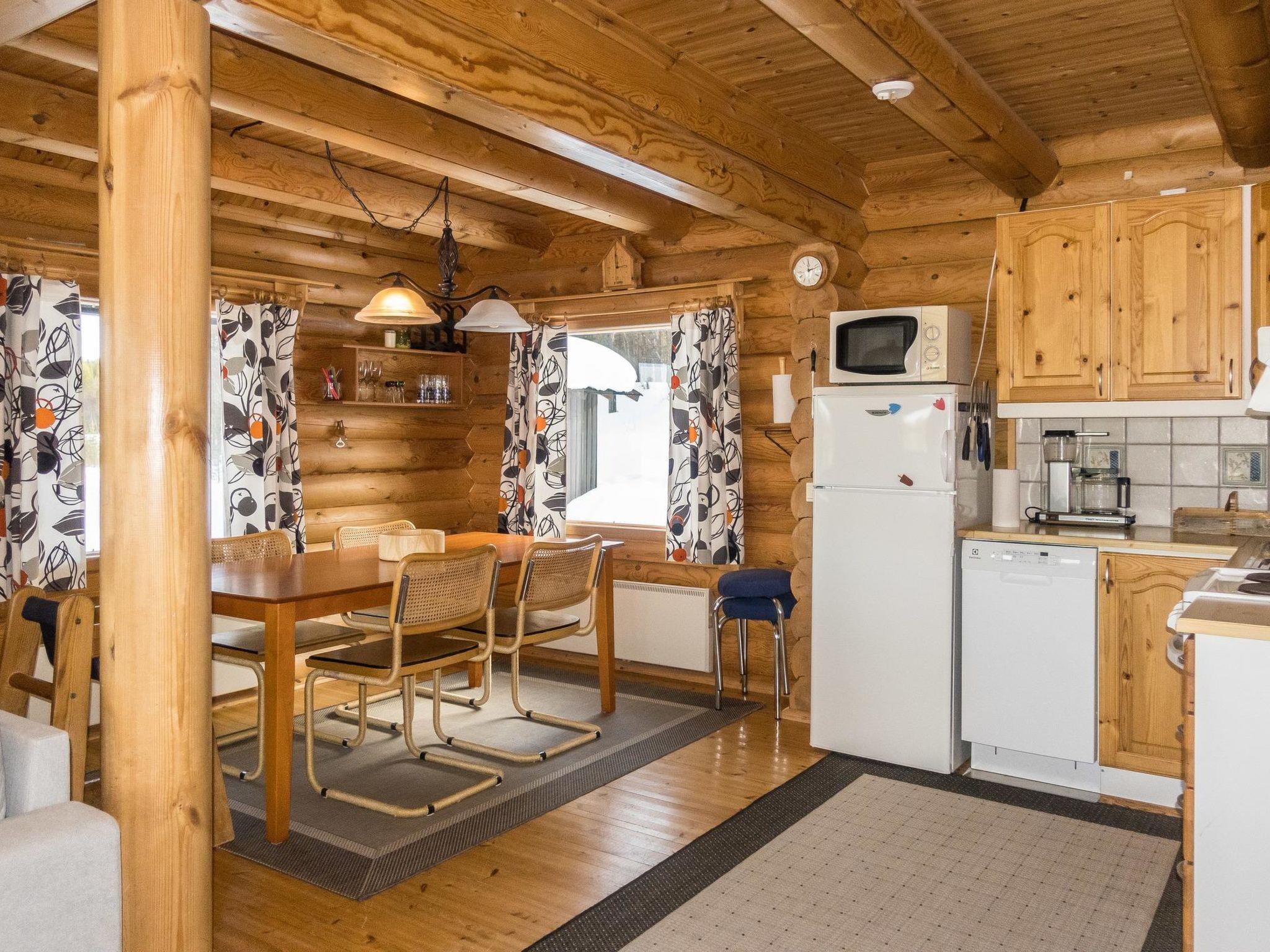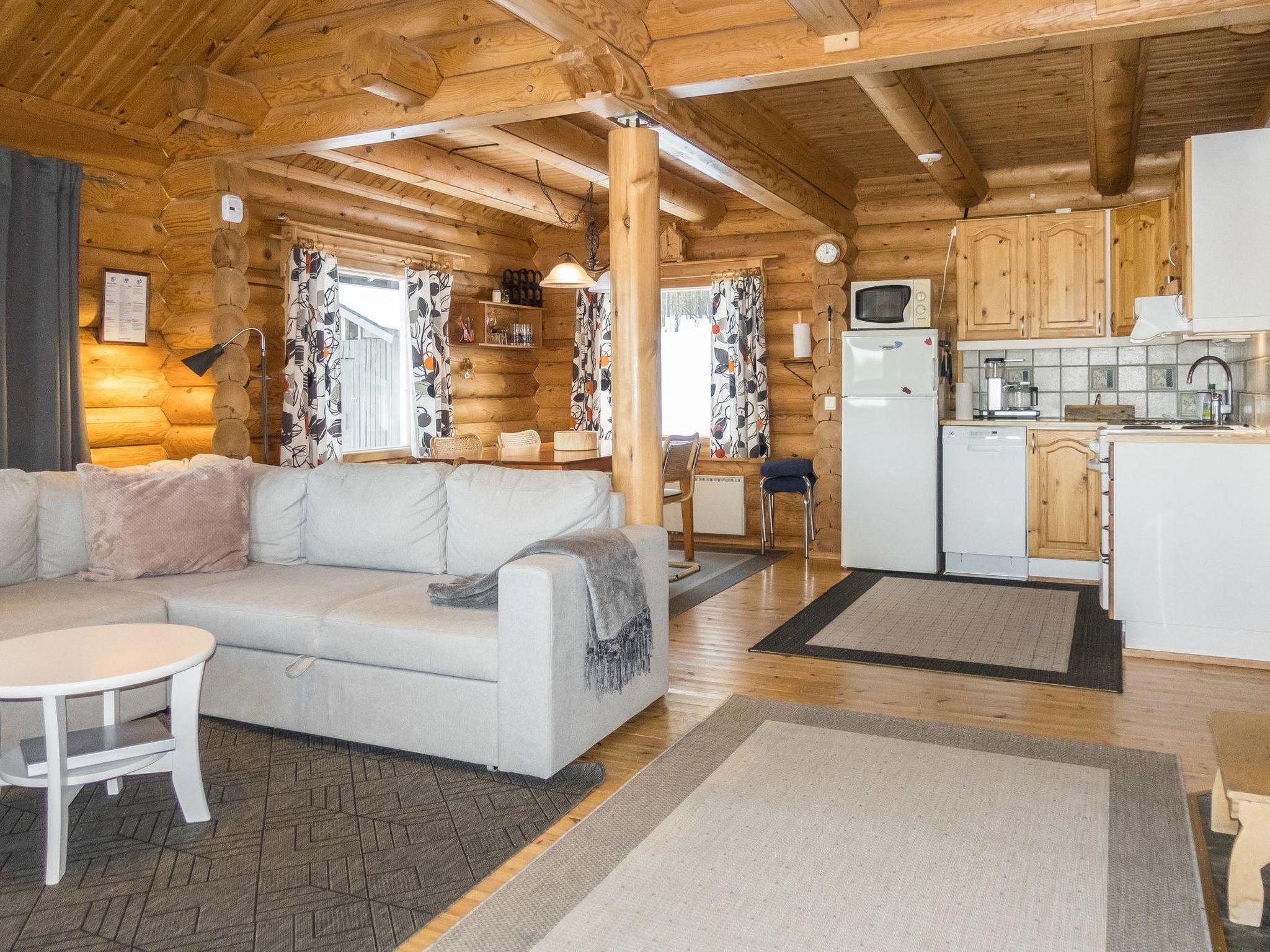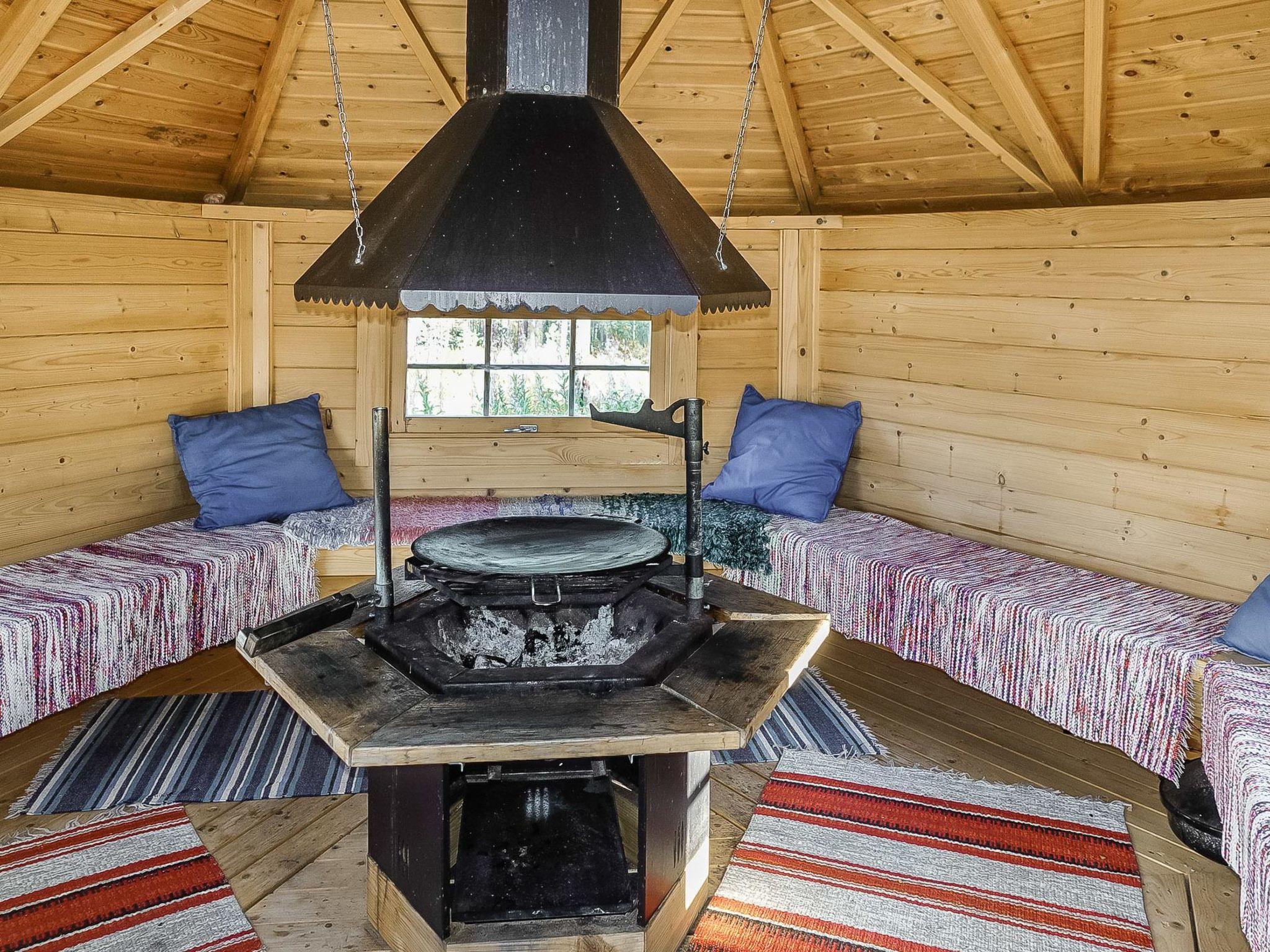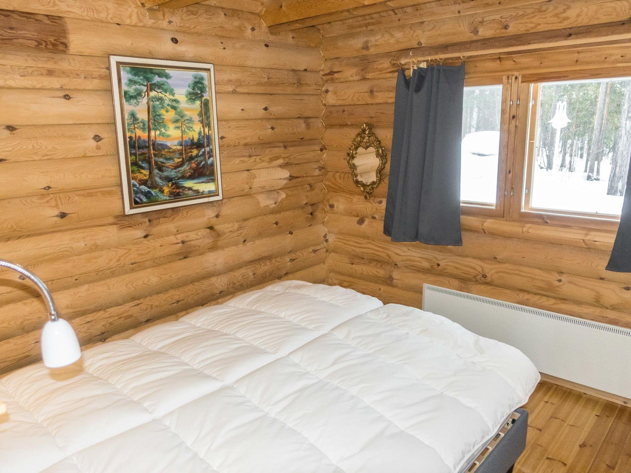 Round log cabin, built in 2005. Living room/kitchen, with sofabed for 1-2 person. Double bed in bedroom, bouble bed in loft, + 1 separate bed (80cm wide). Sauna, washroom (shower cubicle)/WC and covered porch.