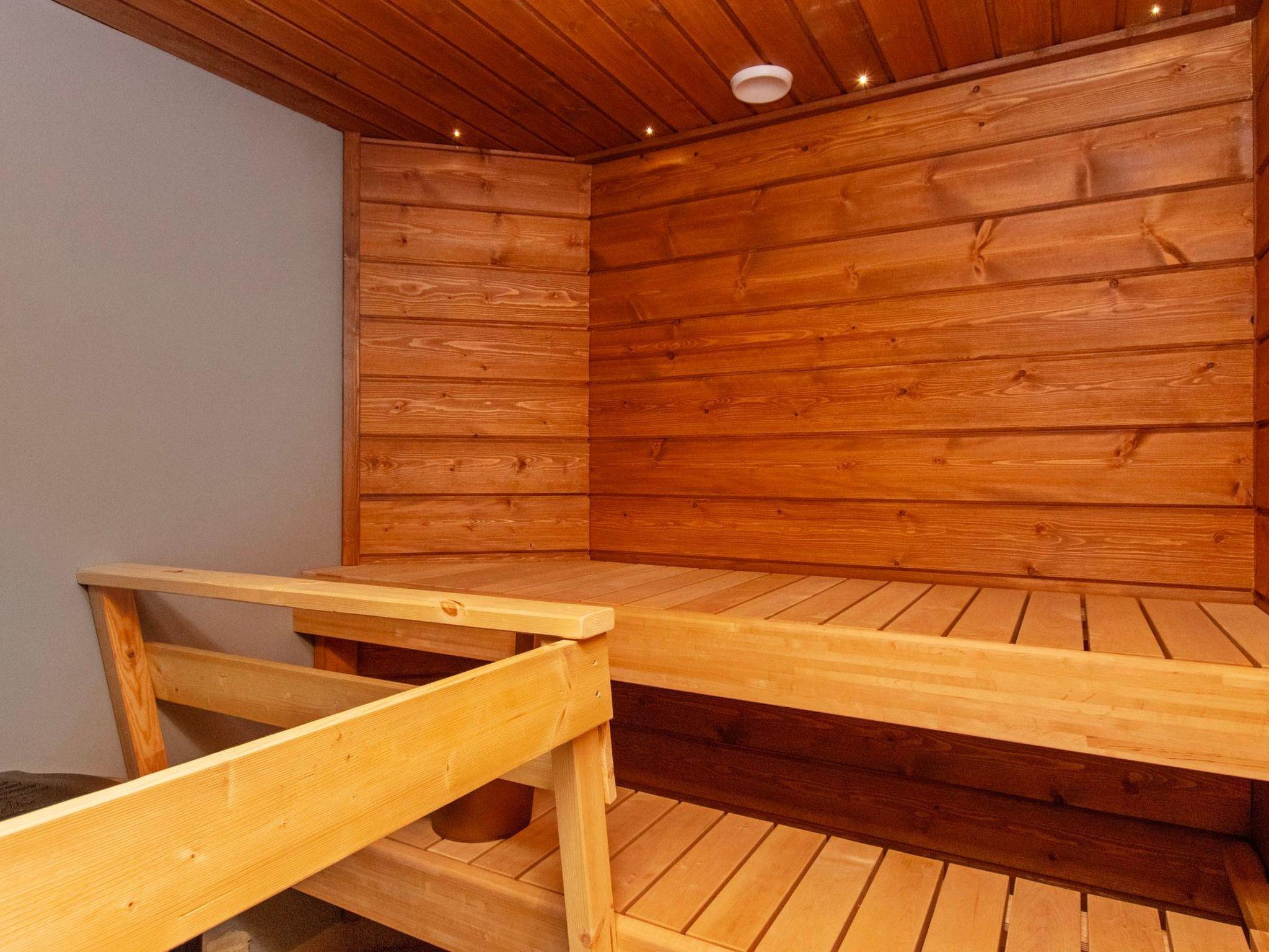 The lakeside sauna (2023) includes a dressing room, WC, shower, and wood-heated sauna stove. There is a covered patio.