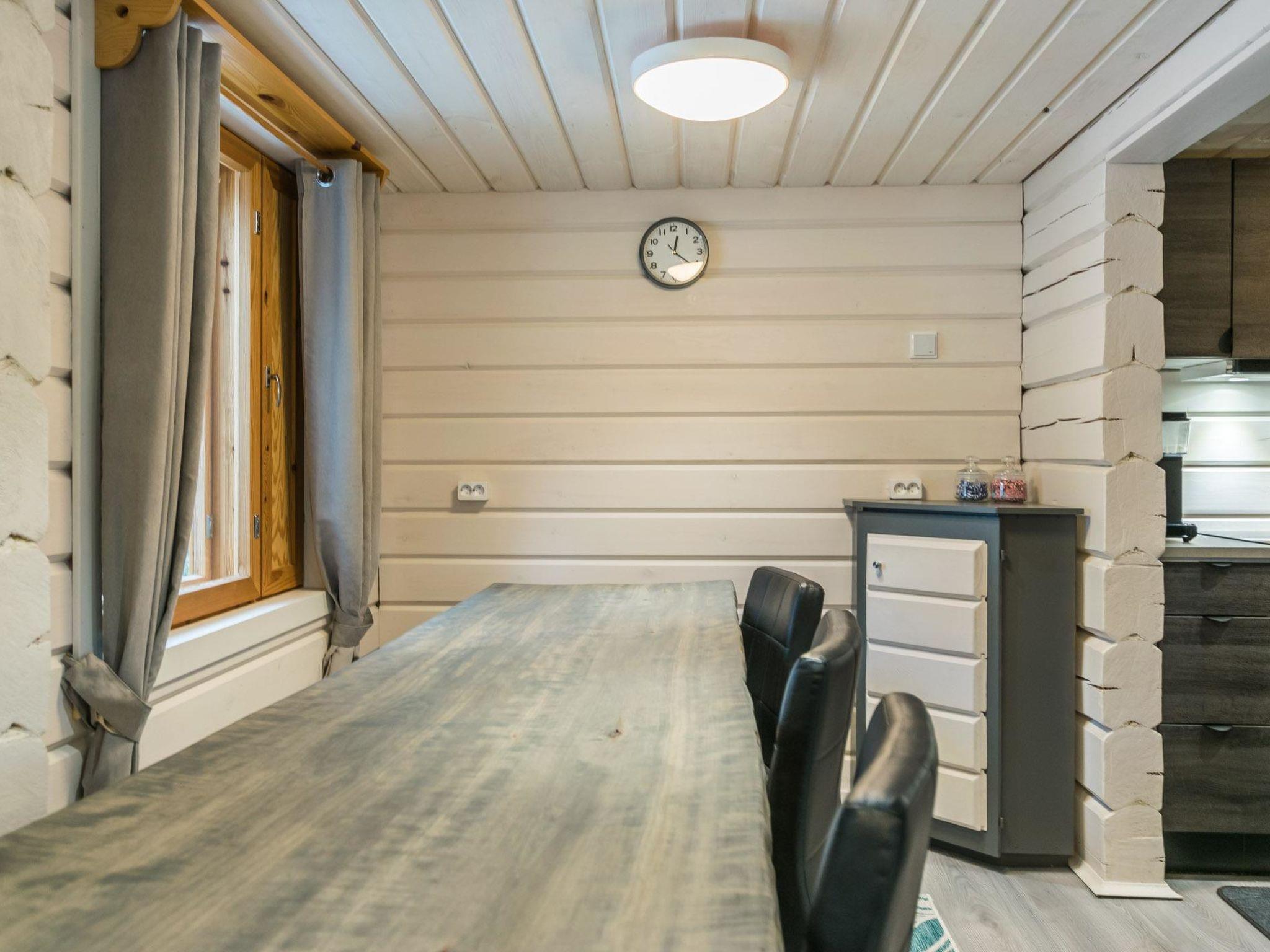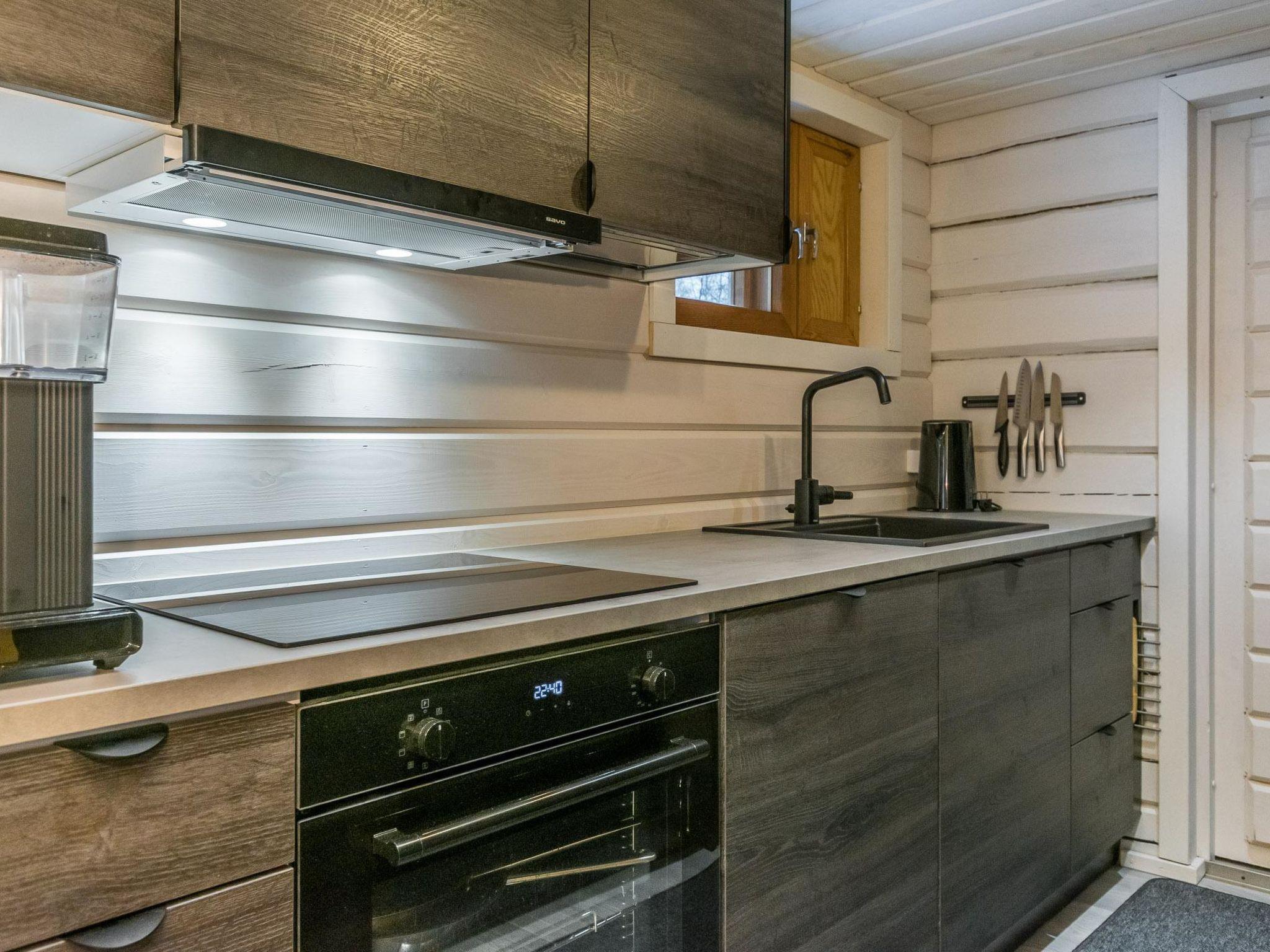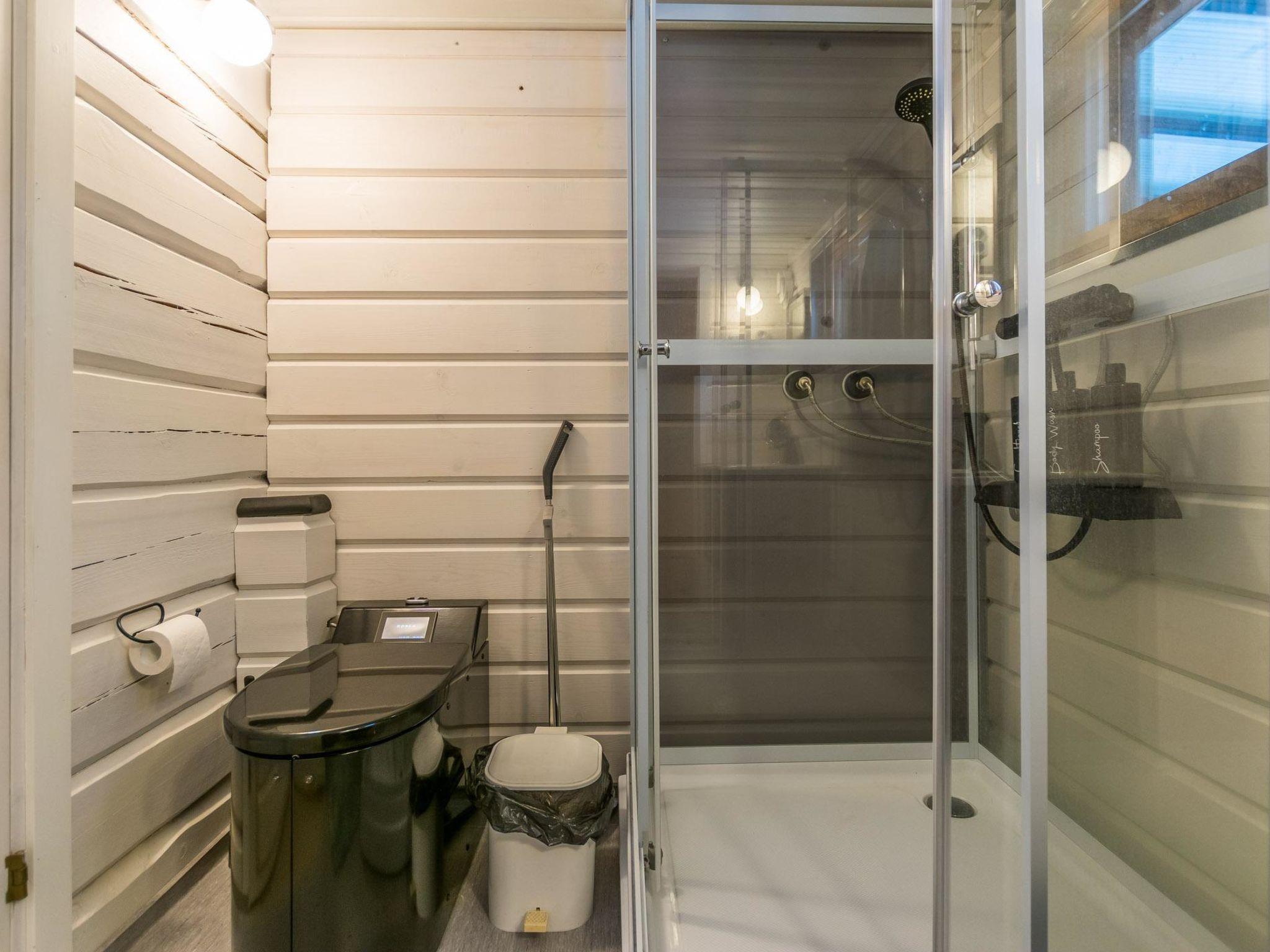 The cabin includes two sofas, a heat-storing fireplace, a wood stove, Google TV, and an air source heat pump. A long dining group seats eight. The stylishly furnished kitchenette is well-equipped for preparing and serving meals. The washroom has a shower cubicle and a WC.