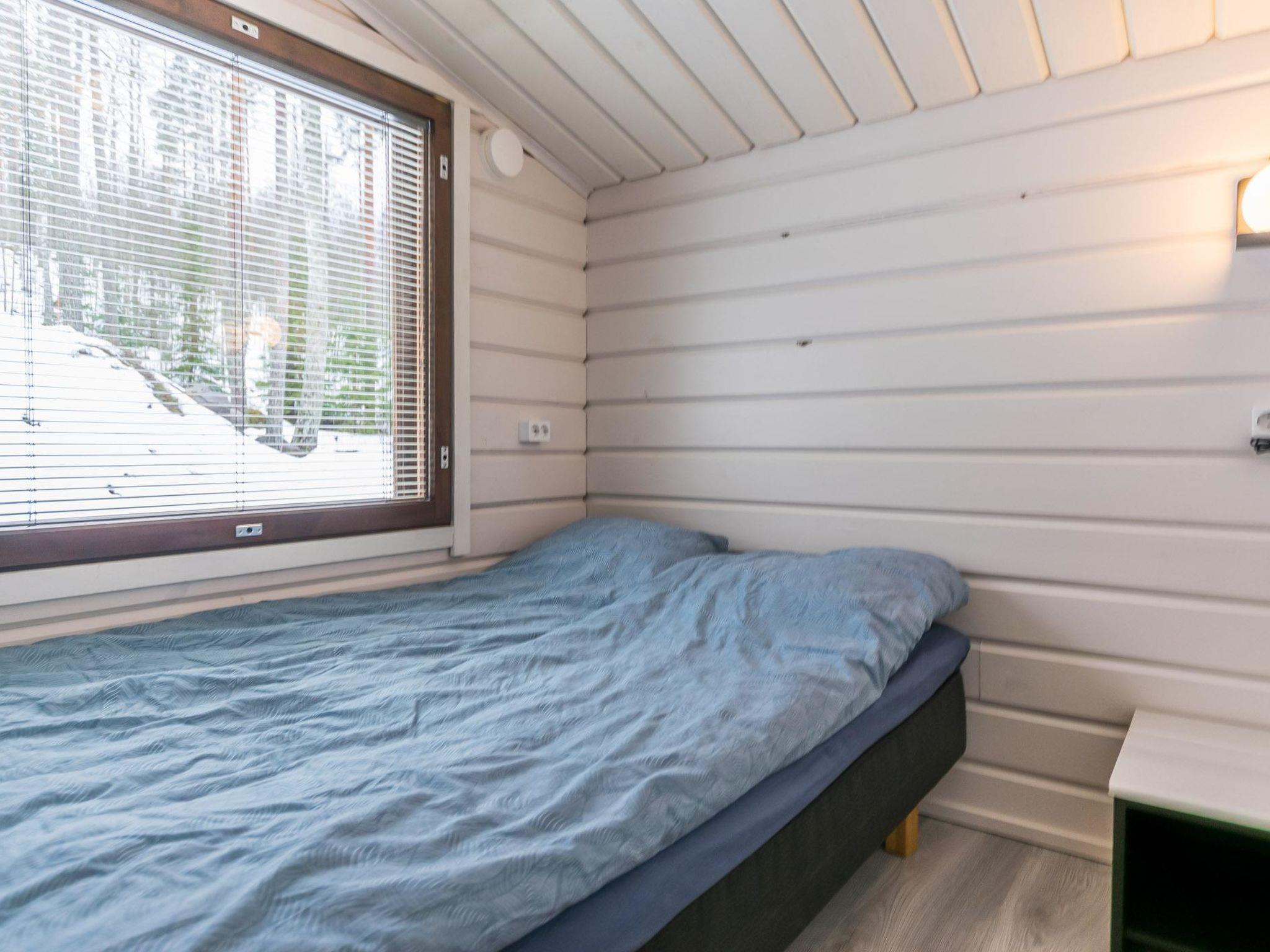 The separate 32 m² wood-heated sauna by the lake includes a dressing room with a fridge/freezer compartment. The washroom has a shower and hand basin. The sauna features a wood-heated stove, with dark walls and light benches creating a peaceful atmosphere. Windows provide a lovely view of the lake and yard. The lakeside sauna includes two sleeping areas – one with a double bed, the other with a 120 x 200 cm bed, and an air source heat pump. Bedside lights here also have USB-A ports.