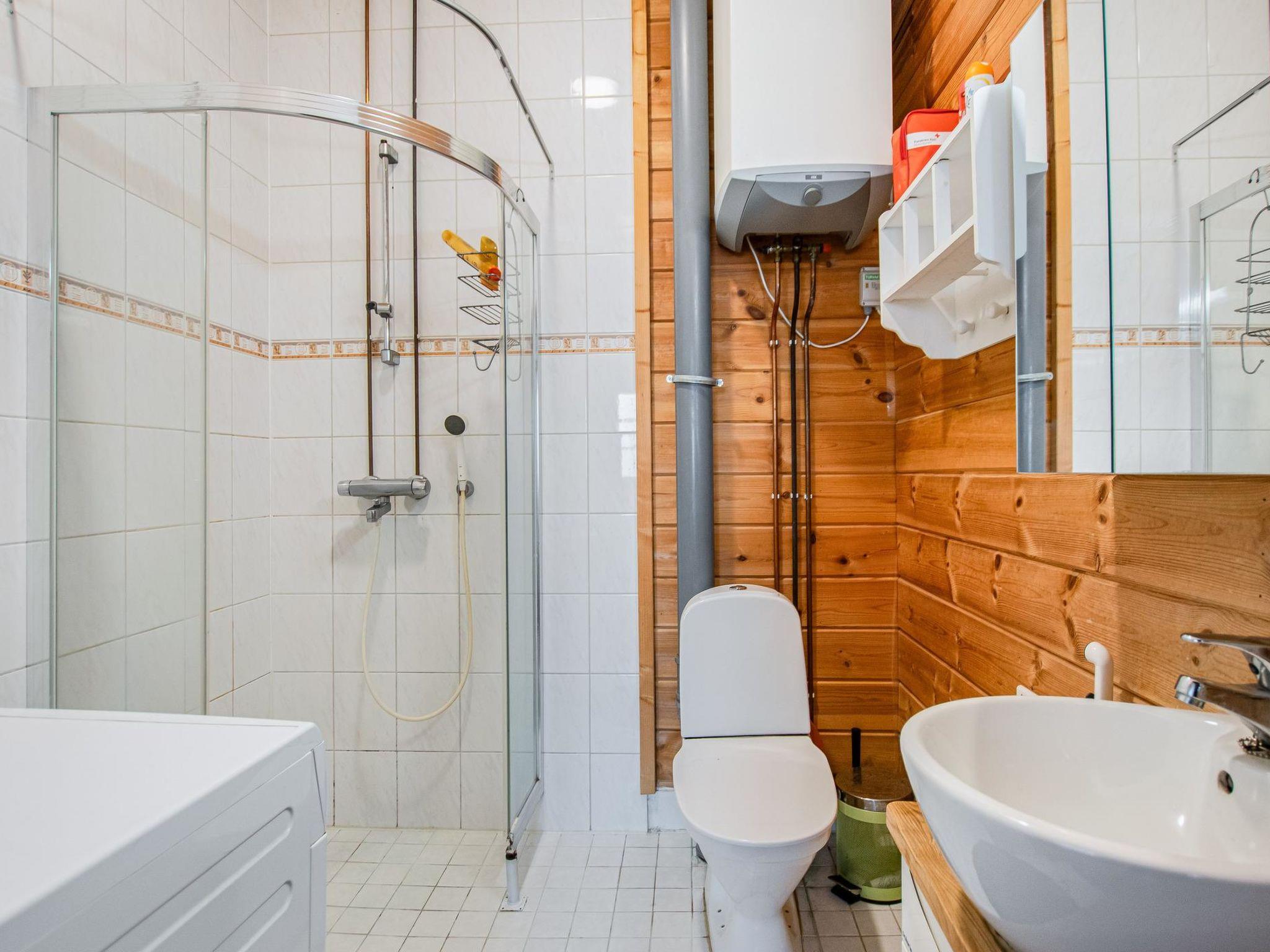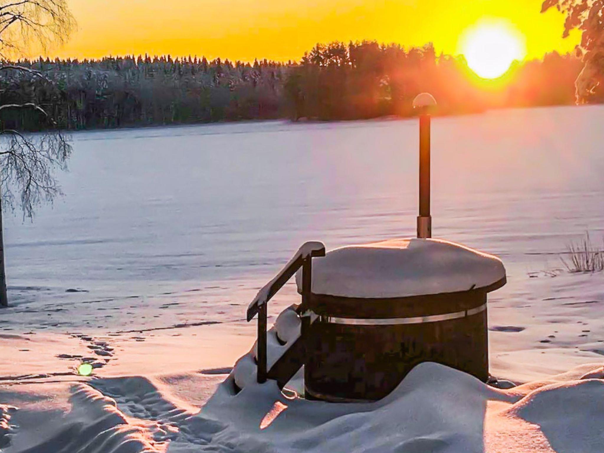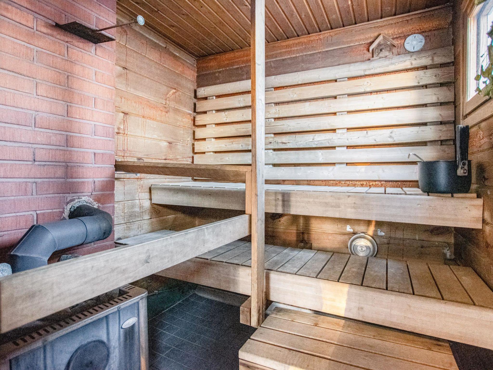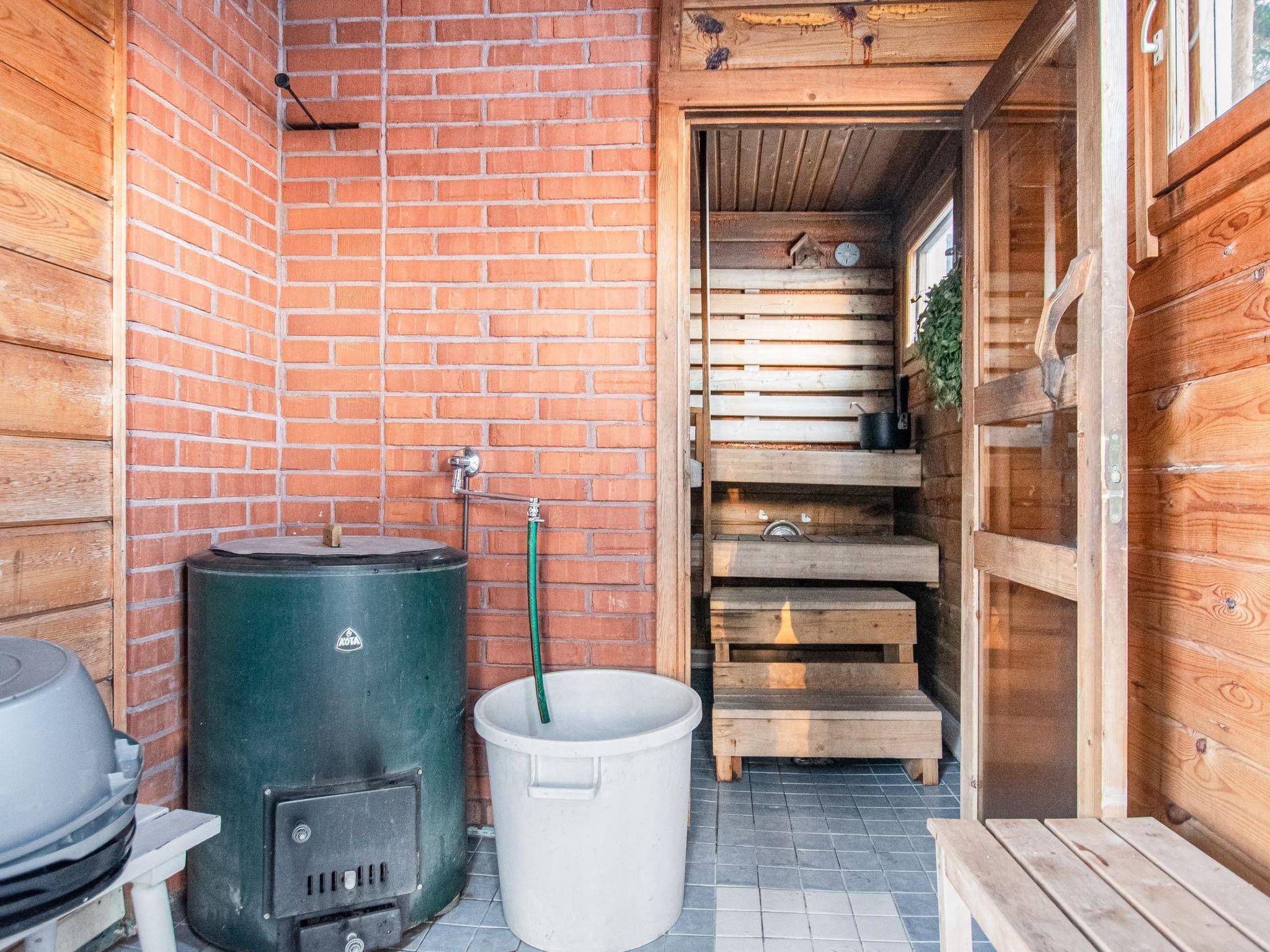 There is a separate lakeside sauna with living area. The living area is equipped with electric heating, a fireplace, and a refrigerator. The sauna features a wood-heated stove and cold water from a tap, with a cauldron for heating water.