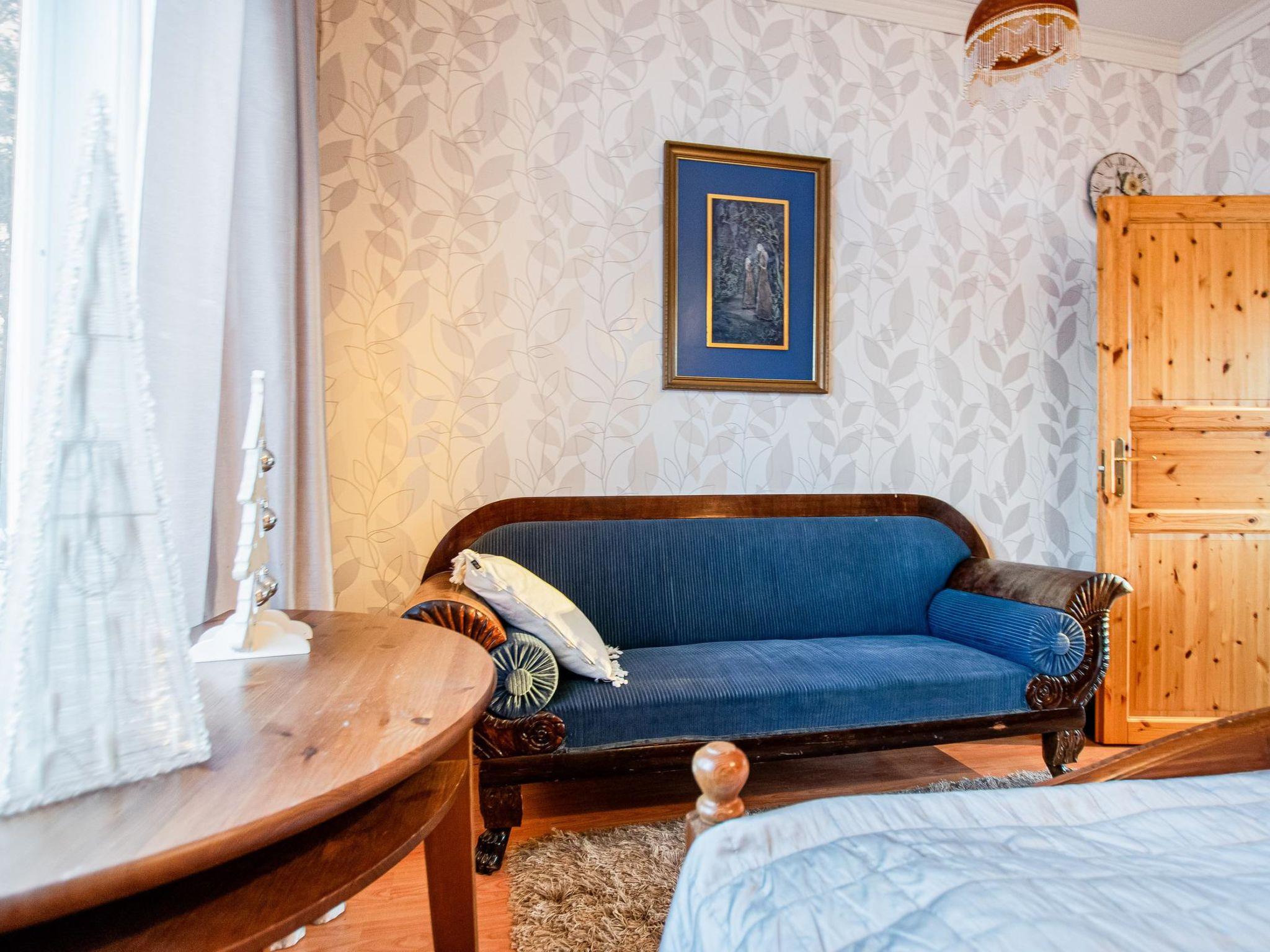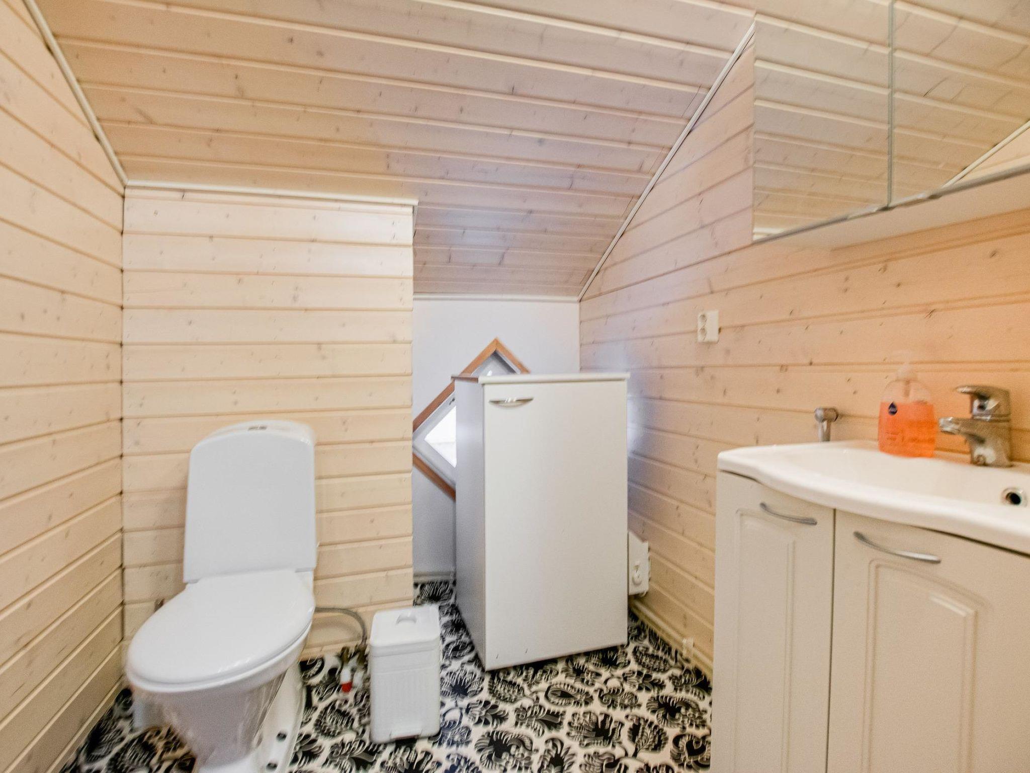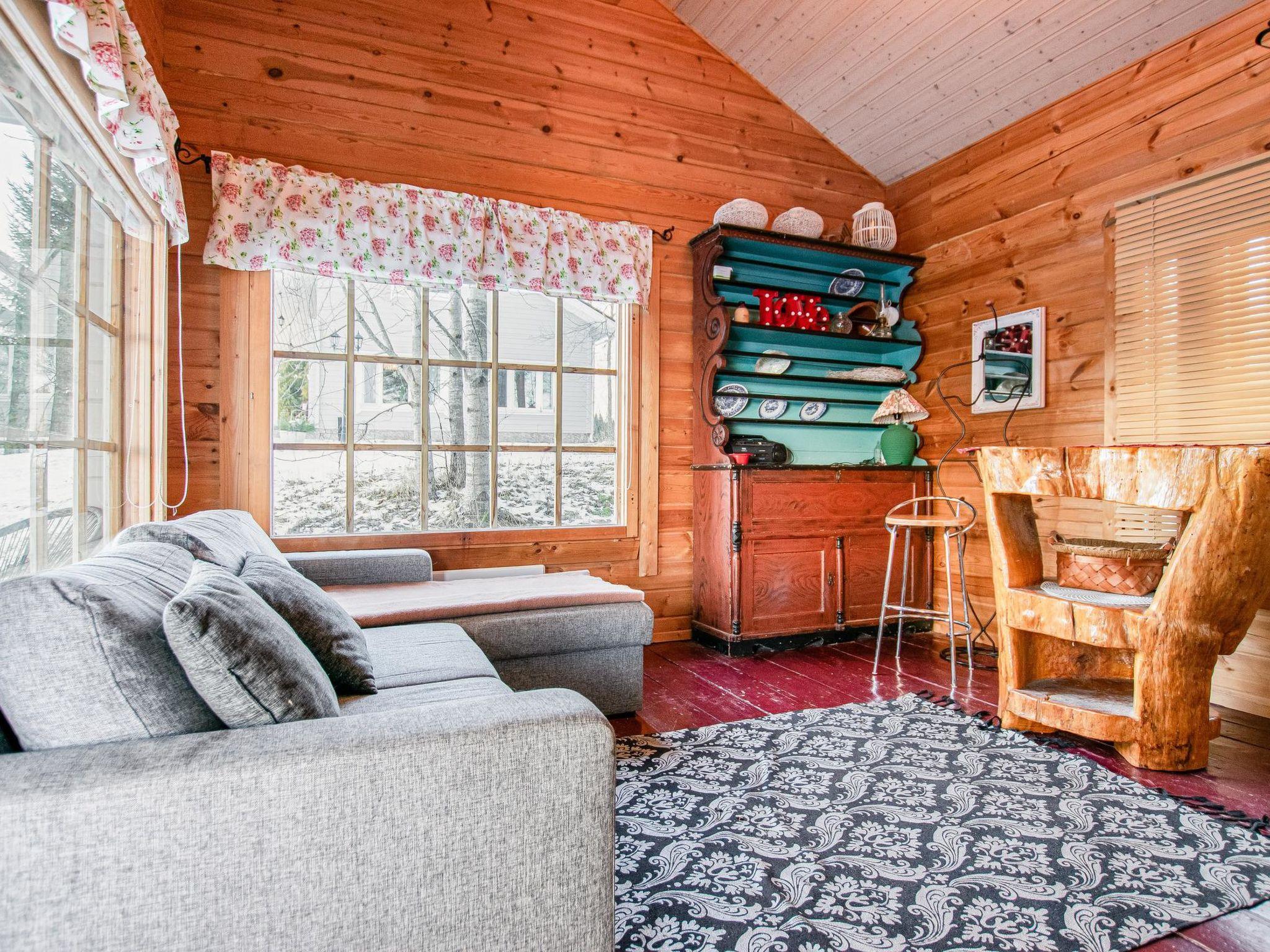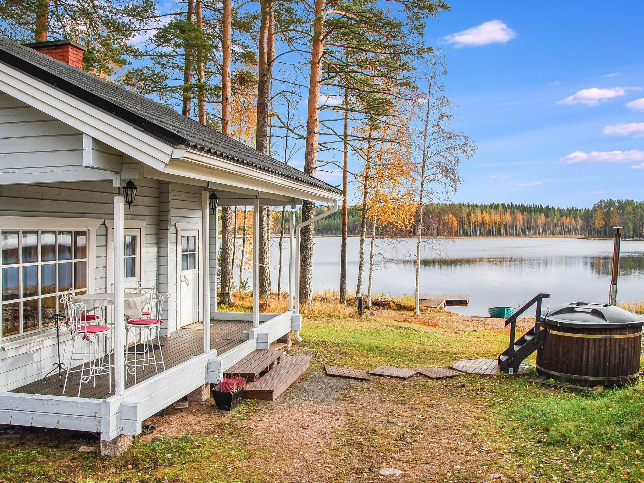 There is a separate lakeside sauna with living area. The living area is equipped with electric heating, a fireplace, and a refrigerator. The sauna features a wood-heated stove and cold water from a tap, with a cauldron for heating water.