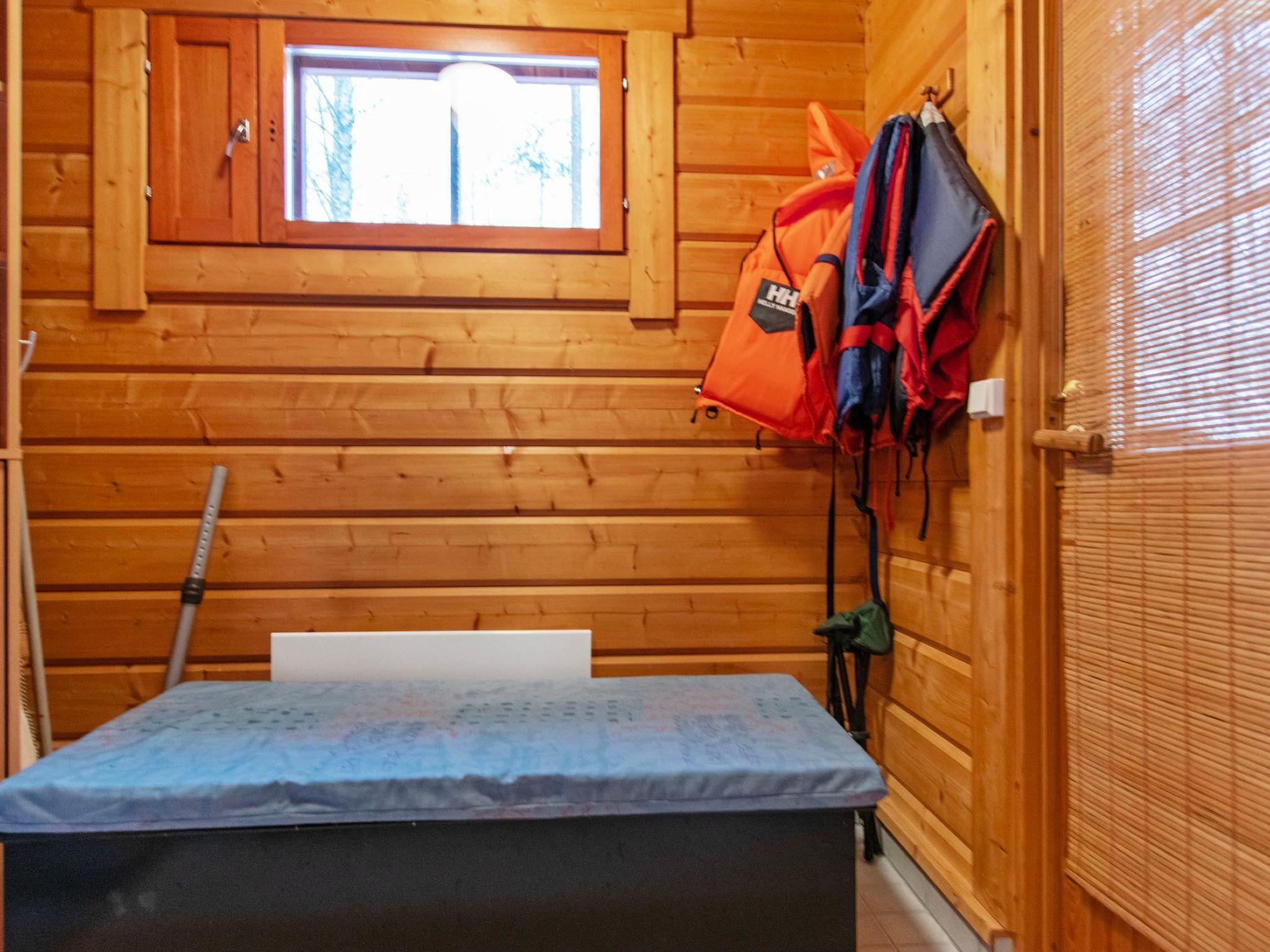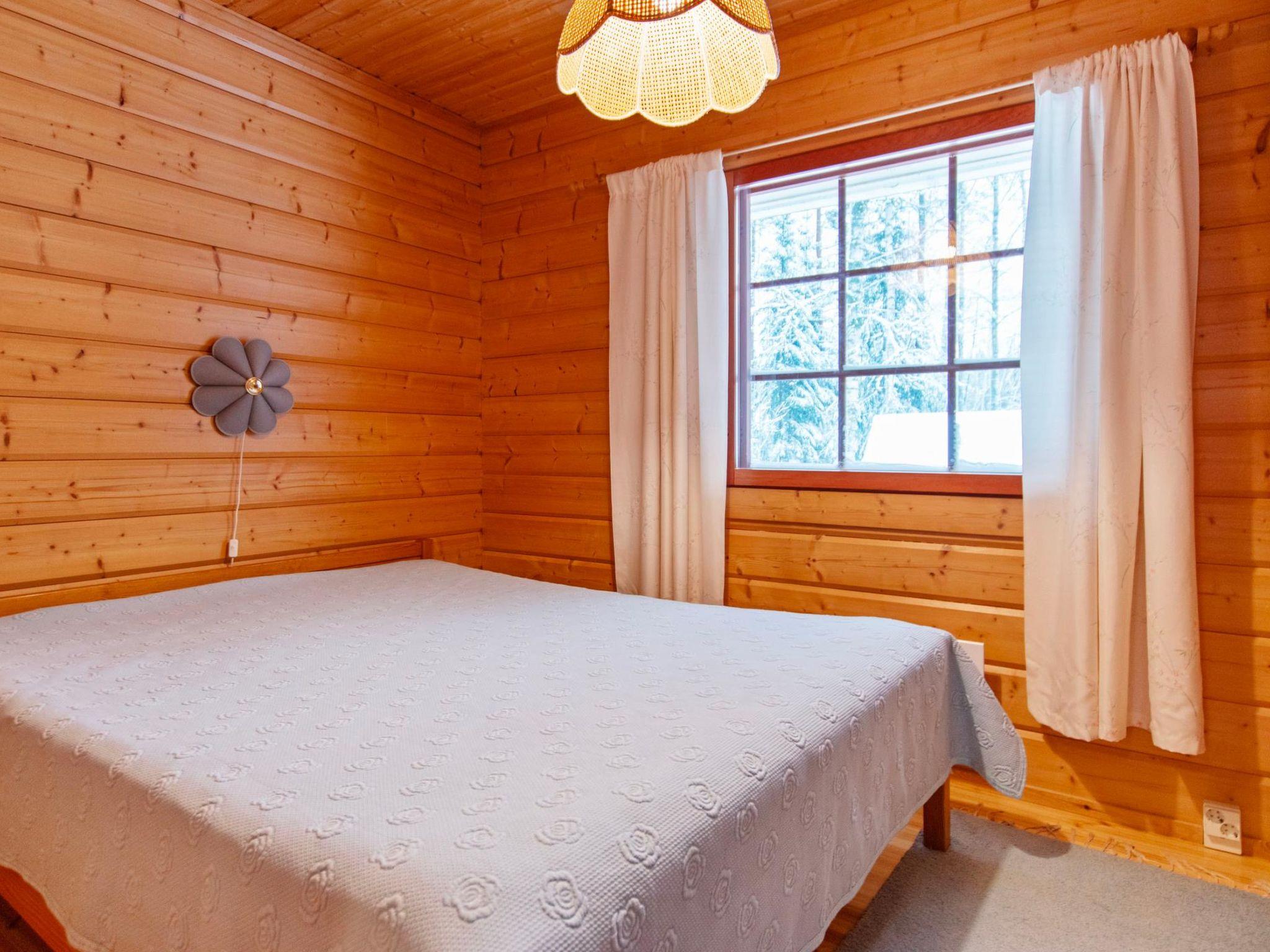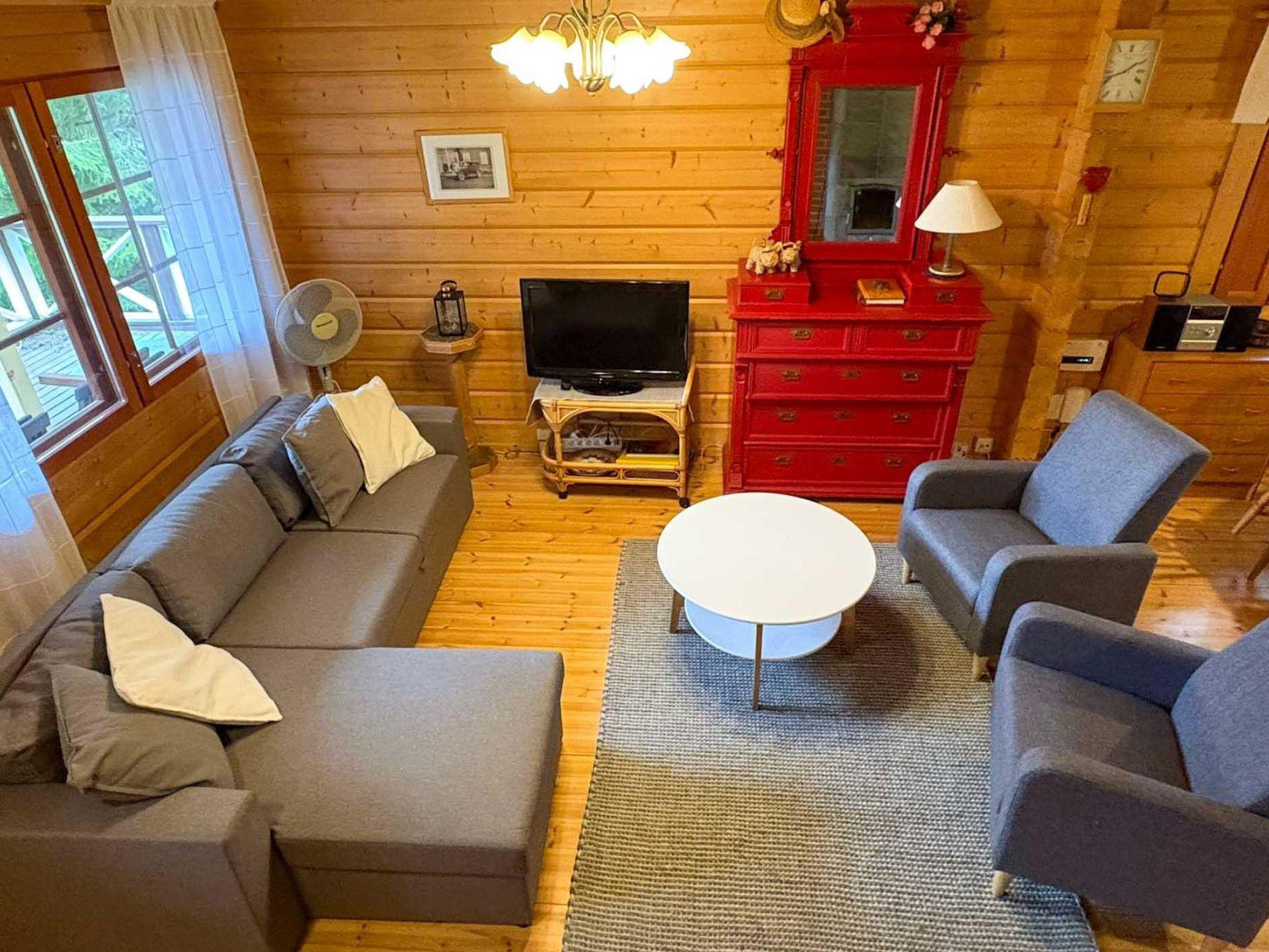 100 km north of Tampere, own pier and a rowing boat. The log cabin (2001) features a living room /kitchen. The living room has a sofa set, TV, heat-storing fireplace, and dining area. On the ground floor, there is a bedroom with a double bed. The loft (accessed by steep stairs) includes two beds and a sofa bed that opens into an additional 140 x 190 cm sleeping place for two.