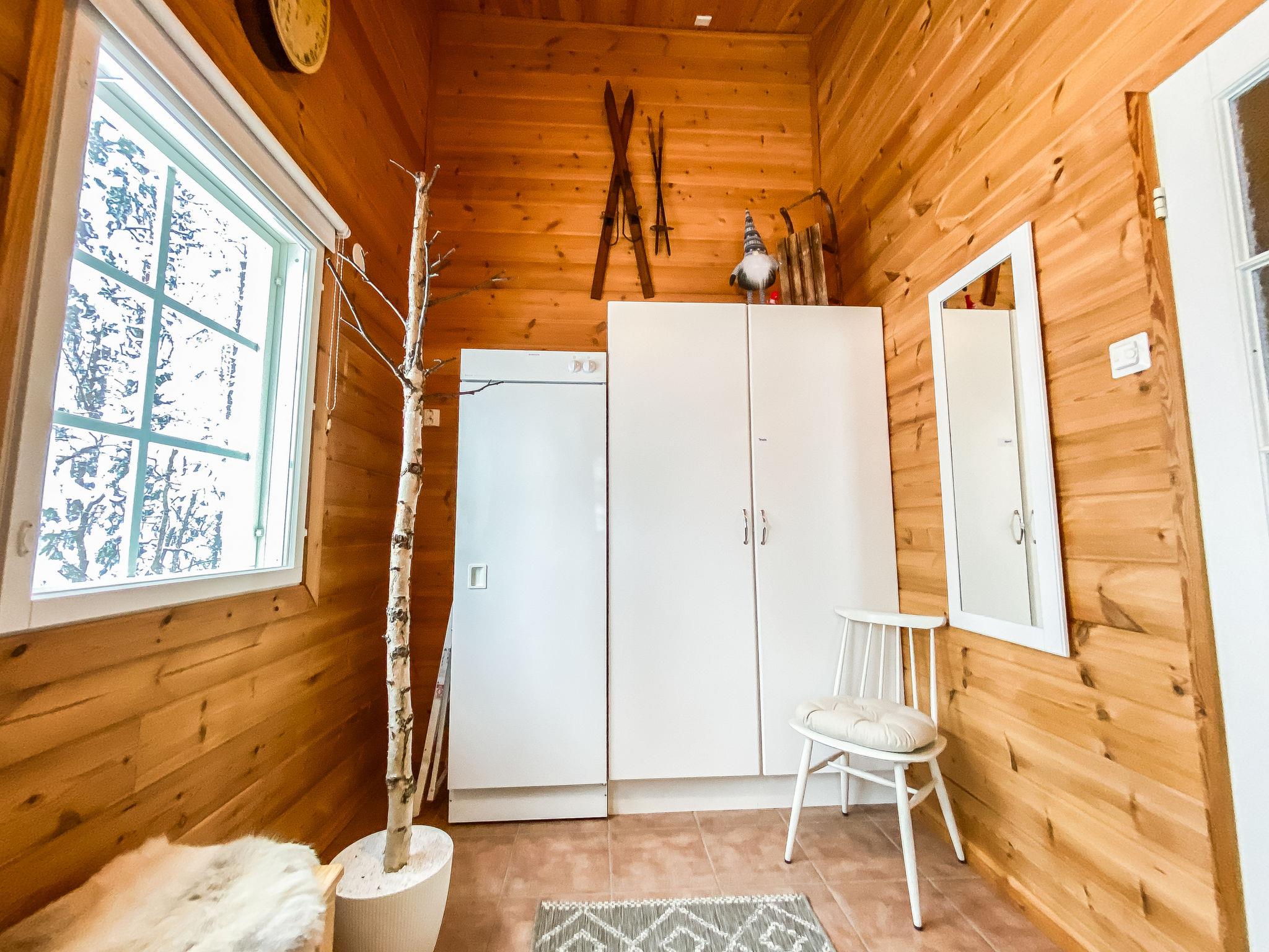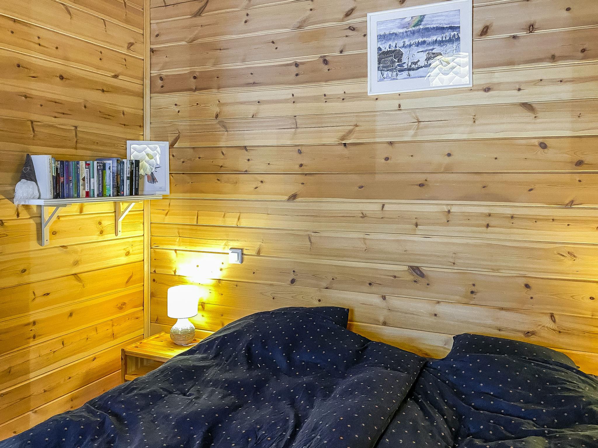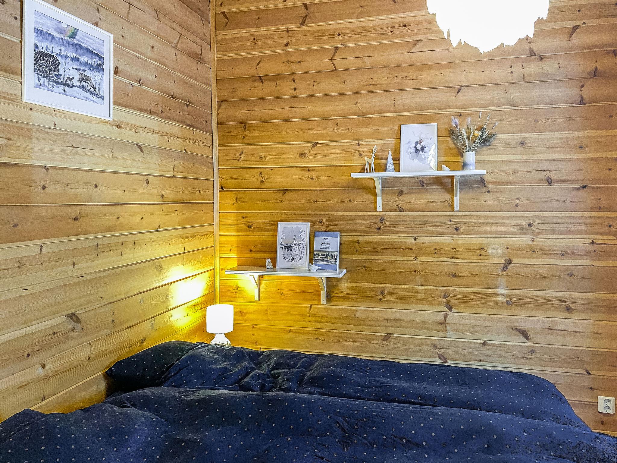 Log cabin built in 2002, located near Lake Jerisjärvi in a peaceful setting. The living area is spacious and connects to an open-plan kitchen equipped with basic cooking facilities. The cabin includes a separate indoor WC, a washroom, and a sauna. The cabin features one bedroom with a 160 cm wide double bed and a low loft with two 90 cm wide mattresses.