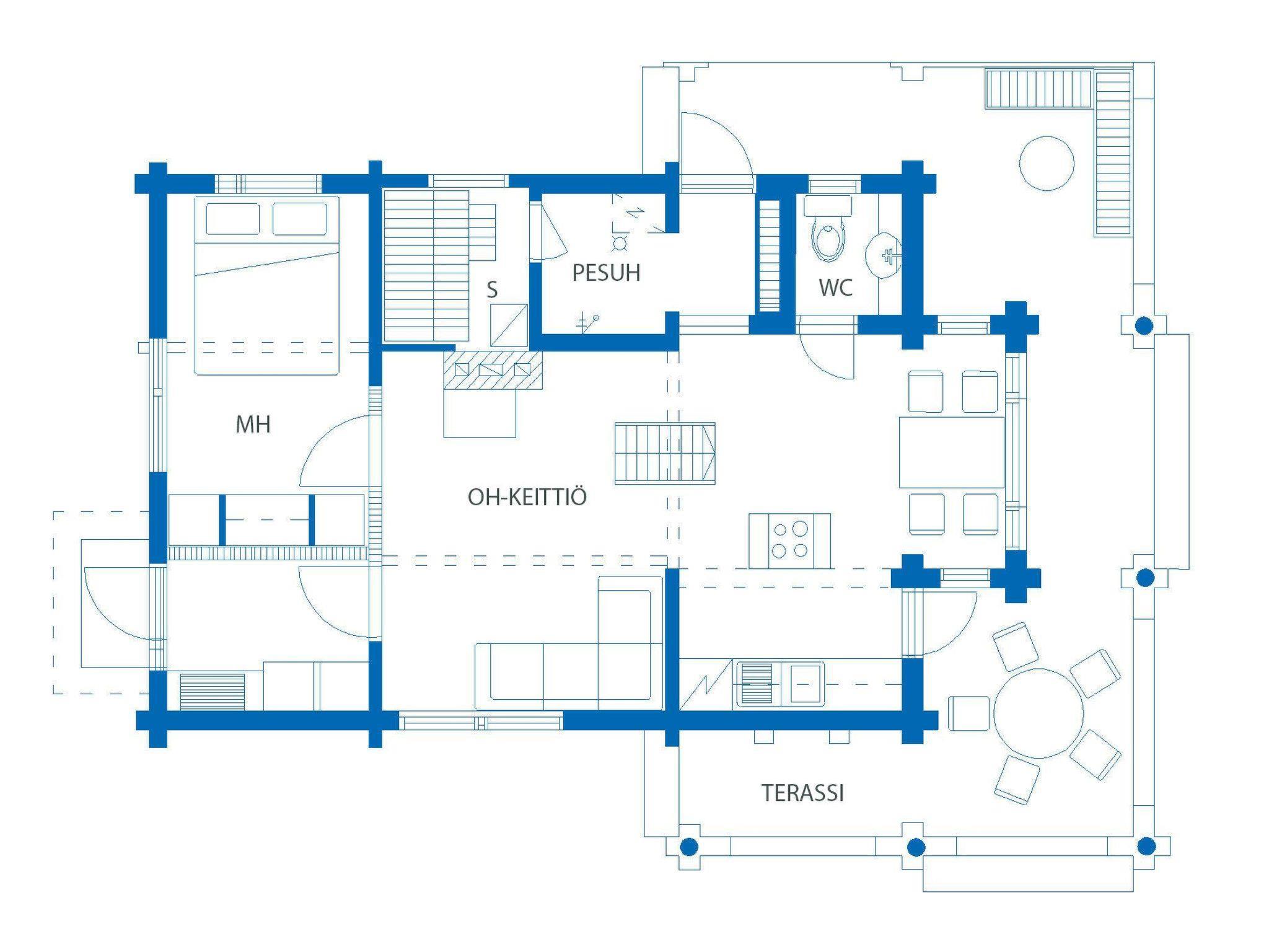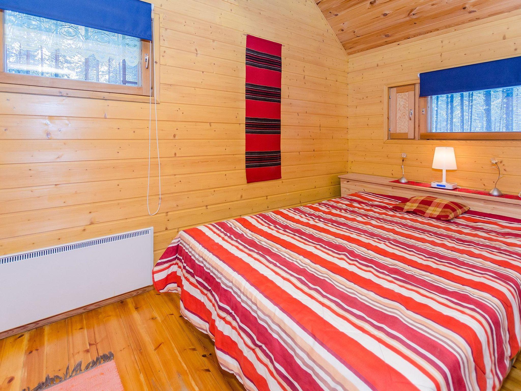 Log cabin 1992, extended in 2000. Living room/kitchen with sofa bed, bedroom with double bed, on the upper floor bedroom (small and low door, height 125 cm) with 120 cm wide bed and sleeping alcove with 80 cm wide bed, low loft (room height 143 cm) with 2 mattresses. Separate stairs to the loft and upper floor. Wood-heated sauna washroom, terrace, balcony.