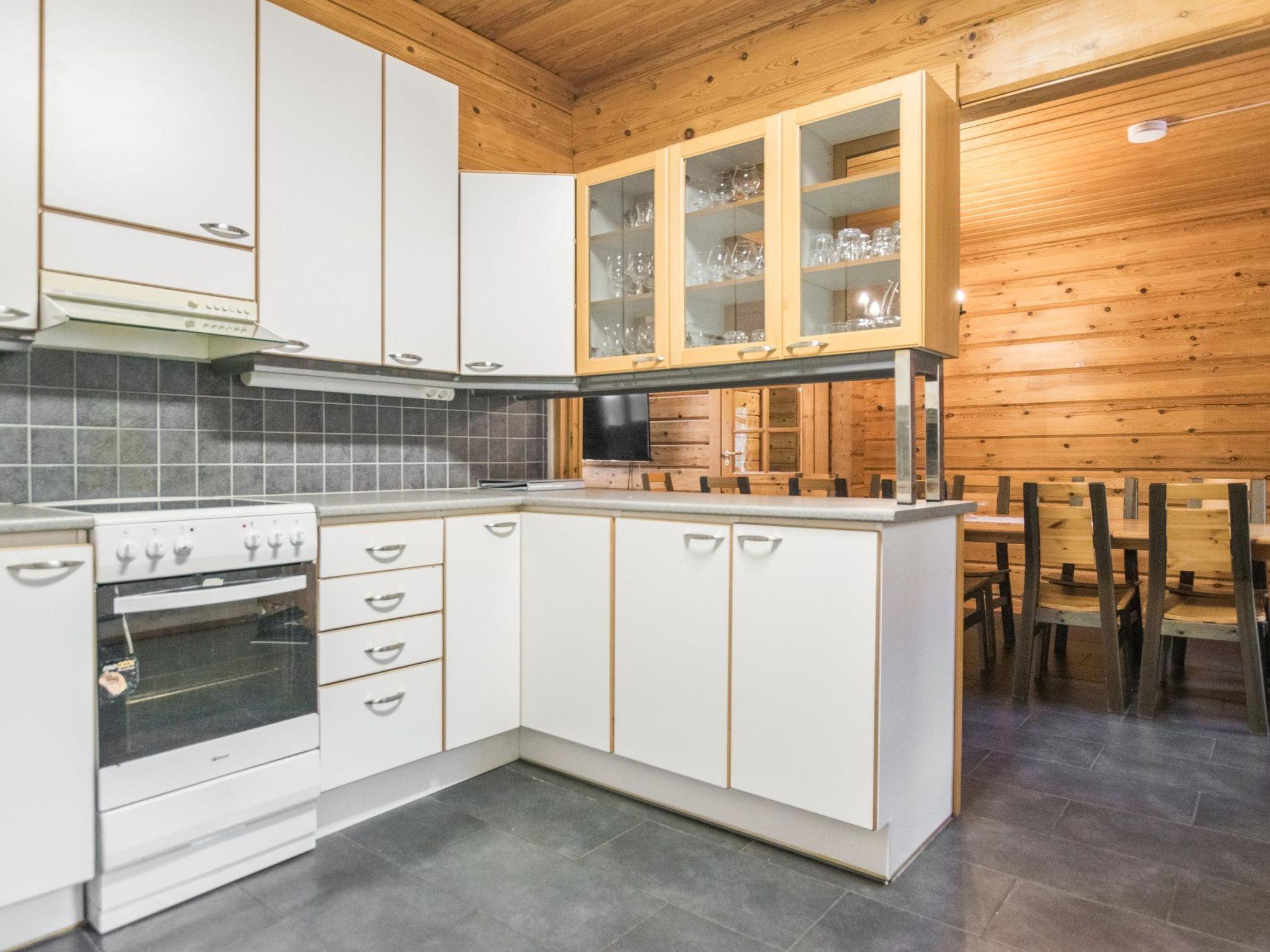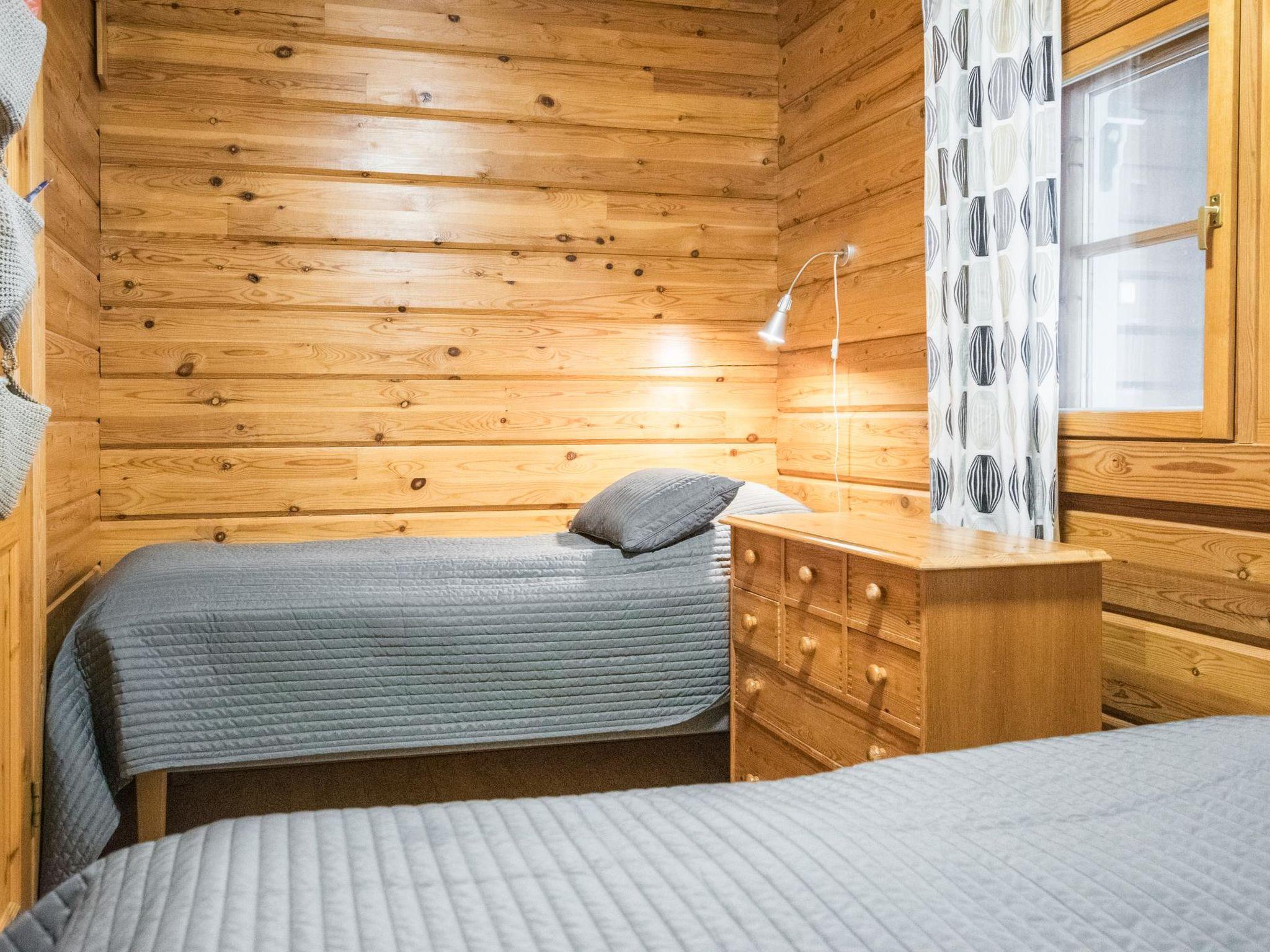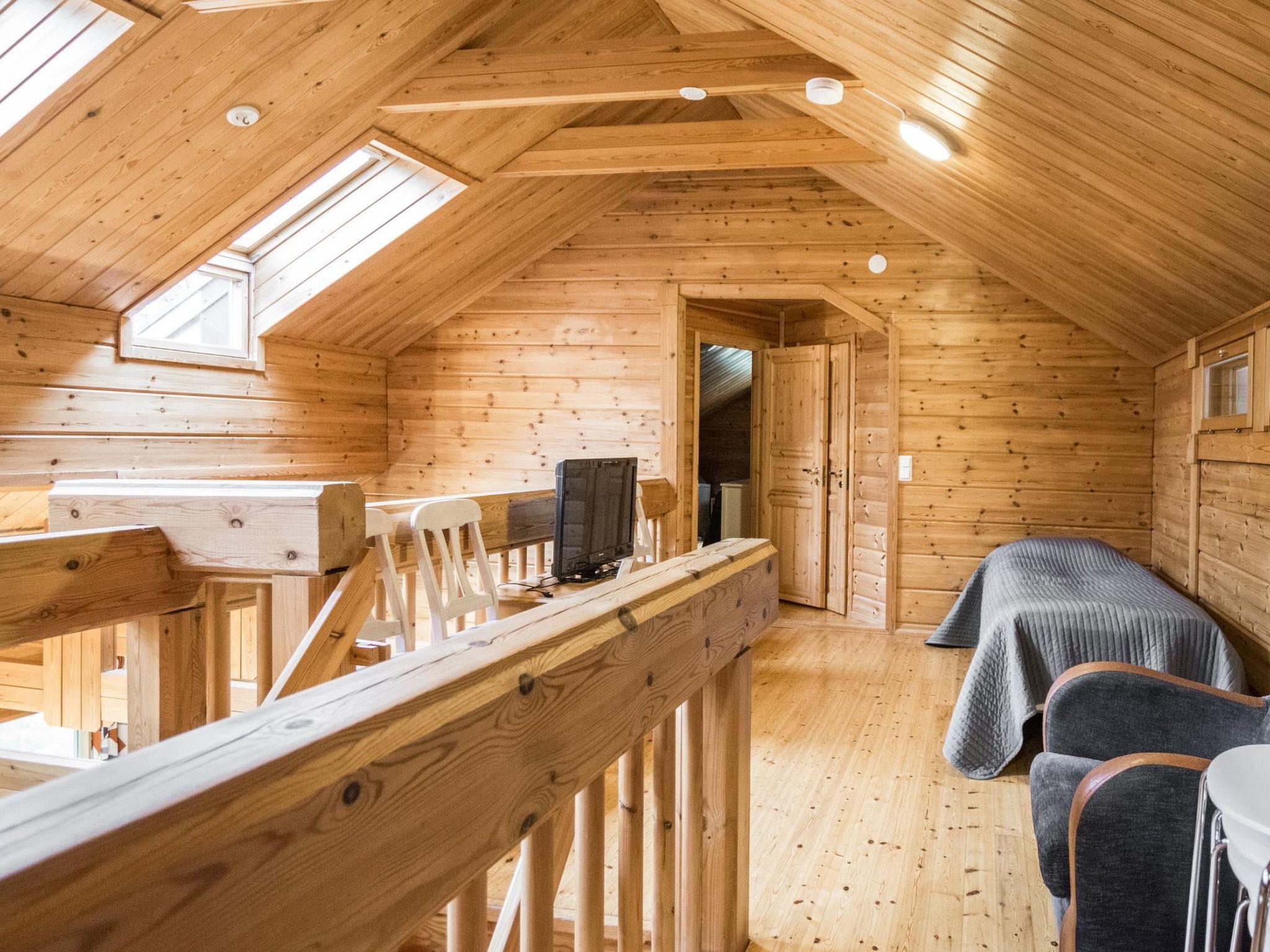 On the ground floor, two bedrooms, each with three beds. On the upper floor, three bedrooms. Upper floor bedroom 1: 2 beds, Bedroom 2: 3 beds, Bedroom 3: 3 beds. Additionally, one bed in the upper floor hall. The cabin has a total of 15 beds.