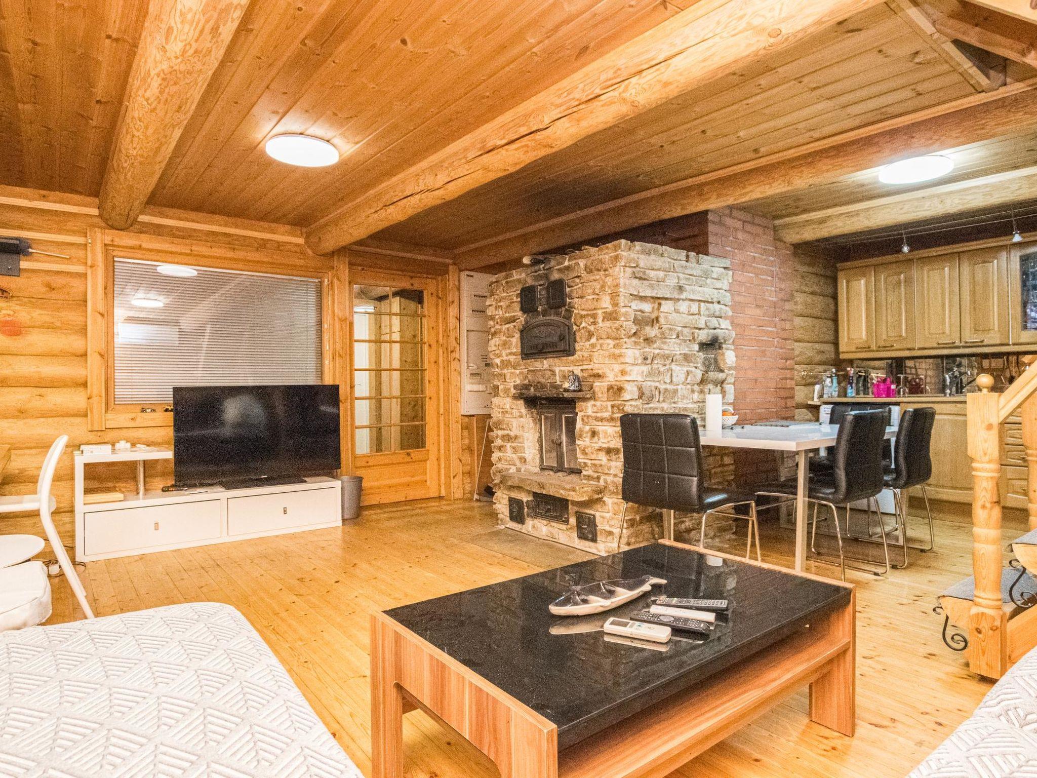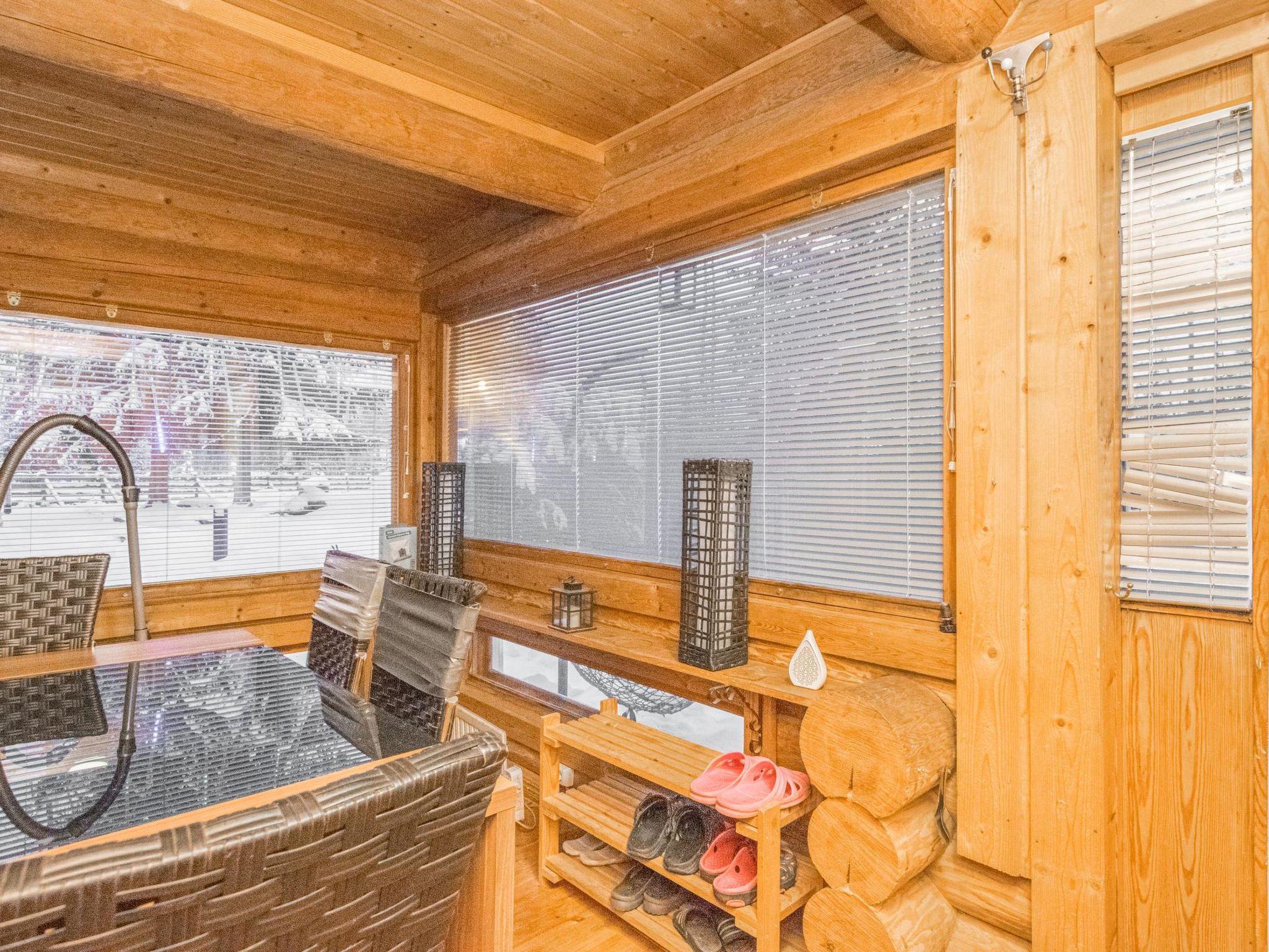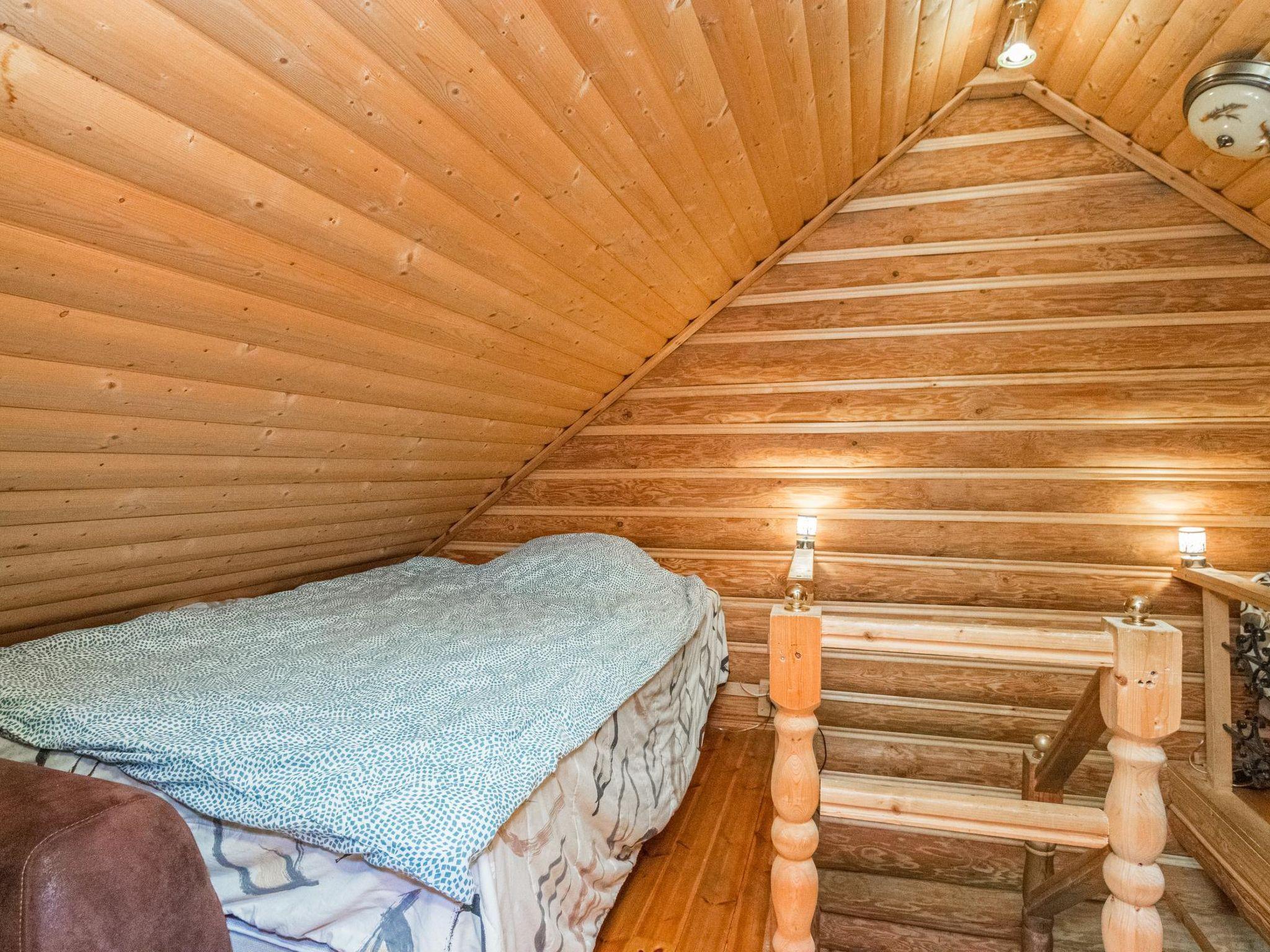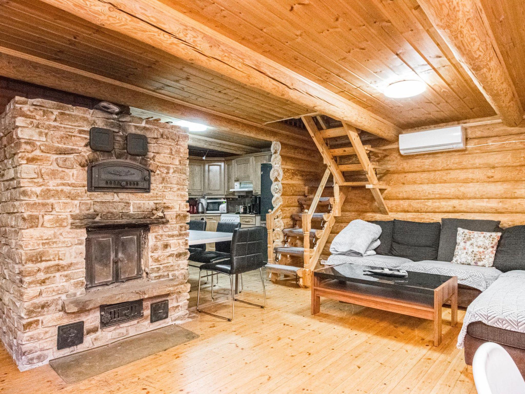 Round log cabin 1991, bathroom facilities renovated in 2014. The cabin features an open-plan kitchen-living room on the ground floor, a glazed terrace, a bathroom with a WC and a shower, hydro massage bath (freely available), as well as an electric sauna.