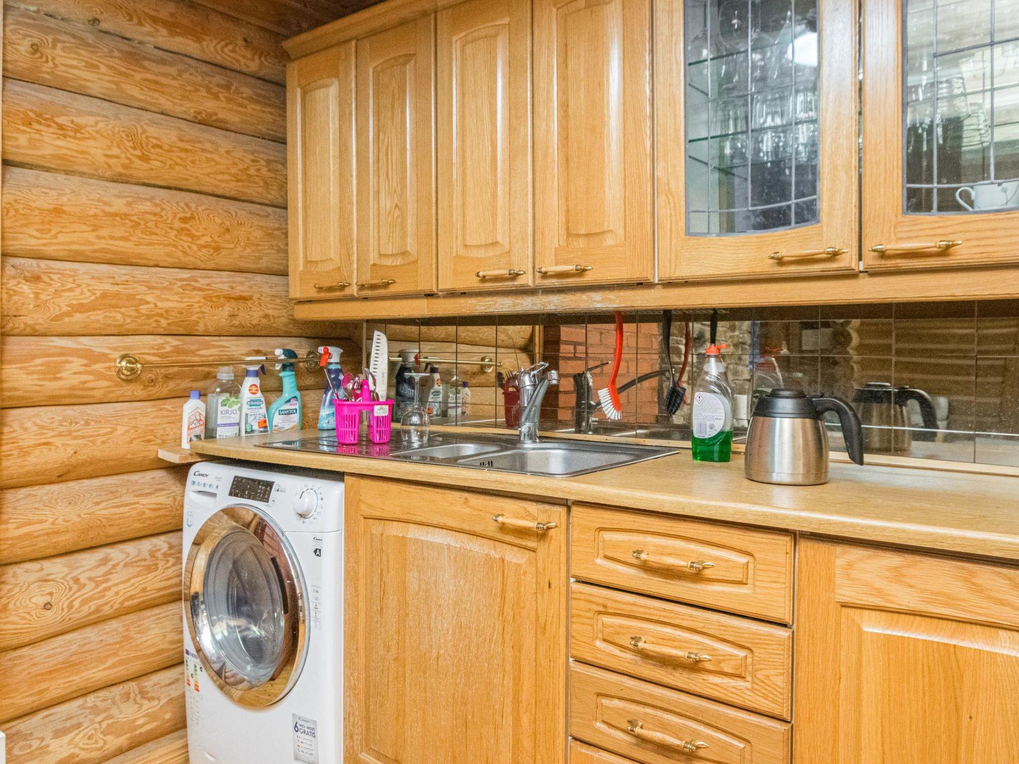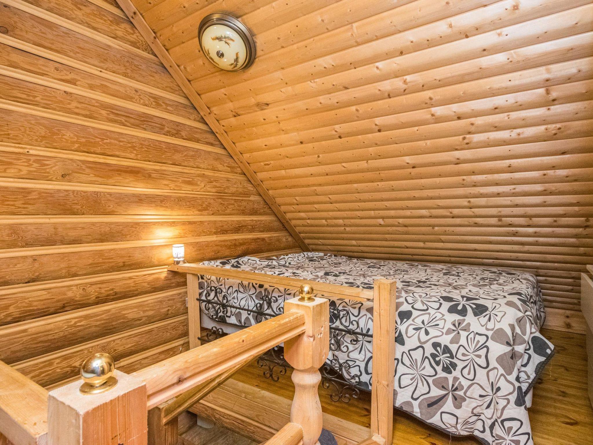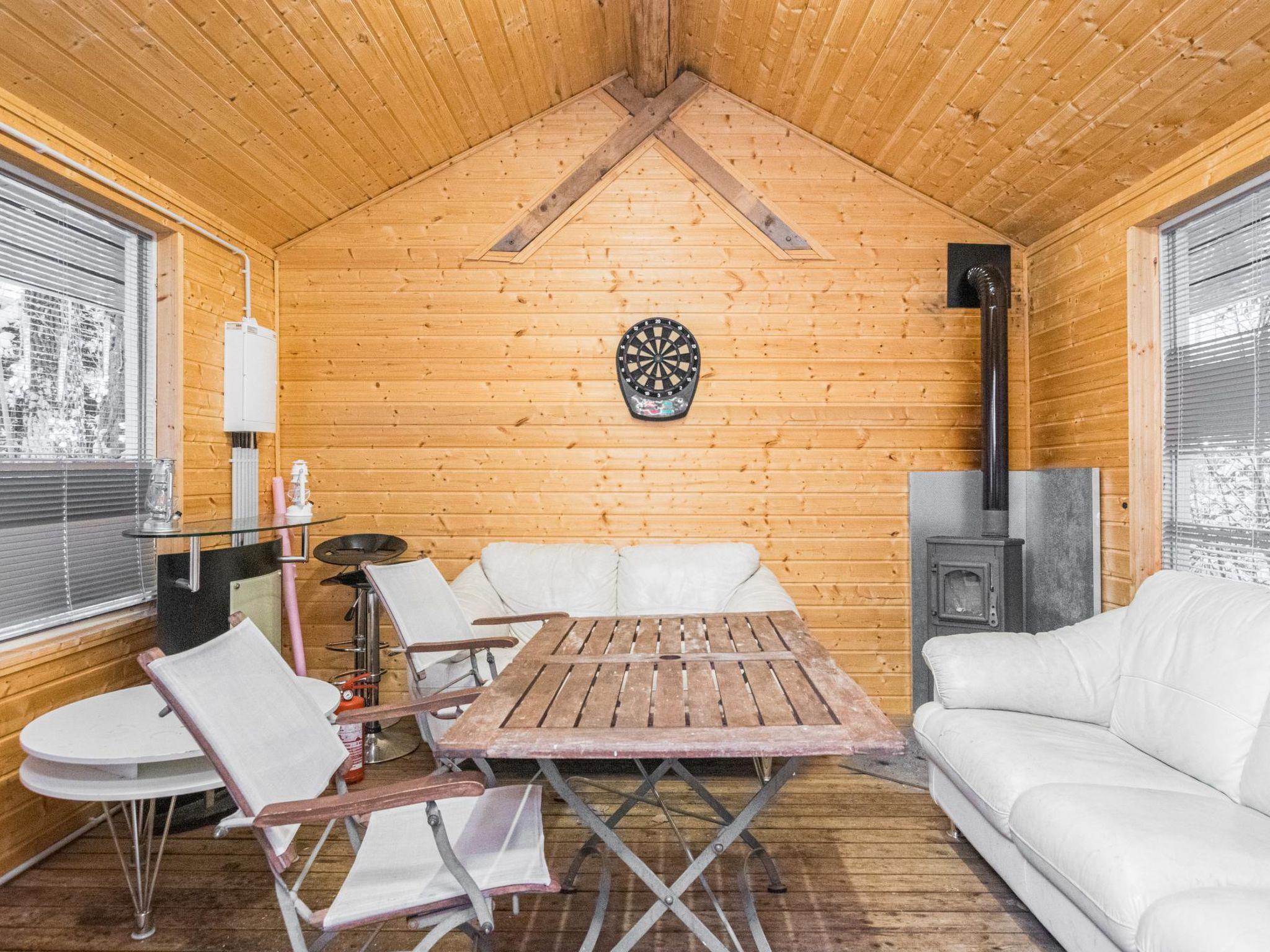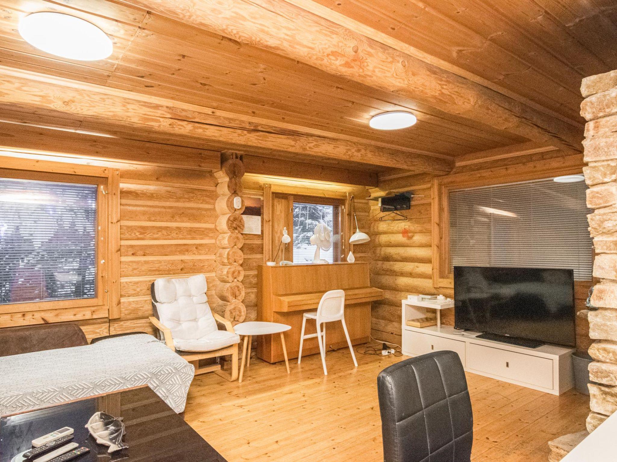 Round log cabin 1991, bathroom facilities renovated in 2014. The cabin features an open-plan kitchen-living room on the ground floor, a glazed terrace, a bathroom with a WC and a shower, hydro massage bath (freely available), as well as an electric sauna.