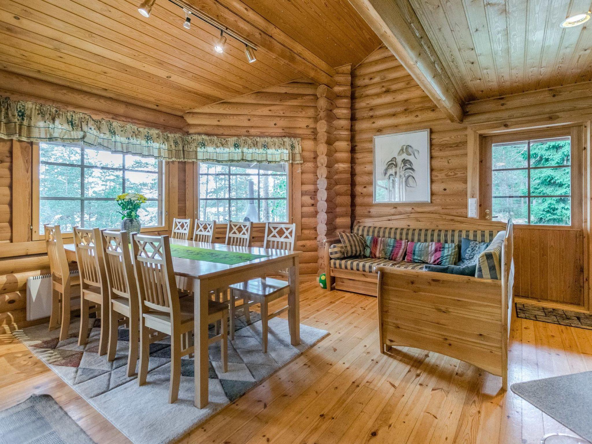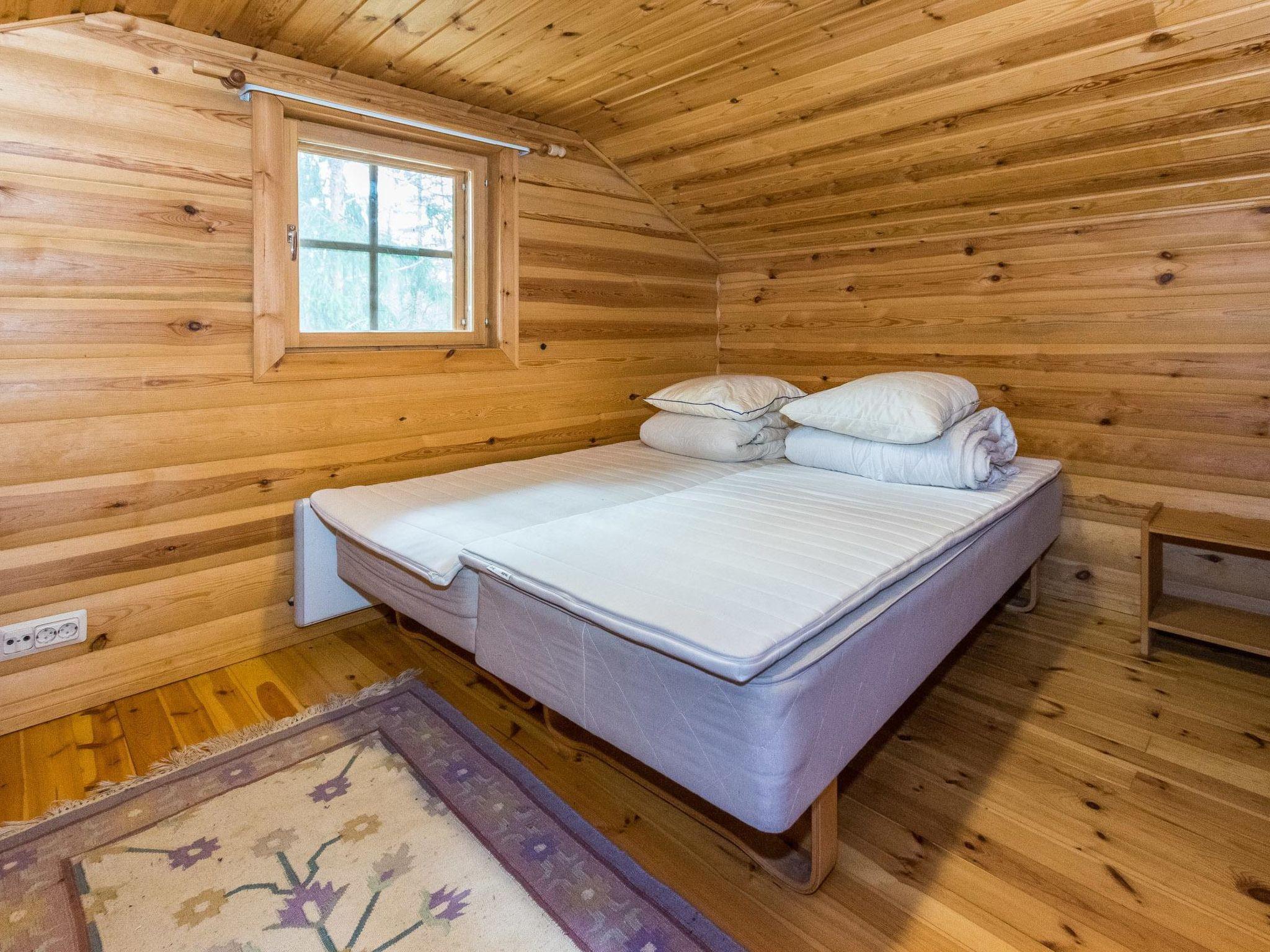 60 km nördlich von Turku, See Elijärvi 30 m (Länge 5.5 km, Breite 400 m), flacher und weicher sandiger Fels-/Schlammgrund, eigenes Boot. Block-Ferienhaus, Baujahr 1999, Küche, Wohnzimmer mit Couch, Schlafzimmer mit Doppelbett, Schlafzimmer mit Etagenbett, Nische mit 2 Zustellbetten, Schlafboden-Schlafzimmer mit 2 Betten und Diele mit 2 Betten, Komposttoilette, Handbrause, grosse und offene Veranda. Ufersauna (25 m²) mit Kaminzimmer, Saunadusche, Warm- und Kaltwasserleitung, elektr. Licht und Heizung. Robustes Blockferienhaus auf felsigem Grundstück. Steiler Abhang zum Ufer und zur Ufersauna. Felsiger und bewaldeter Hof. Duschraum nur im Saunagebäude. Aussenbordmotor, Kanus und SUP-Board können vom Eigentümer gemietet werden. Rauchsauna im Hof des Eigentümers (1.5 km) € 180 und Badewanne am Teich € 150. Das Krebsenfischen ist das ganze Jahr über im Teich in der Nähe möglich. Der Eigentümer verkauft auch Krabben. Nationalpark Vaskijärvi 3 km, Naturlehrpfade Kuhankuono 10 km, Tanzhalle Valasranta 10 km.