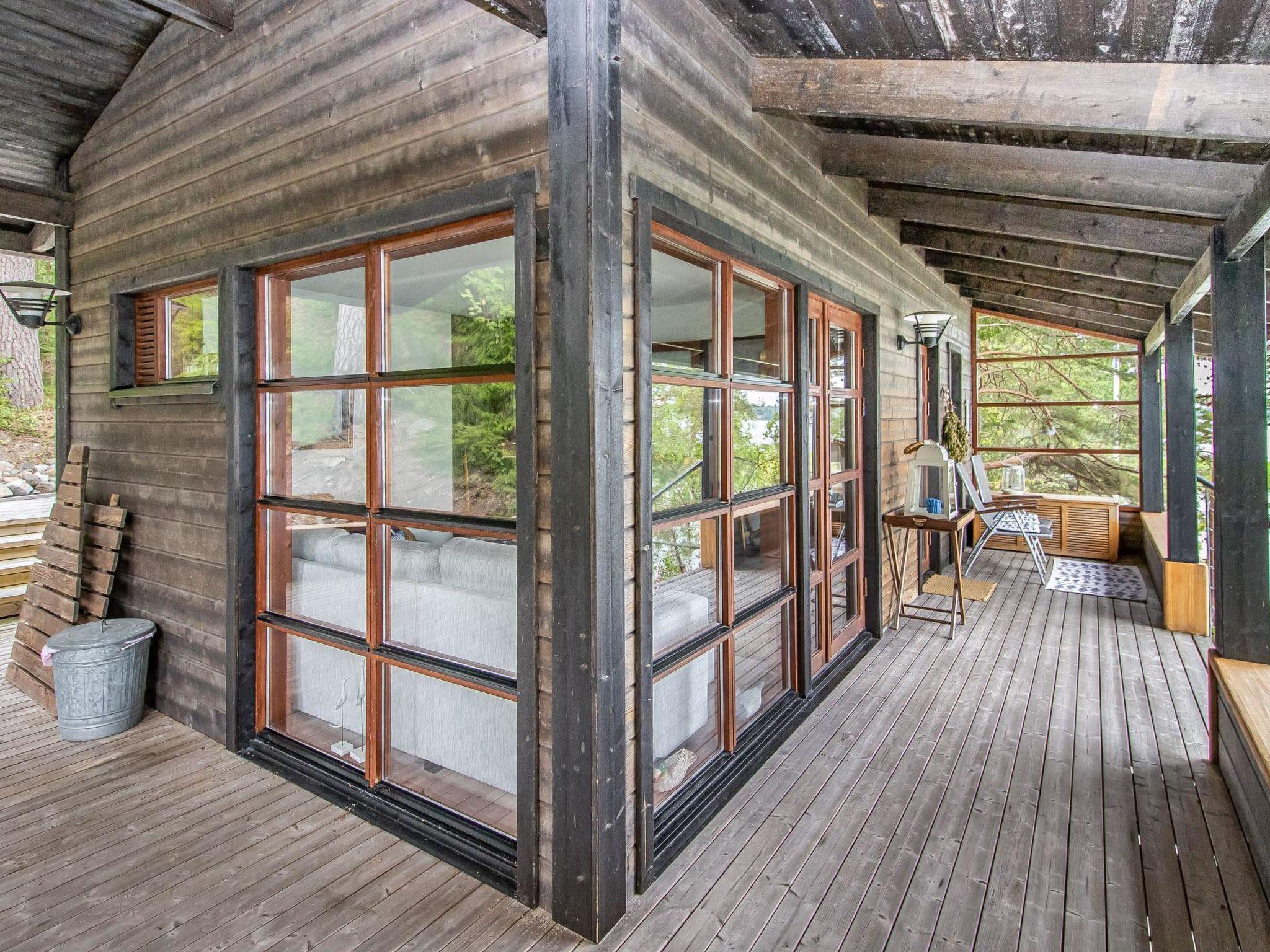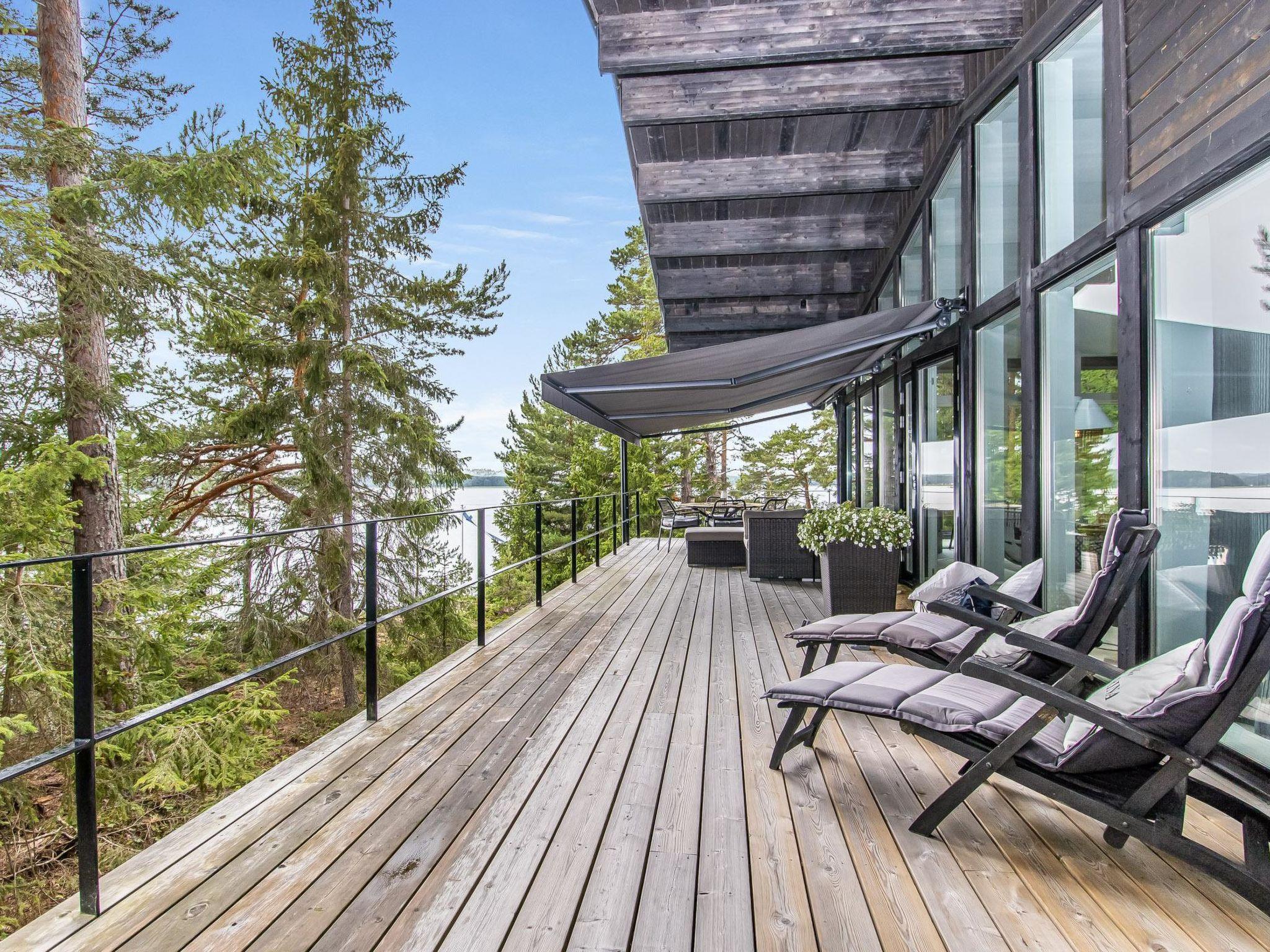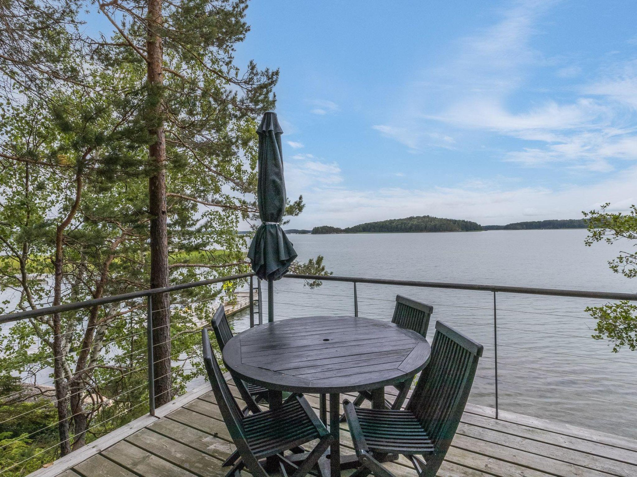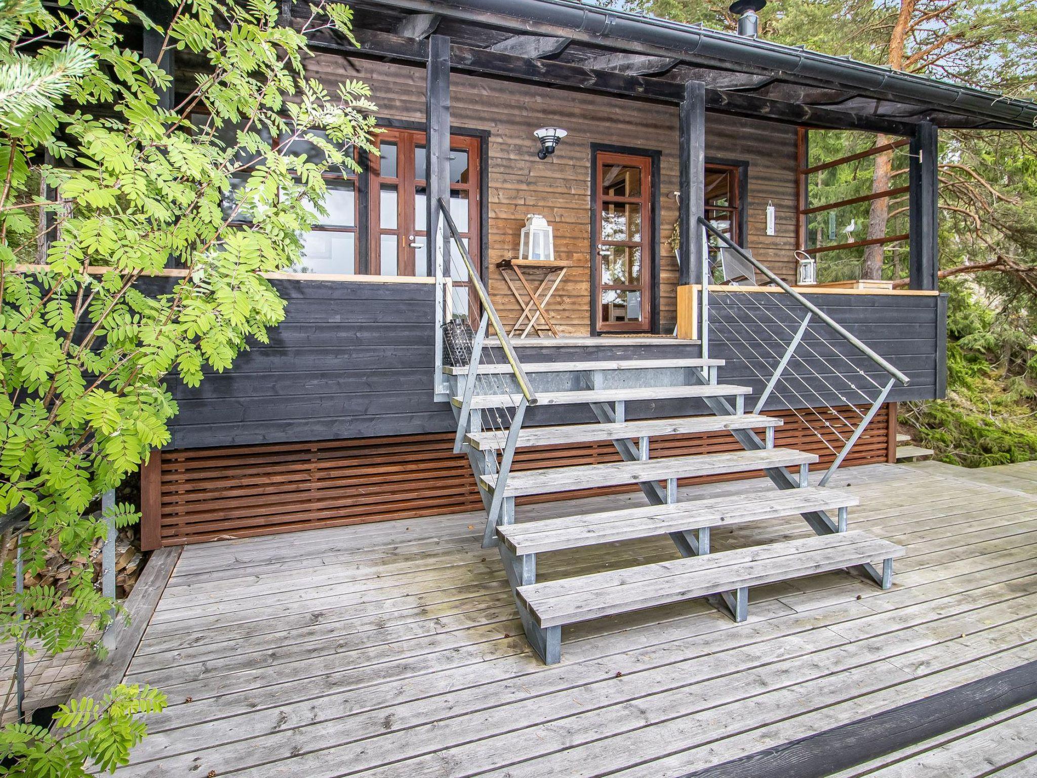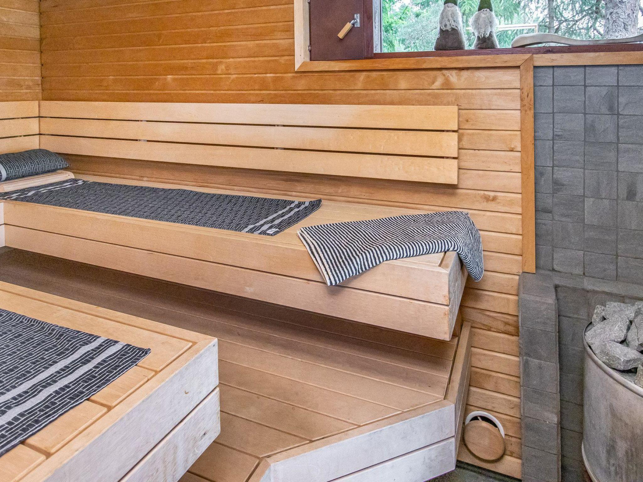The partially covered terraces include an awning over the seating and dining area, along with a gas grill. The lakeside sauna building has a living area with a sofa bed (160cm), a wood-heated sauna, running water, and a heated water vessel for bathing. The sauna has its own furnished terrace facing the sea. The stairs to the rocky shore are quite steep. The best access to swimming is from the pier.
