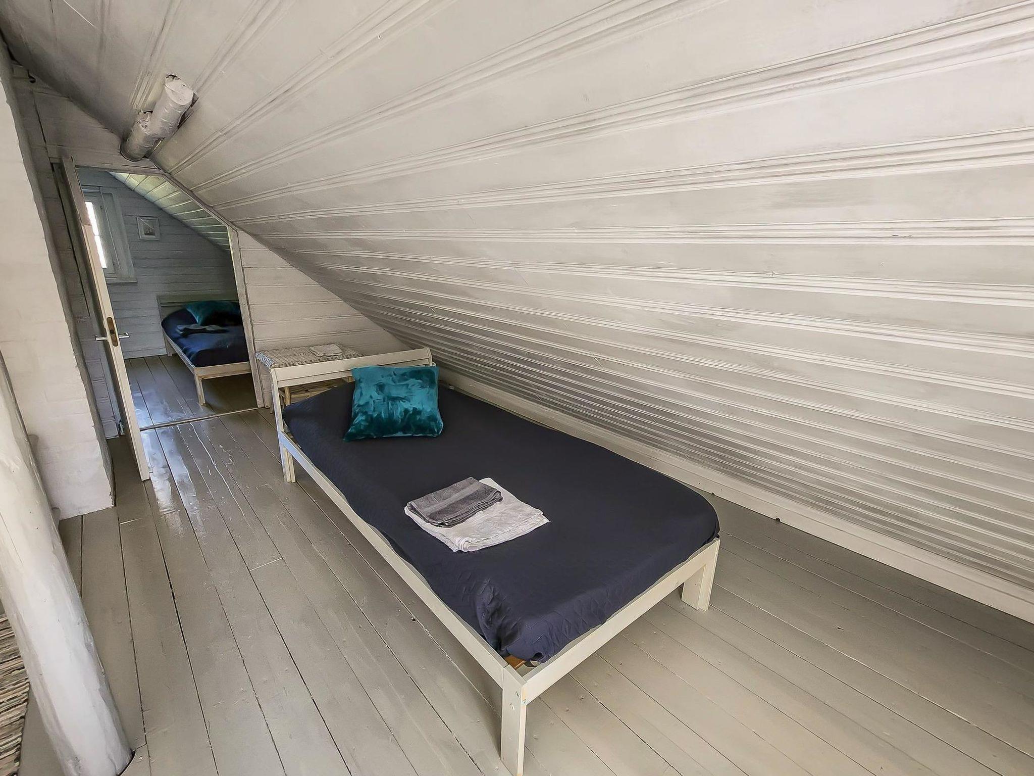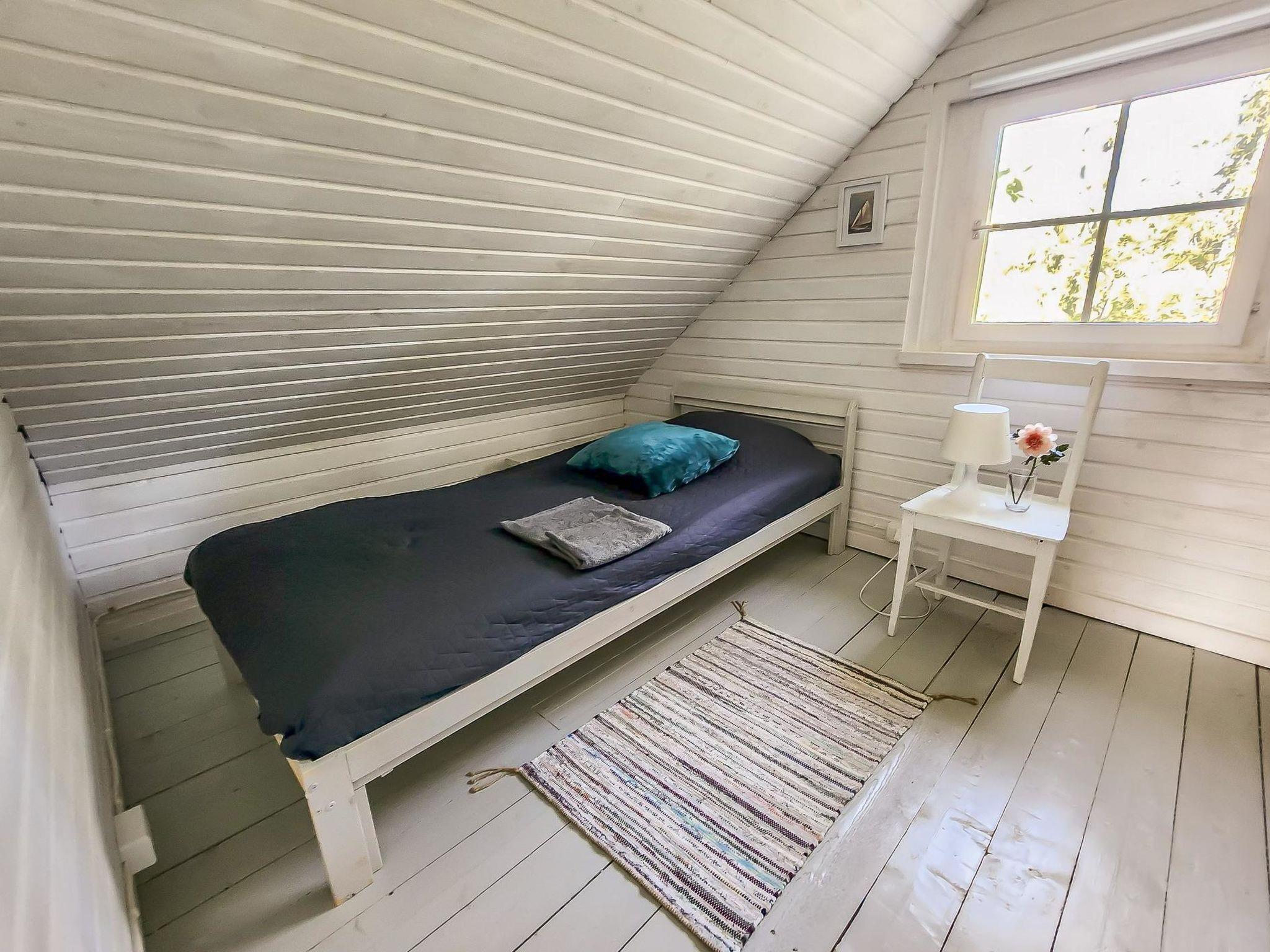 An atmospheric log cabin with a fireplace that you can enjoy in cooler weather. The kitchen has a gas stove and oven, as well as other cooking equipment. From the living room you can access a large glass-covered terrace, where you can enjoy your morning coffee even in the rain. Upstairs, the cabin has sleeping accommodations for four people in separate beds. The beds are 200 cm x 80 cm. In connection with the cabin, there is a large old-fashioned wood-heated sauna with washing facilities.