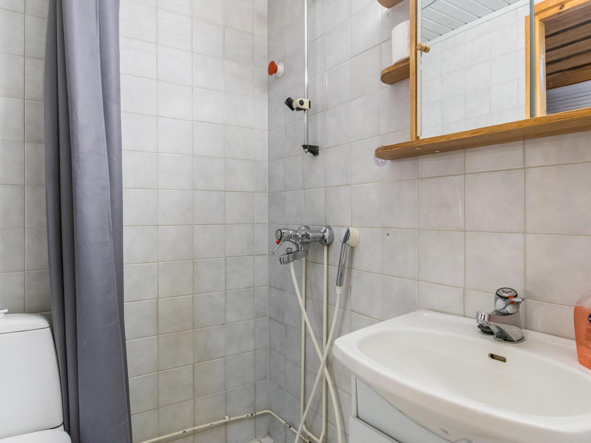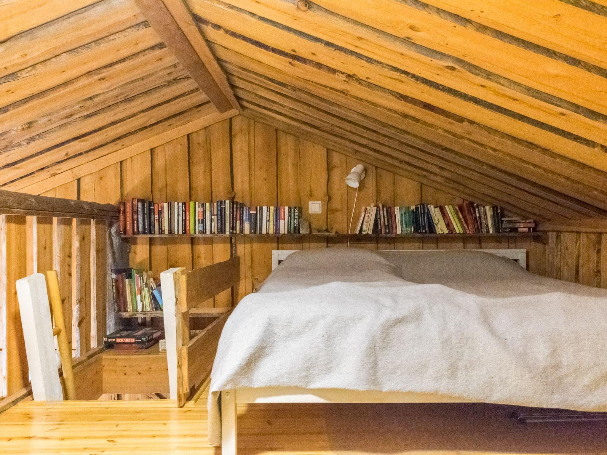 Silverlog row house apartment built in 1990. Living room, kitchen, bedroom bunked bed (bottom 160cm, upper bed 80cm), sleeping loft (to which steep stairs) 160cm double bed, washroom, sauna (elec. stove). There is a small book and DVD library. Separate food freezer is in the sleeping loft upstairs.