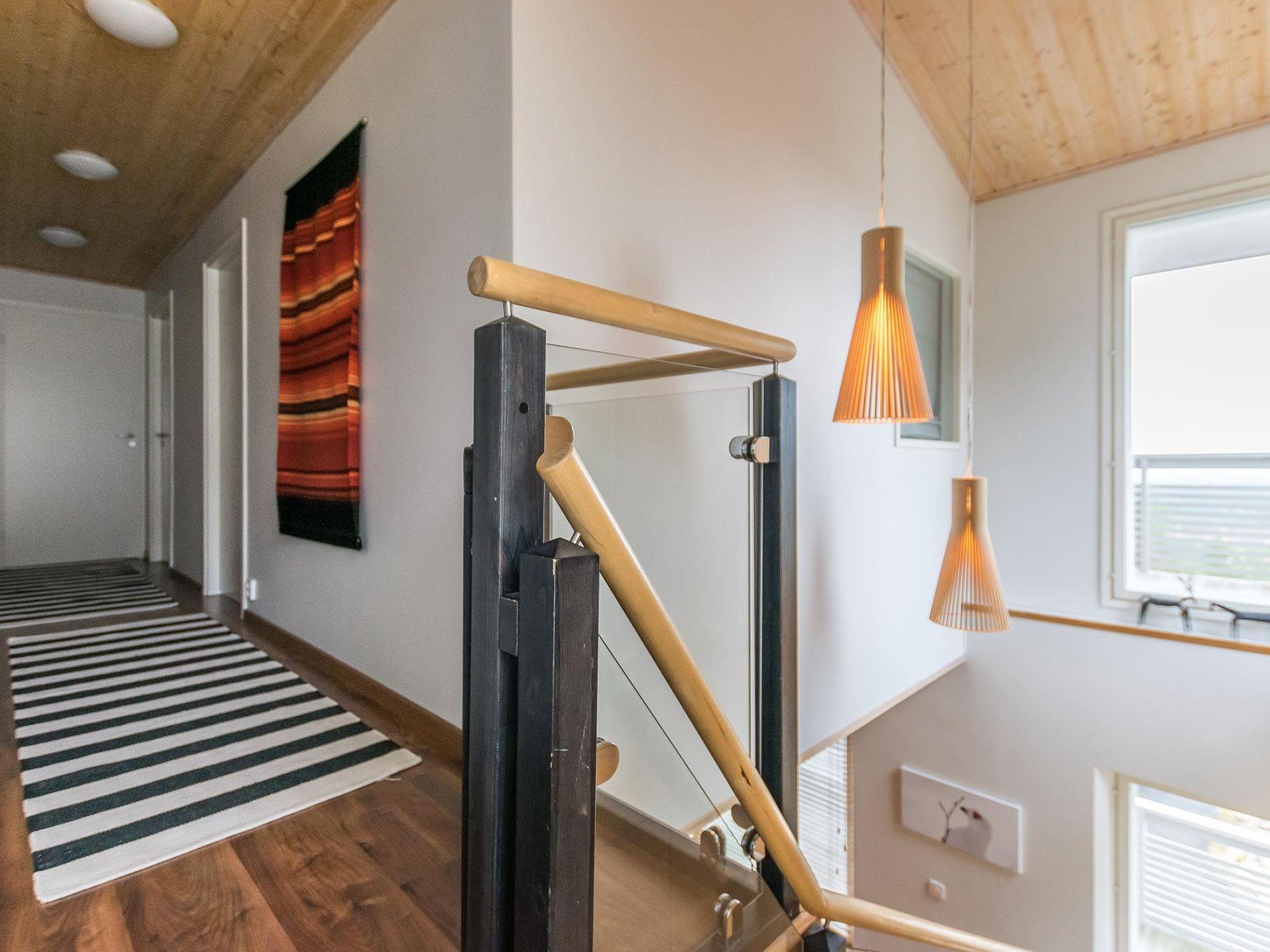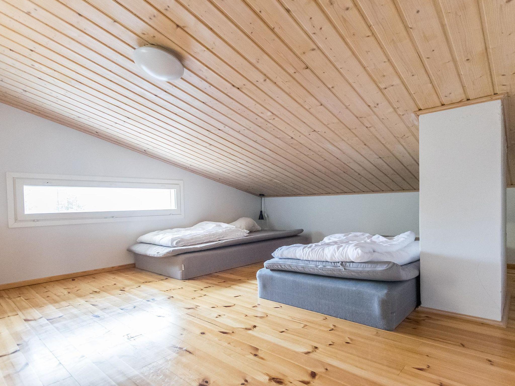 Upstairs there is a toilet and shower, two bedrooms with two separate beds, one bedroom with bunk bed (lower bed 140*200cm, upper bed 90*200cm) and one bedroom with bunk bed and separate bed.