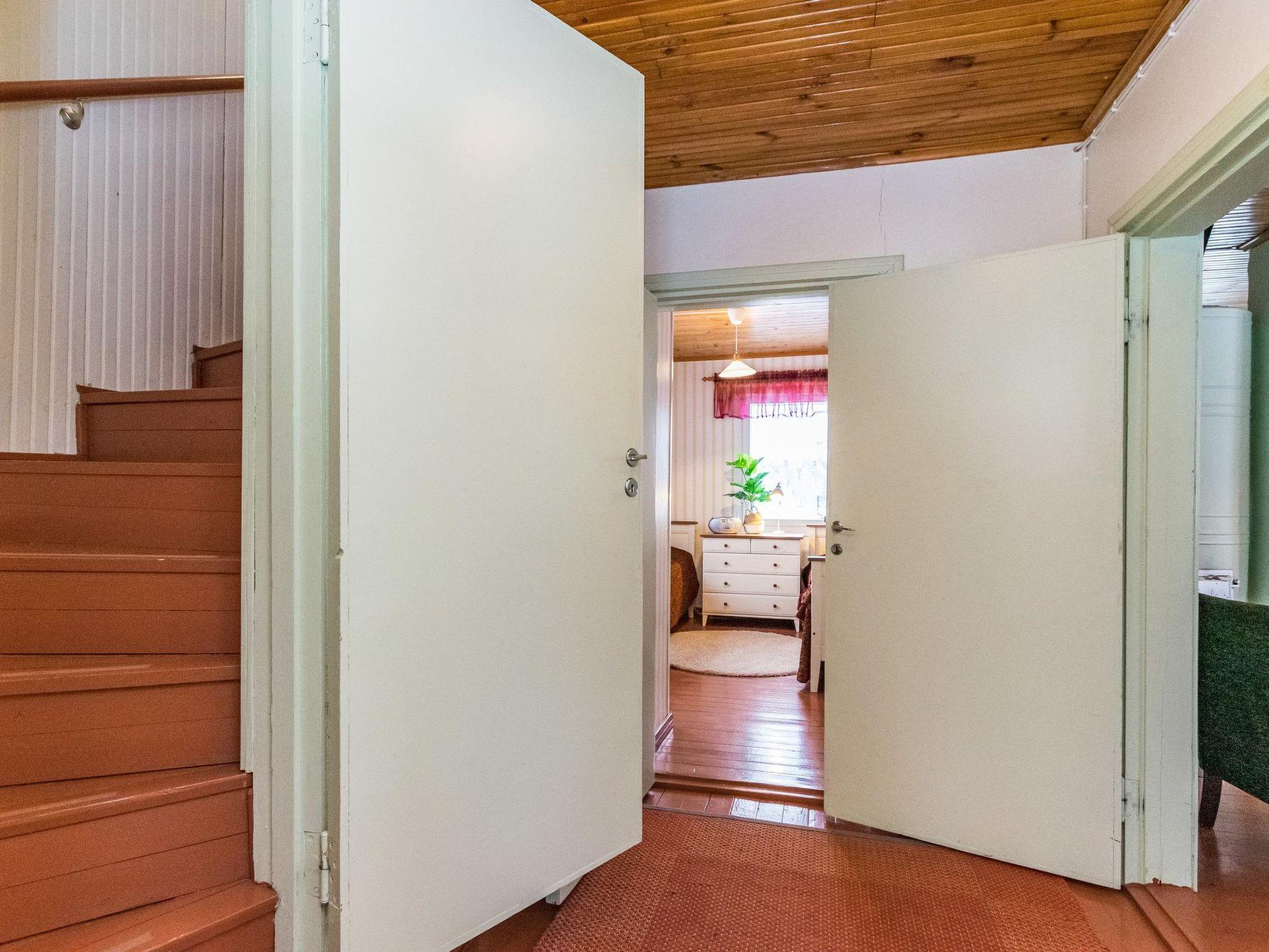 Wooden cabin 1955, renovated in 2008, living room/kitchen (22 m²) bedroom (9 m²) with two beds, washroom with shower and WC, lobby. Air source heat pump, open terrace.