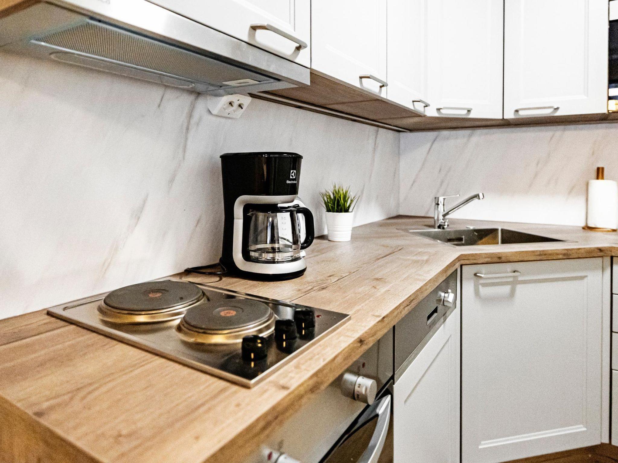 Sauna facilities shared by nine apartments. Sauna facilities includes dressing room, washroom, electric sauna stove, cooling terrace and washing machine. Sauna sessions (included in the price) can be booked at the reception.