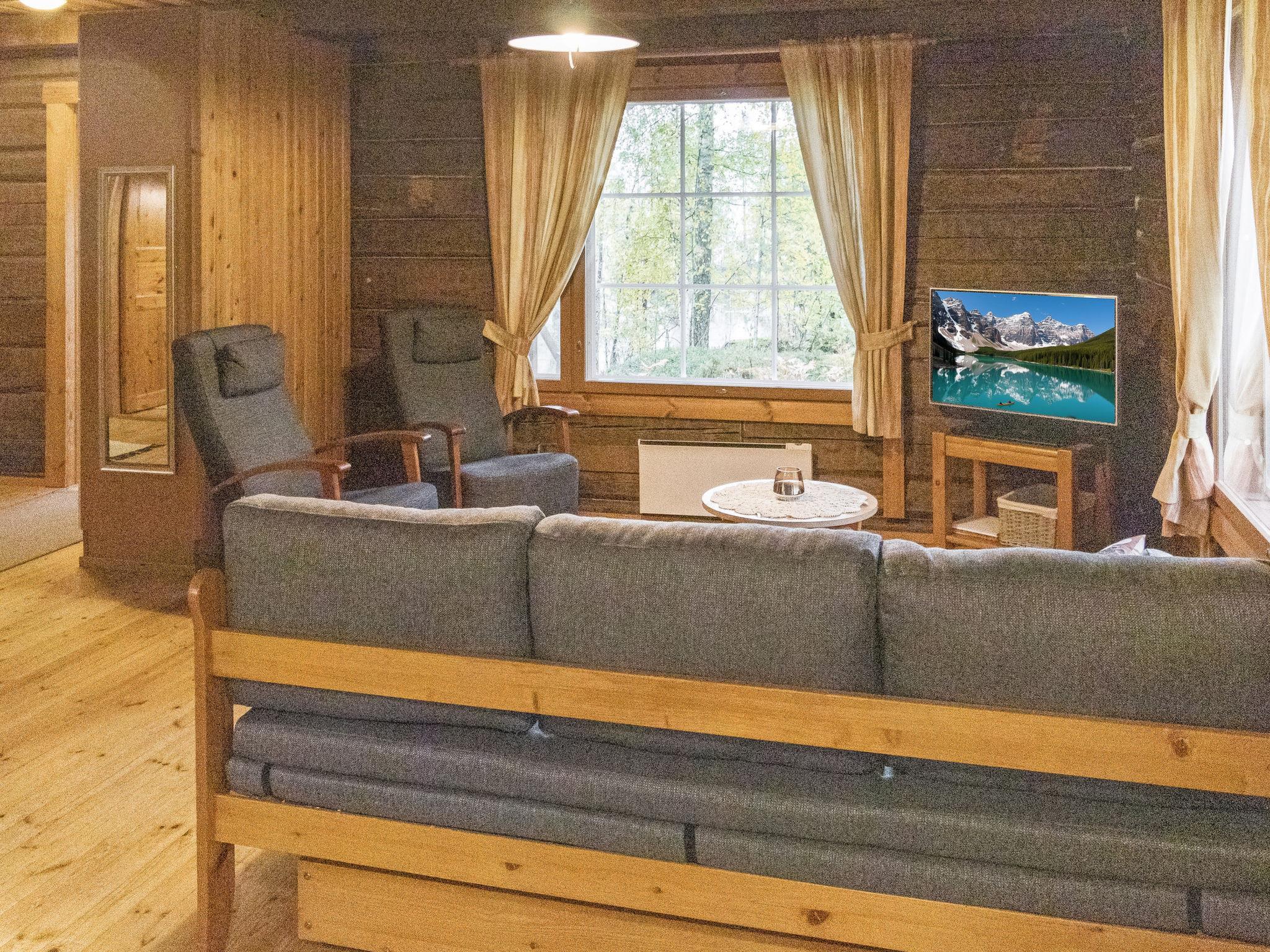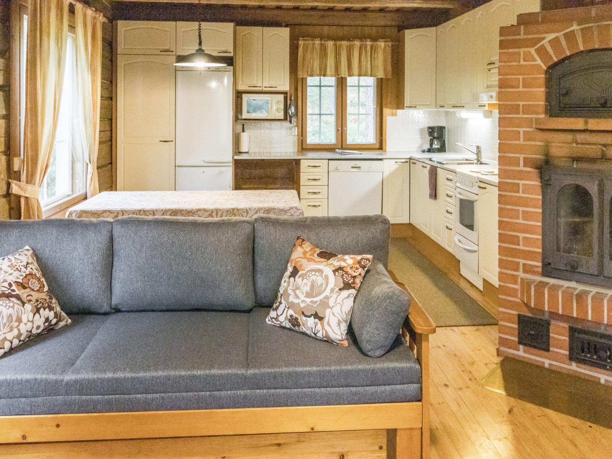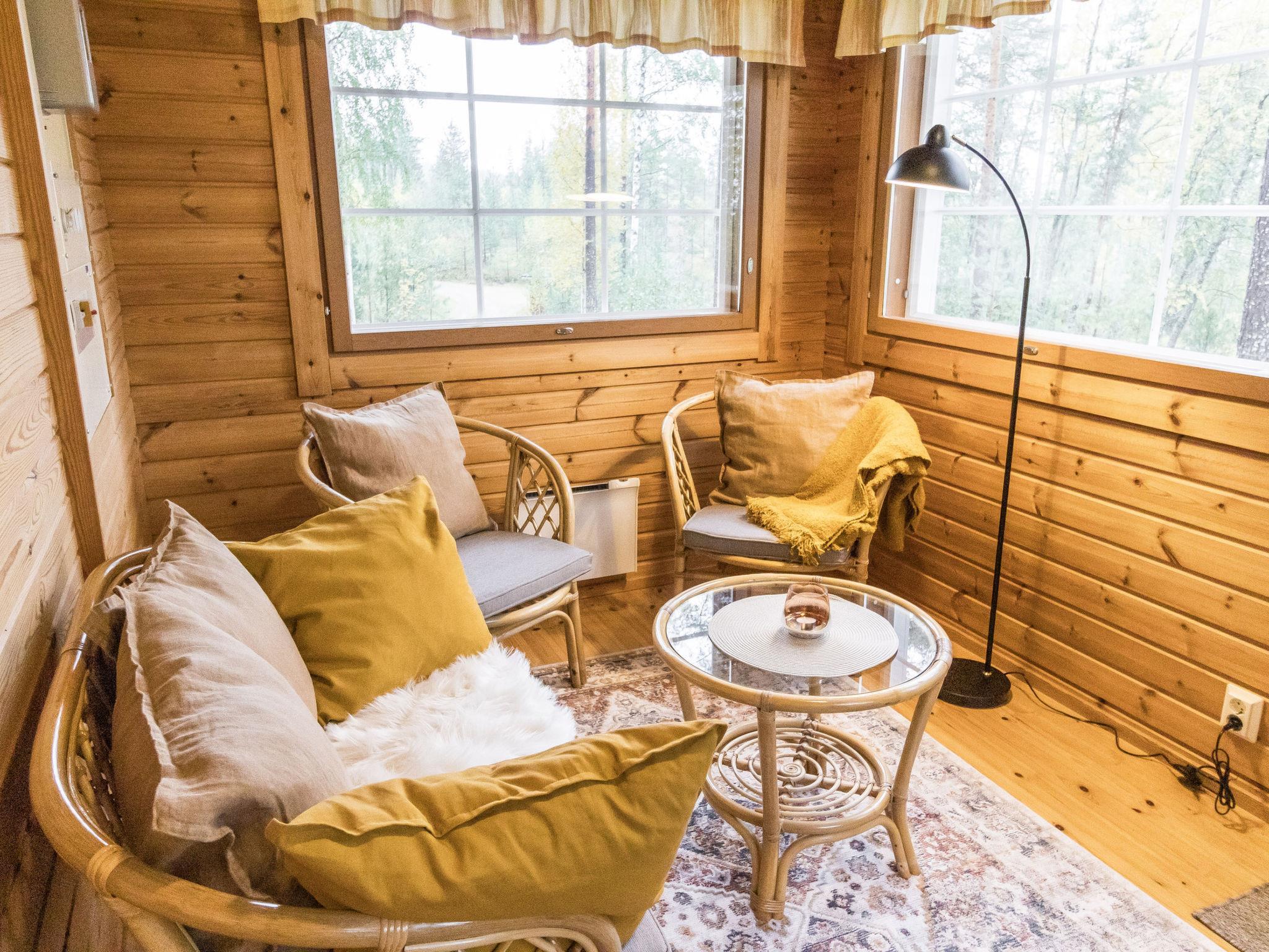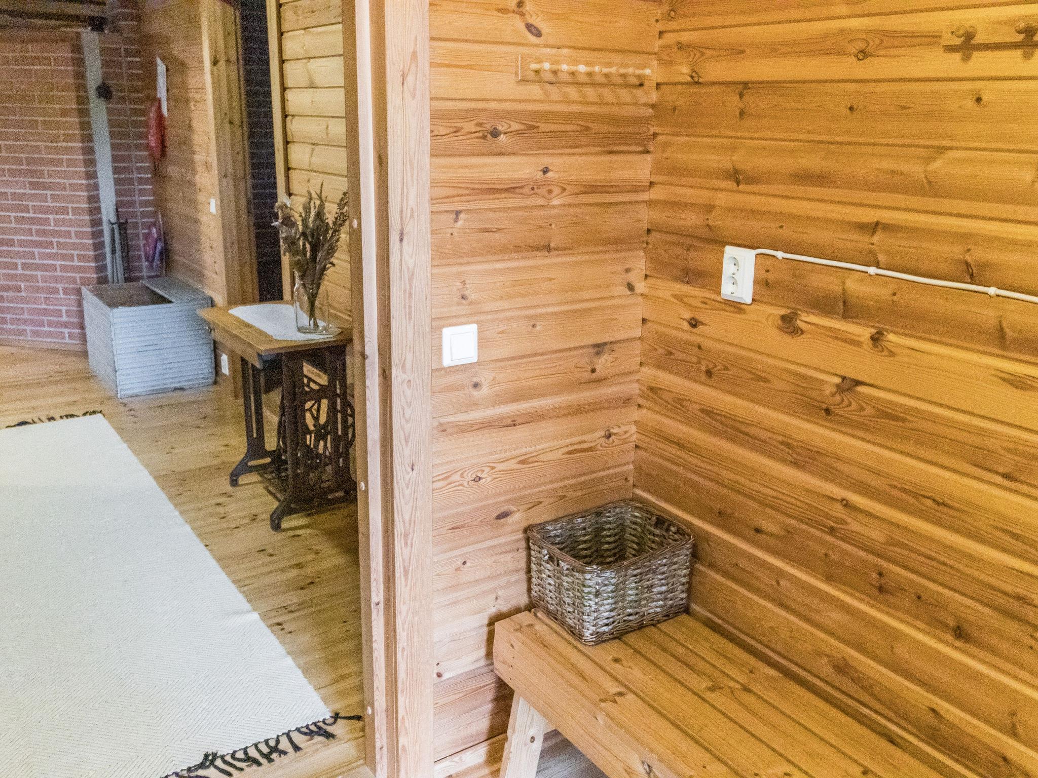 Wooden cabin with boarded outer walls. Part of the structure is made from old hand-carved logs, creating a cozy atmosphere inside. The cabin features a spacious living room/kitchen, two bedrooms—one with a fixed double bed and the other with two separate single beds for two people. In addition to a separate lakeside sauna, the cabin has an electric sauna, a bathroom with a shower, a dressing room, and a separate WC. There's also a charming living area on a glazed porch connected to a second entrance. The sofa bed in the living area can be used as an extra bed.