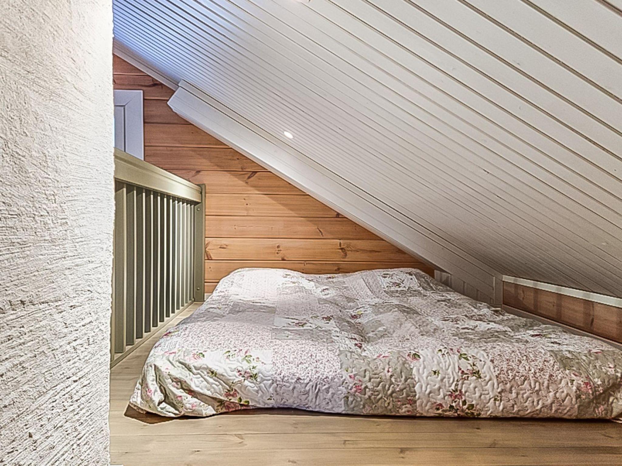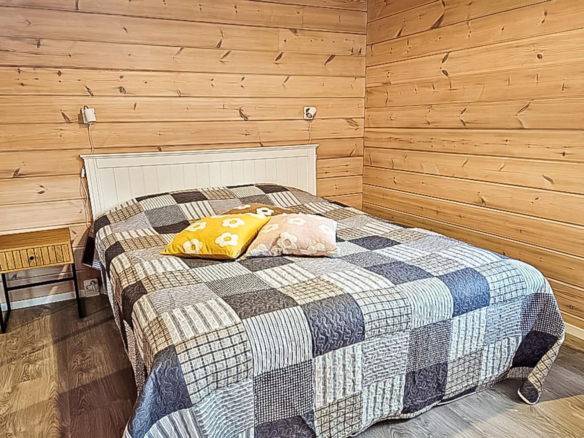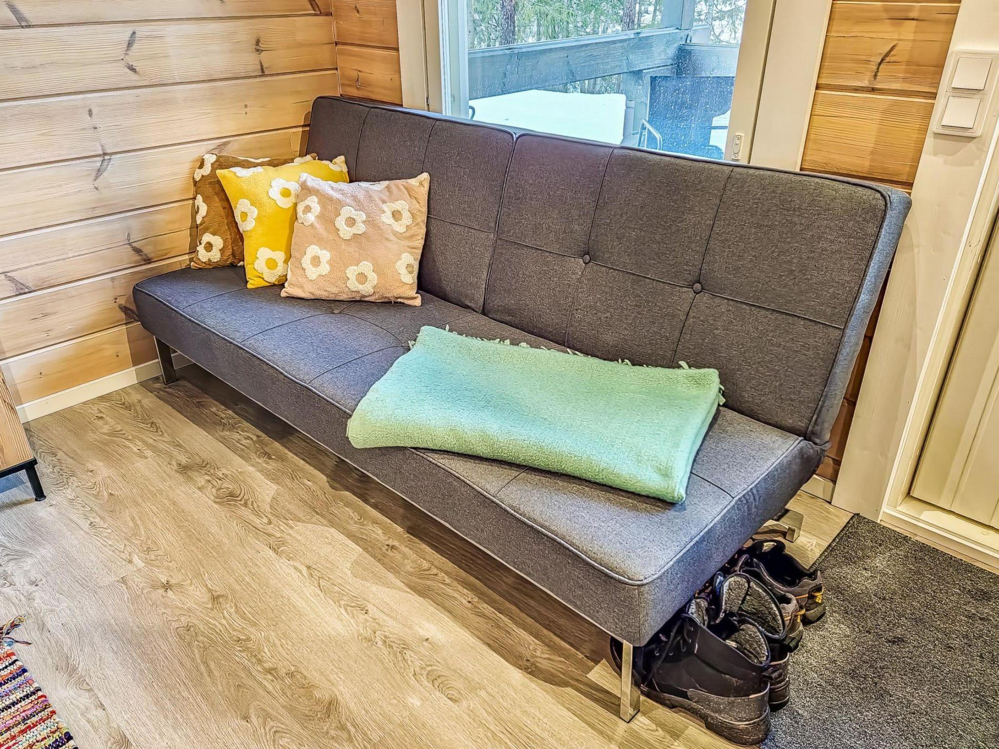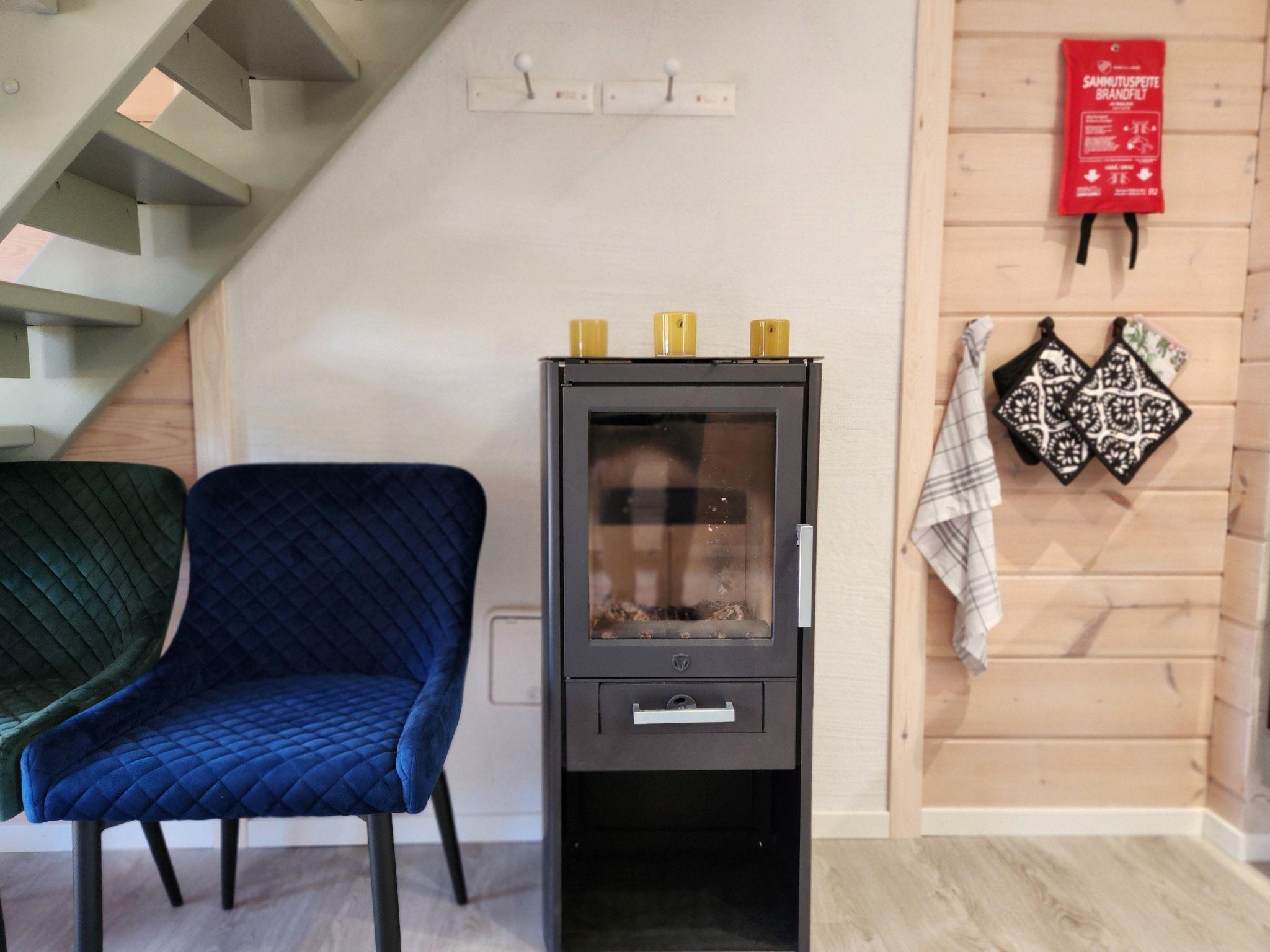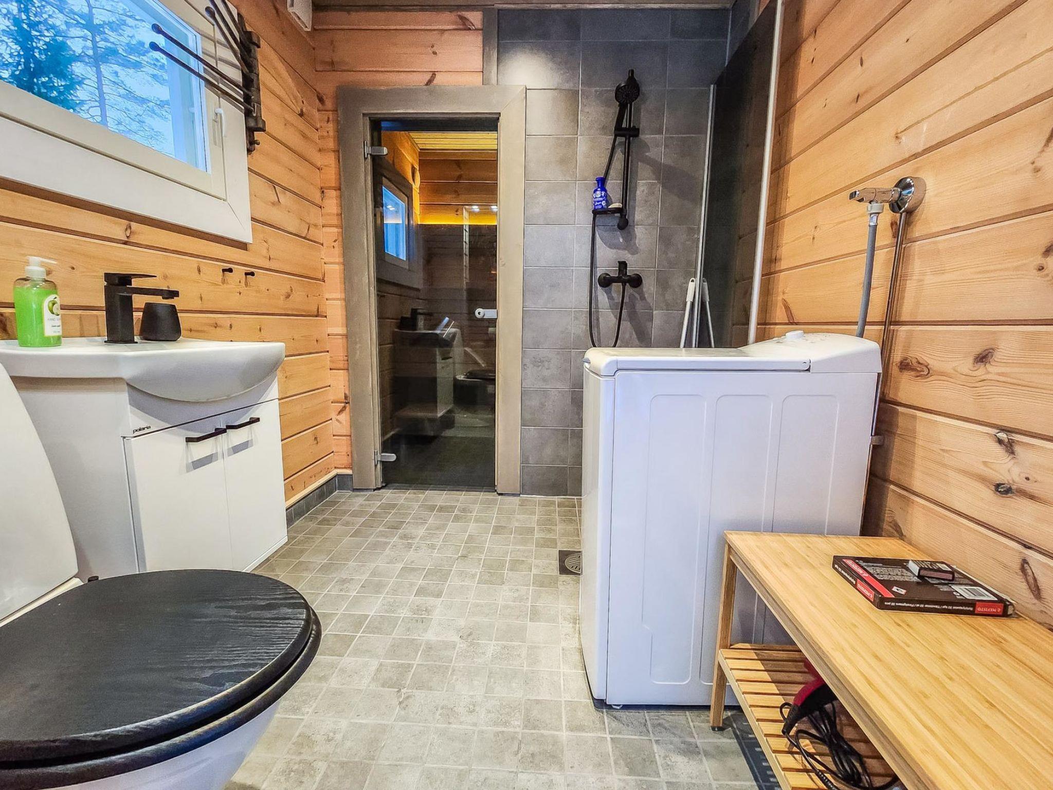 The cabin features two bedrooms, one on the ground floor and another on the upper floor, both furnished with double beds. The living room/kitchen includes a sofa bed that accommodates two guests. Additionally, the loft has a 140 cm wide mattress. However, the cabin is rented out for a maximum of 6 guests. The wood-heated sauna provides a soothing and relaxing steam experience. The dressing room includes a WC and a washing machine.