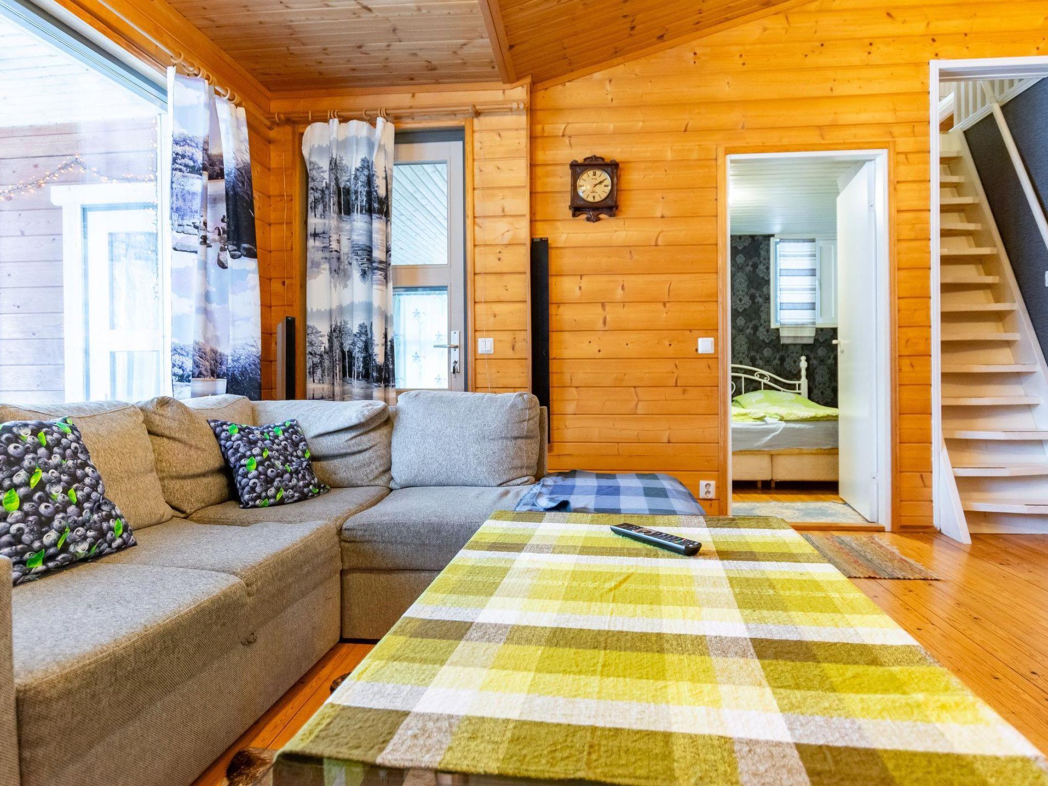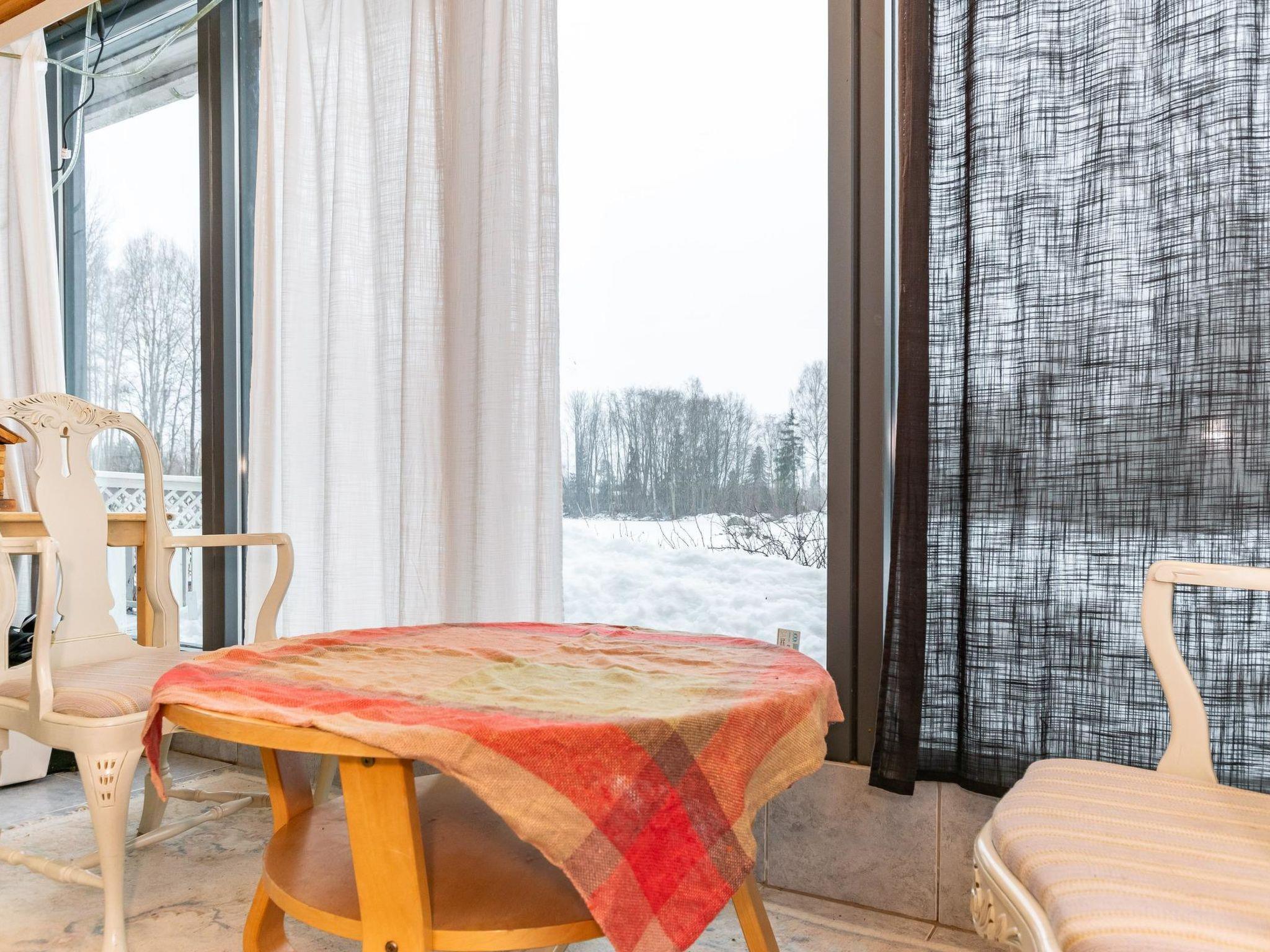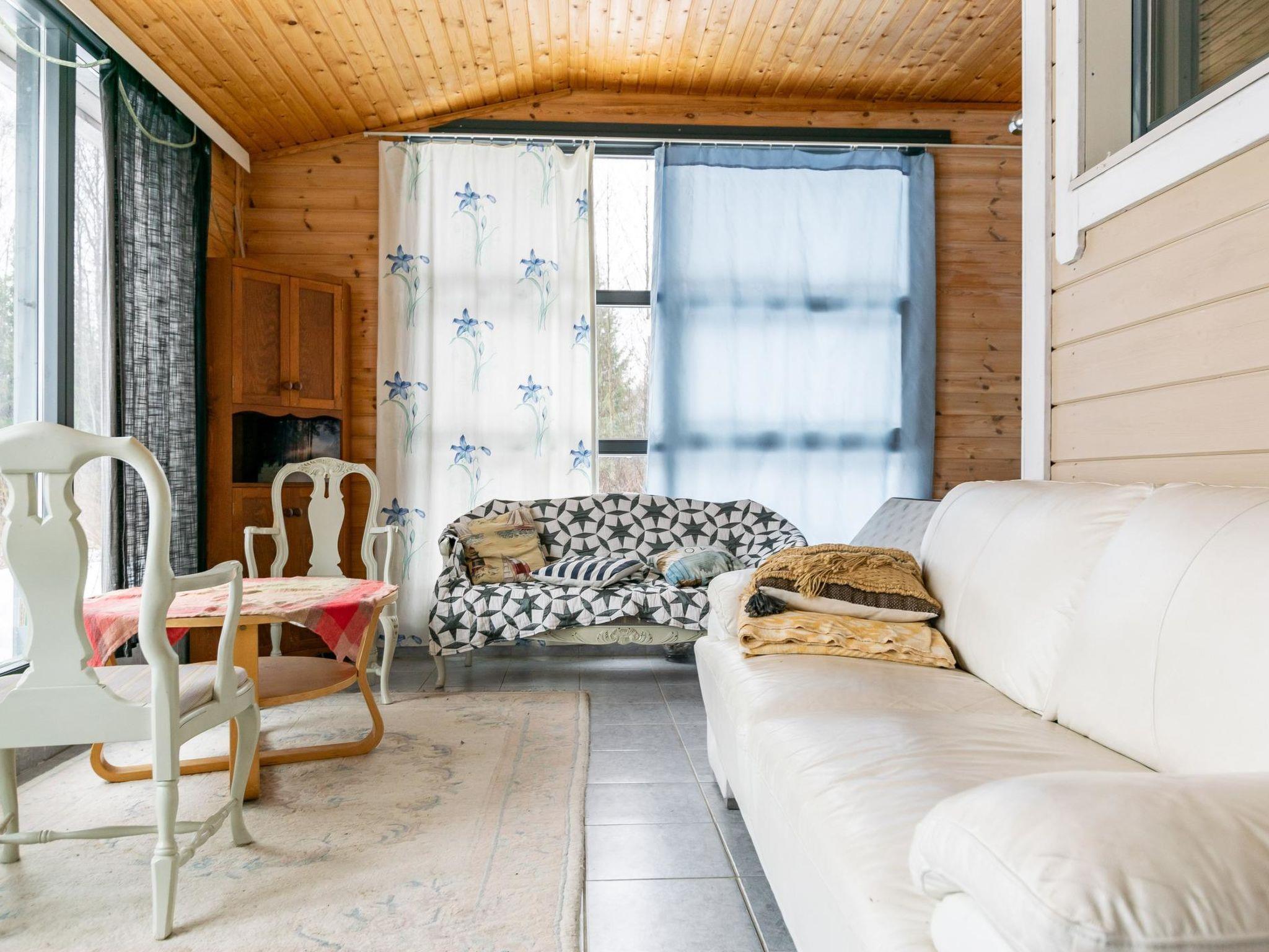 Washroom with a shower and access to the terrace. The sauna features a wood-heated sauna stove. Separate WC/utility room with a washing machine. The glazed porch has a sofa and chairs, as well as an additional 120x200 cm bed. This bed serves as an optional sleeping place and is not counted in the official accommodation capacity.