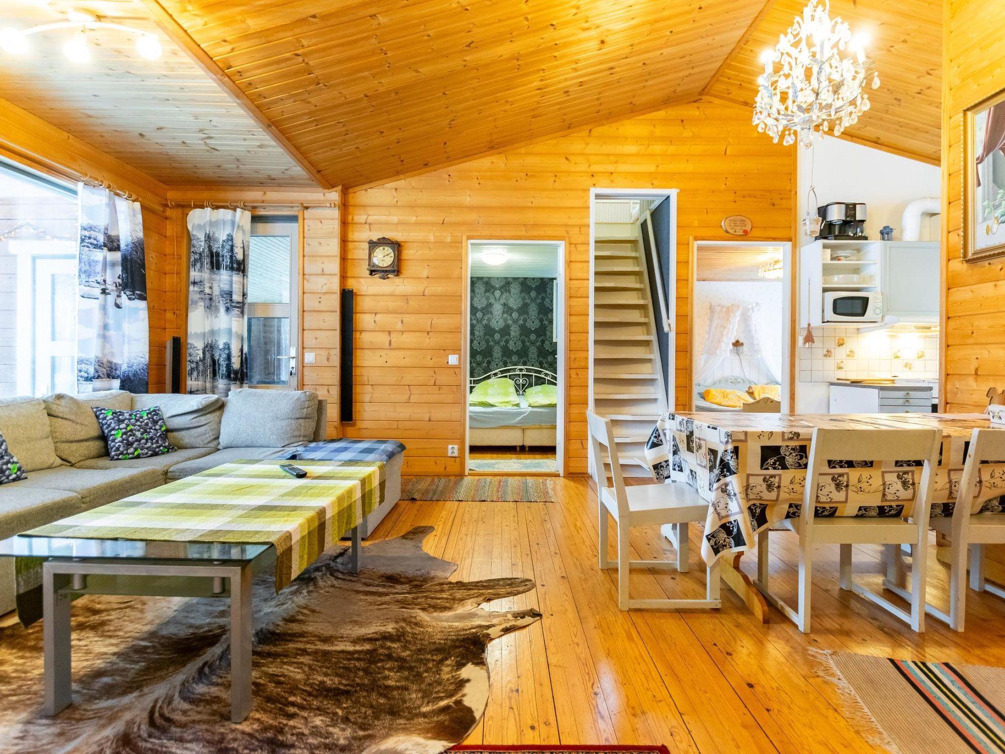 Wooden cabin (built in 2020). The living room includes a dining group, heat-storing fireplace, sofa set, and TV. The kitchenette is well-equipped with comprehensive kitchen facilities. There are two bedrooms downstairs, each with a double bed.