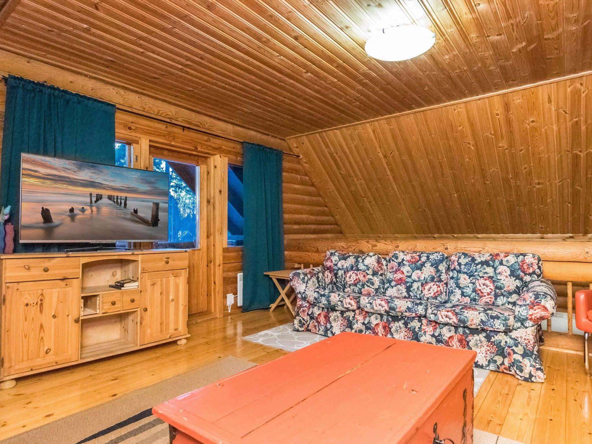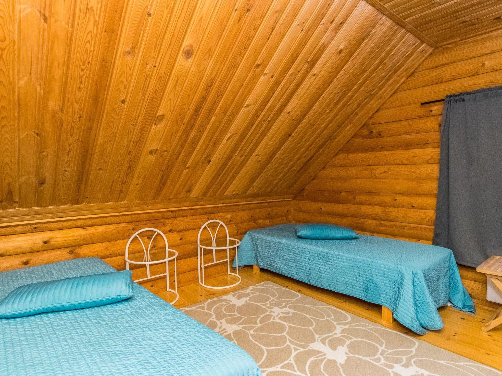 The ground floor features a living area, kitchen (renovated in 2018), a bedroom with two beds, a dressing room, a washroom with a shower and WC, and a sauna with a wood-burning stove (the sauna and washroom were renovated in 2024). There is also a covered porch. The dining table can be extended and there are totally 8 chairs.