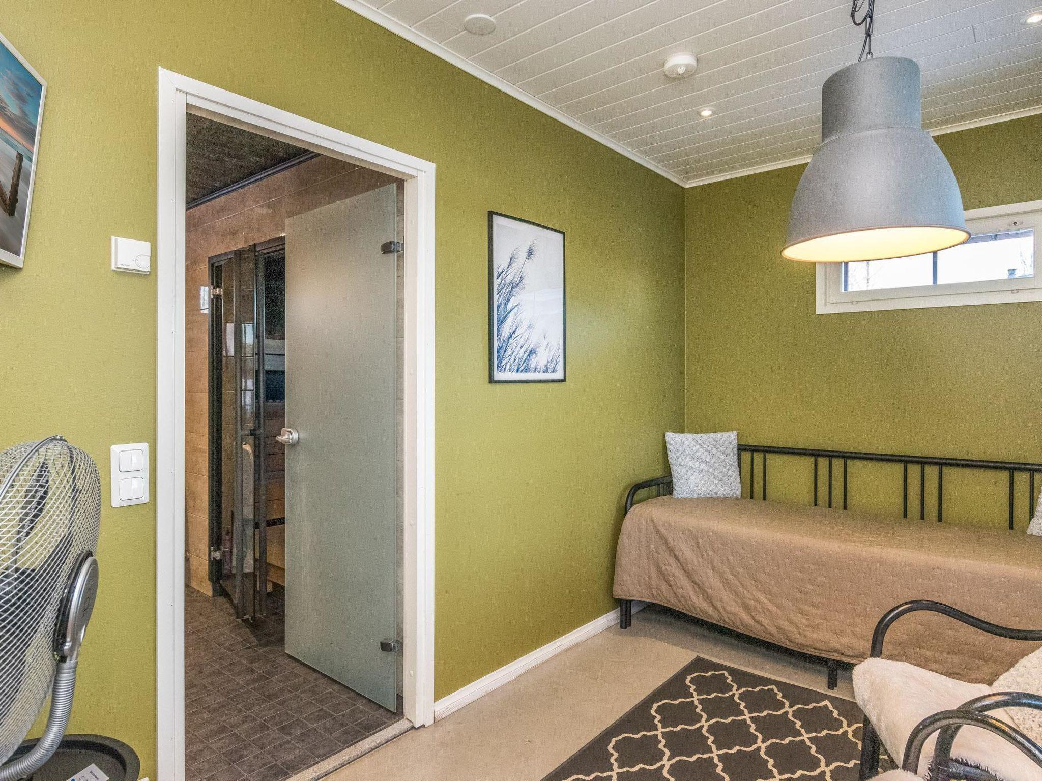 The wood-heated sauna with opposite-facing benches provides gentle heat, and the lake is just steps away via a clean, well-maintained wooden path. The hard, gently sloping sandy beach with a dock is only 20 meters from the villa, perfect for swimming.