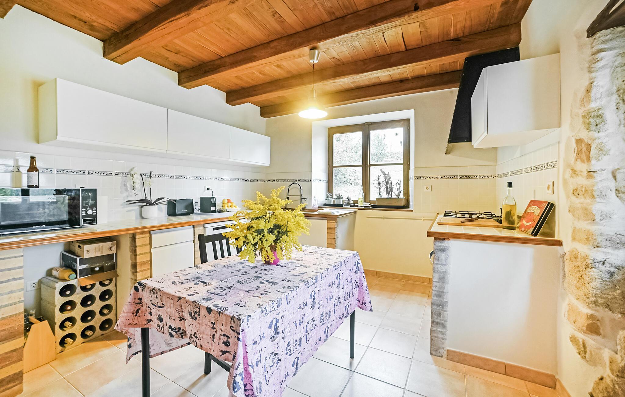 Willkommen in Ihrem einladenden Ferienhaus, die Sie in schöner Lage empfängt. Sie verdankt Ihren Charme der Einrichtung mit rustikaler Gemütlichkeit, die durch Holzmöbel, schöne Holzdecken und sichtbares Mauerwerk entsteht, und lädt zu einer erholsamen Pause vom Alltag ein. Entspannen Sie nach Ihren Aktivitäten in der Umgebung in gemütlichem Rahmen, machen Sie es sich am Esstisch bequem und veranstalten Sie einen Spieleabend oder plaudern Sie bis spät in den Abend.