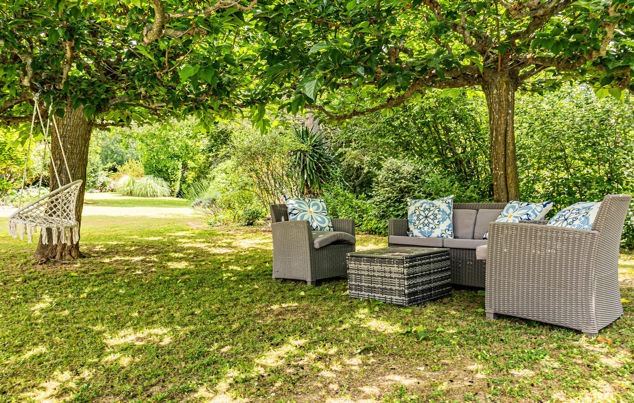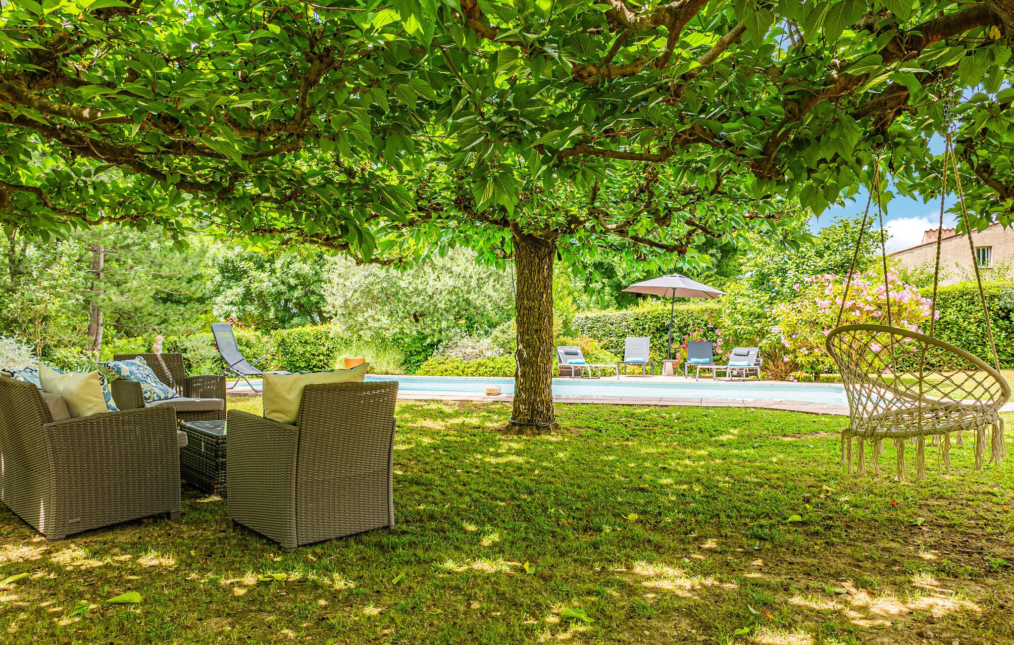 Im weitläufigen Garten, der das Haus umgibt, können Sie in vollen Zügen die Sonne und die Nähe zur Natur genießen. Erfrischen Sie sich im Pool entspannen Sie im Schatten und servieren Sie Leckereien vom Grill.