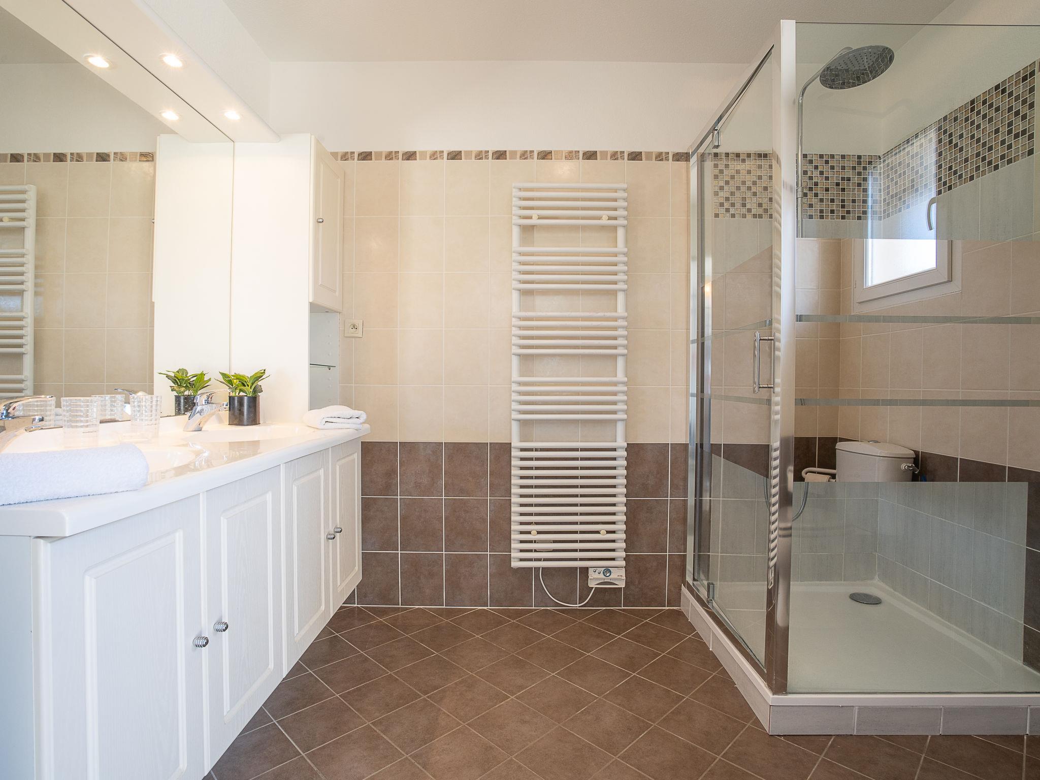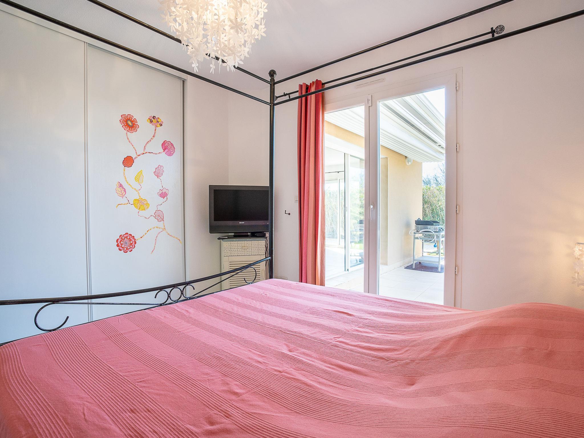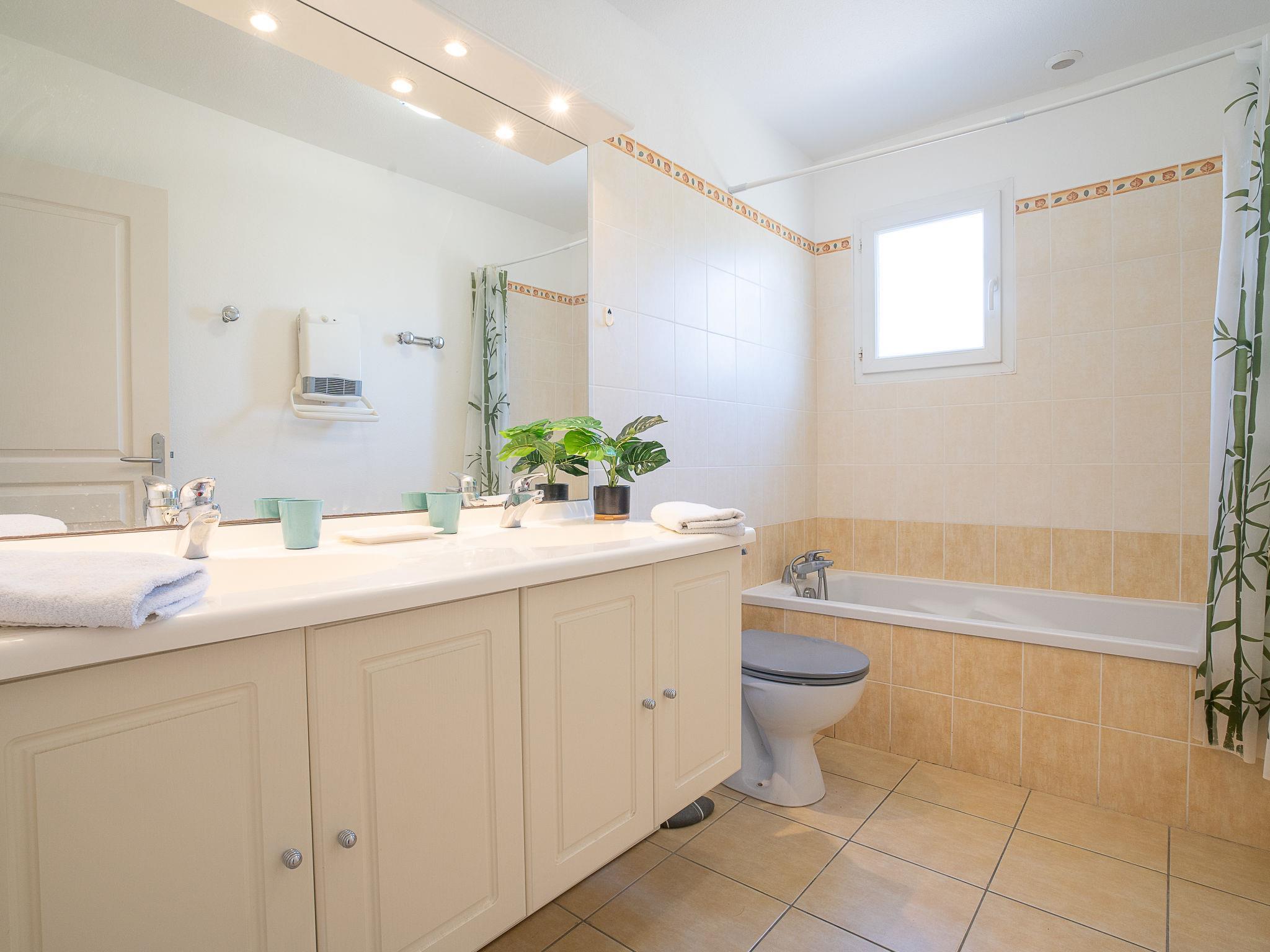 5-Zimmer-Villa 140 m2. Komfortabel eingerichtet: Wohn-/Esszimmer mit TV, Sat-TV und Internationale TV-Sender (Flachbildschirm), Radio und DVD. Ausgang zum Garten, zur Terrasse. 1 Zimmer mit 1 franz. Bett (160 cm, Länge 200 cm), Dusche/WC. Ausgang zum Garten. 1 Zimmer mit 1 franz. Bett (160 cm, Länge 200 cm). Ausgang zum Garten. 1 Zimmer mit 1 franz. Bett (160 cm, Länge 200 cm). 1 Zimmer mit 2 Betten (90 cm, Länge 190 cm). Offene Küche (4 Kochplatten, Backofen, Geschirrspüler, Toaster, Wasserkocher, Mikrowelle, Tiefkühler, elektrische Kaffeemaschine, Kapseln für die Kaffeemaschine (Nespresso)) mit Bar. Bad/WC, sep. WC. Klimaanlage, Warmluftheizung. Terrasse 47 m2, Südlage. Terrassenmöbel, Liegestühle. Zur Verfügung: Waschmaschine, Bügeleisen. Internet (Wireless LAN, gratis). Parkplatz (1 Auto), Garage (1 Auto). Bitte beachten: Rauchmelder.