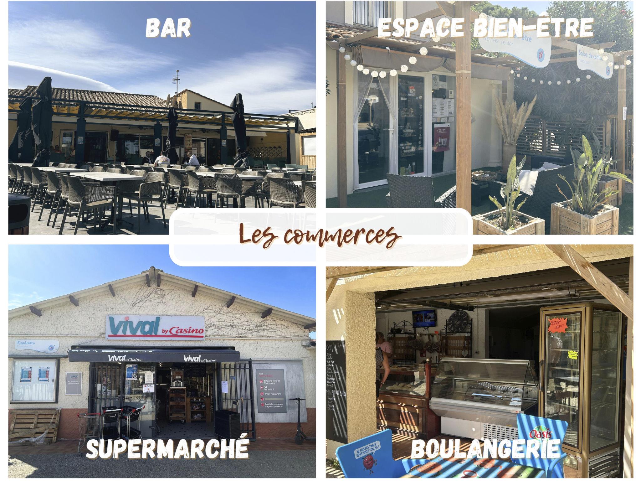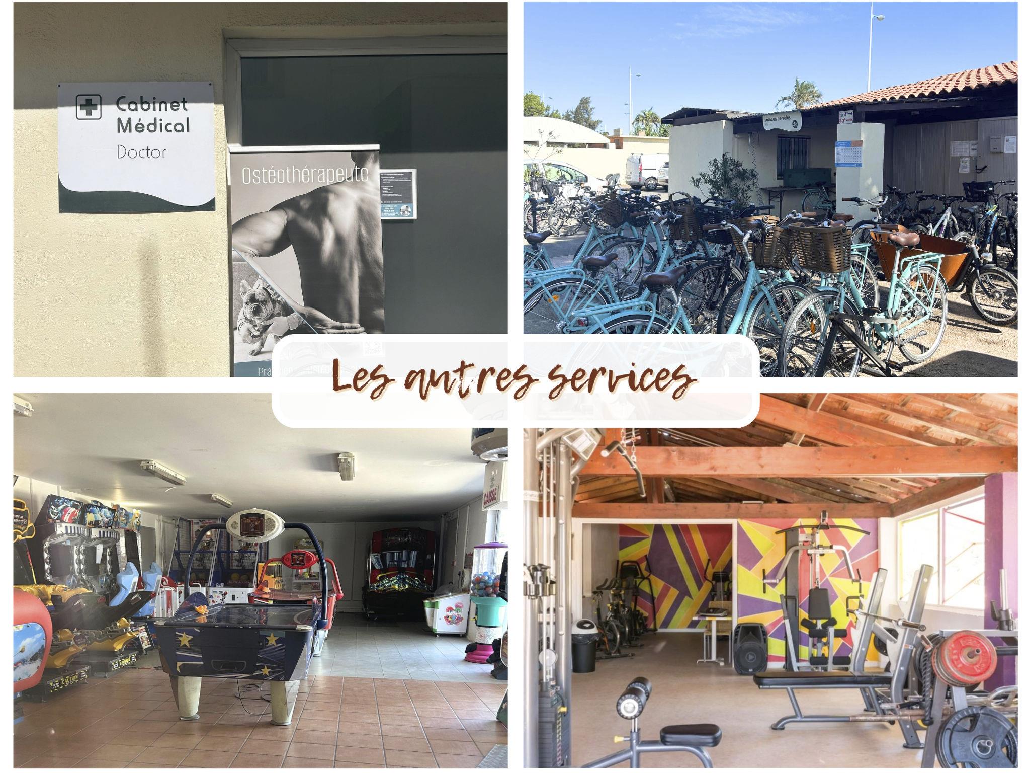 Restaurants, Pizzeria & Snacks, Wellness- und Entspannungsbereich (Friseur, Massagen und Schönheitssalon), Minimarkt, Waschsalon, Arztpraxis, Bäckerei, Arkadensaal, Bar mit Terrasse, Fahrradverleih (Preise auf den Fotos der Anzeige).