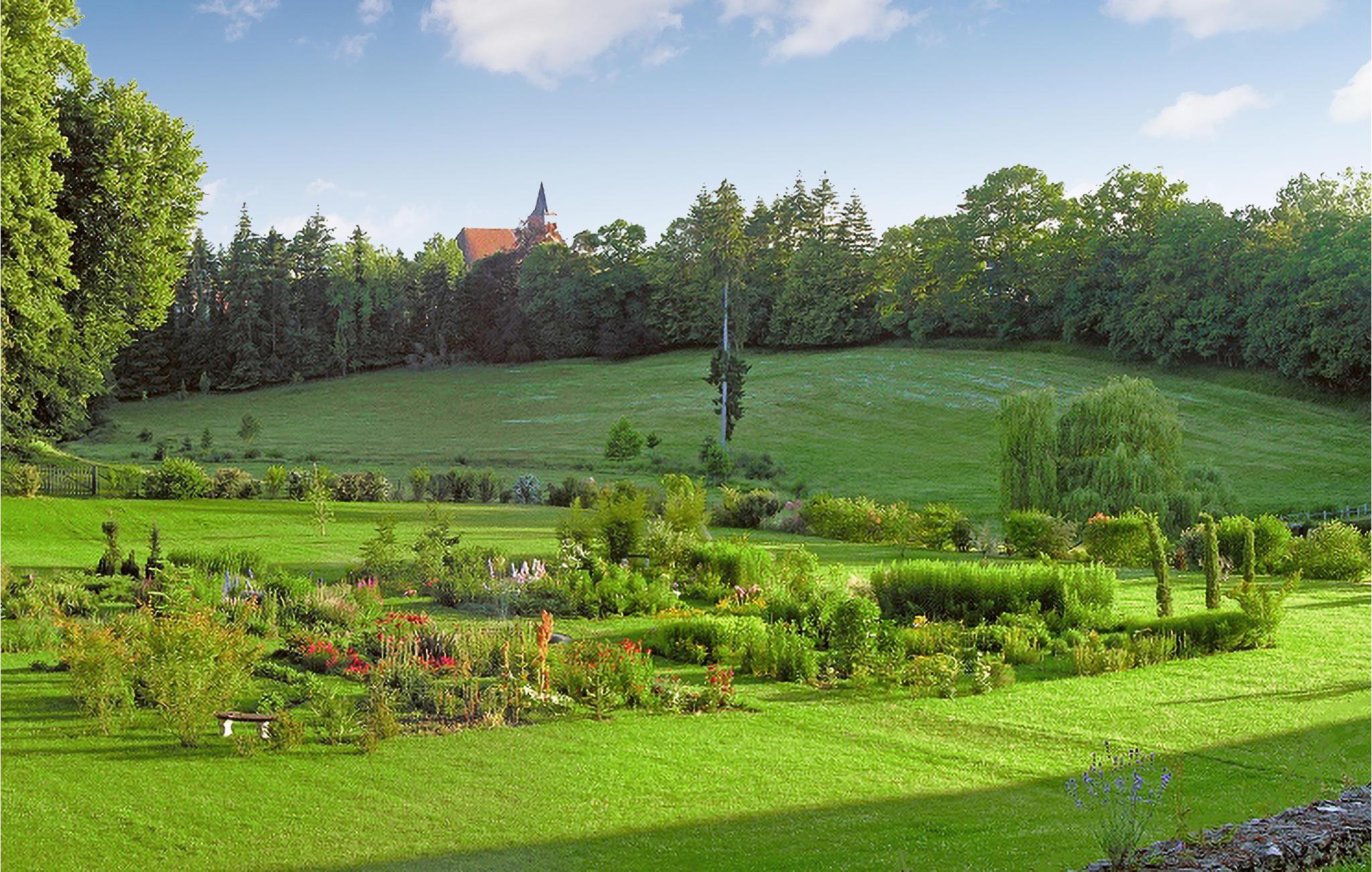 Das Château de la Barre ist eingebettet in einen 40 Hektar großen Park mit völlig unberührter Natur. Ein Weg, gesäumt von Apfelbäumen mit Schaffeldern, führt hinunter zu den Burgbefestigungen und der prächtigen ockerfarbenen Fassade des Schlosses mit Blick auf den duftenden Blumengarten und dahinter Wiesen, einen Teich, einen Bach und Wälder. Eine romantische Kulisse für einen ruhigen Spaziergang oder einfach zum Entspannen auf einer der vier Bänke, die zwischen den Bäumen und Blumen im Garten versteckt sind.