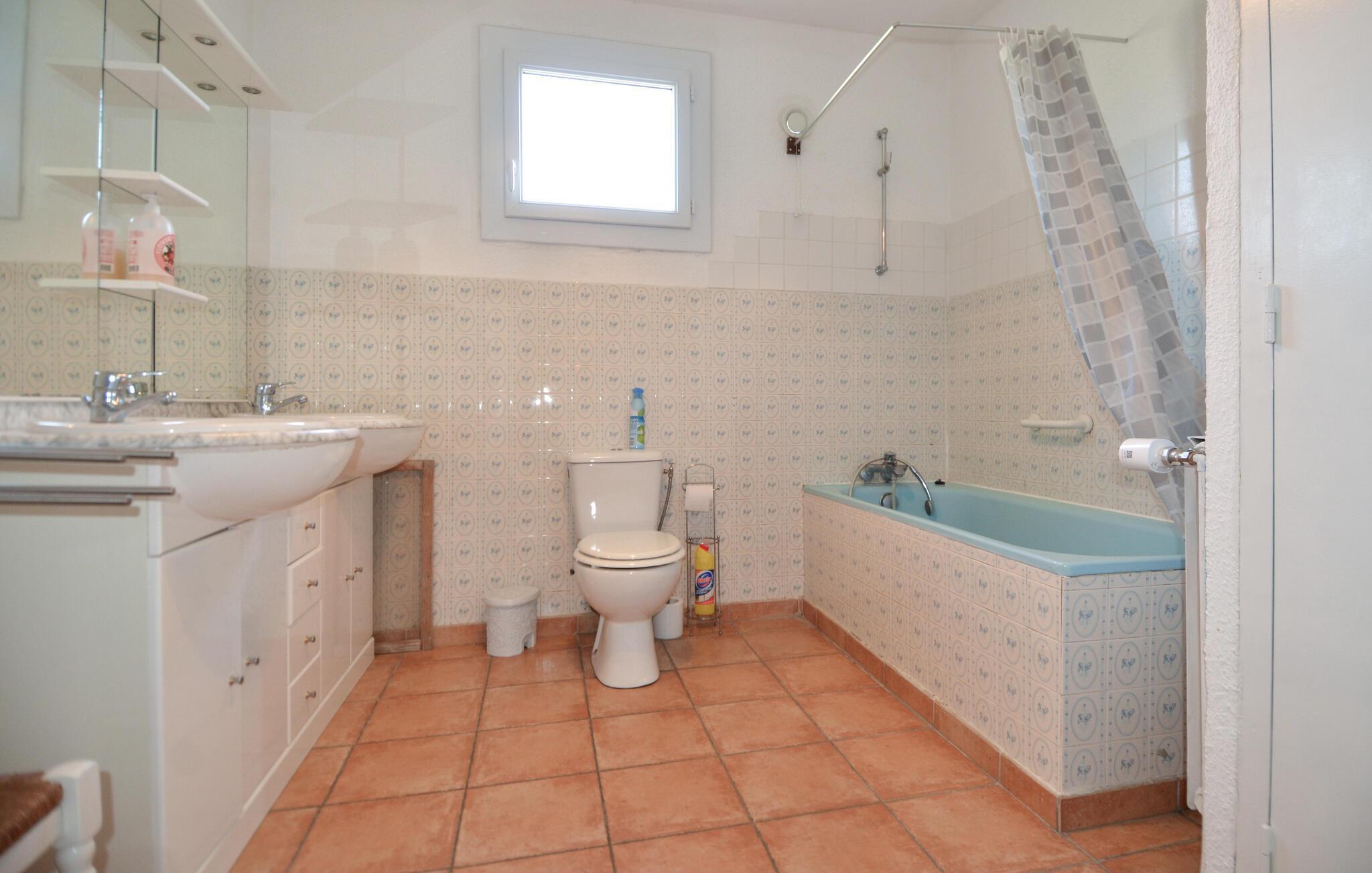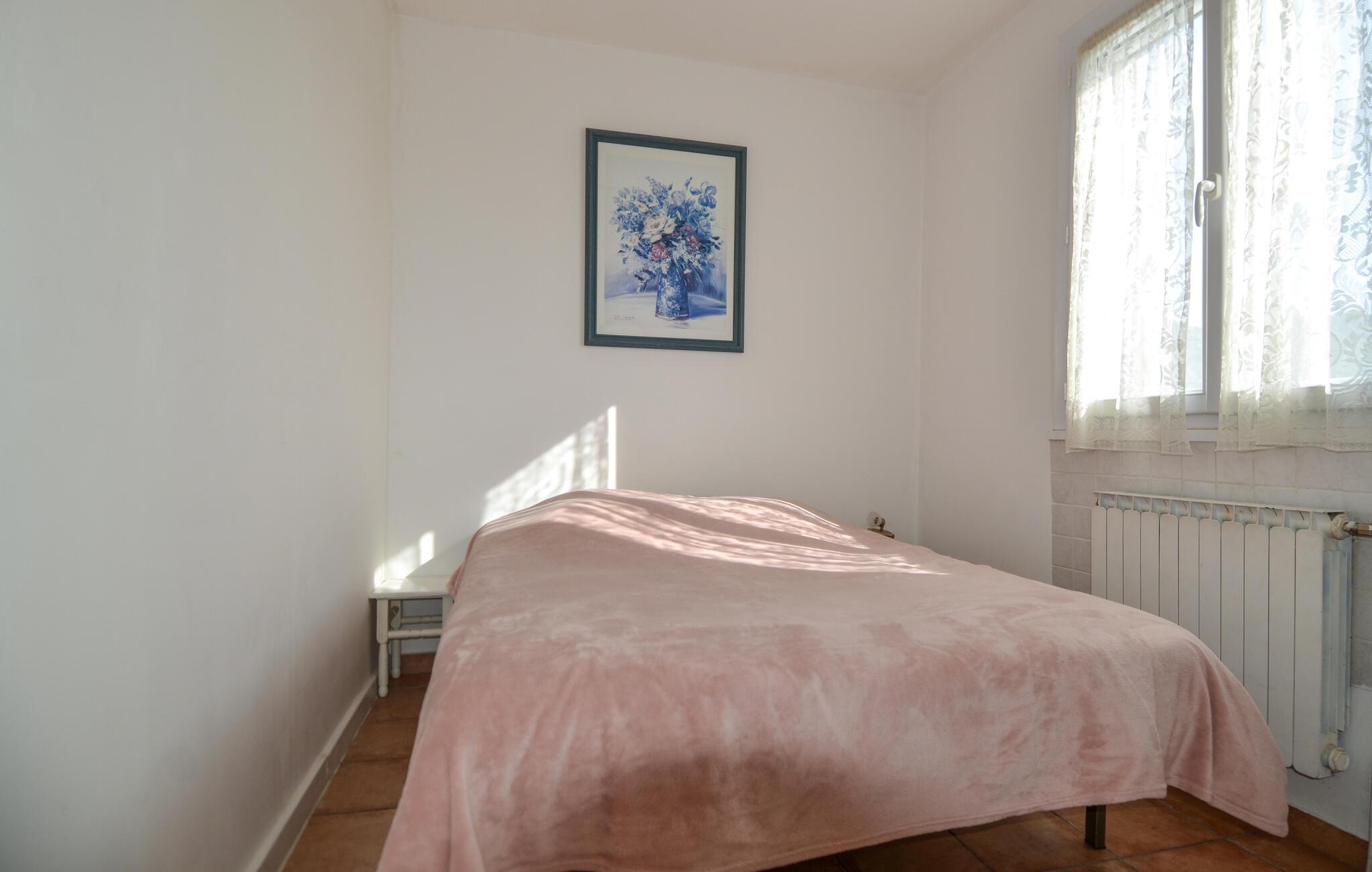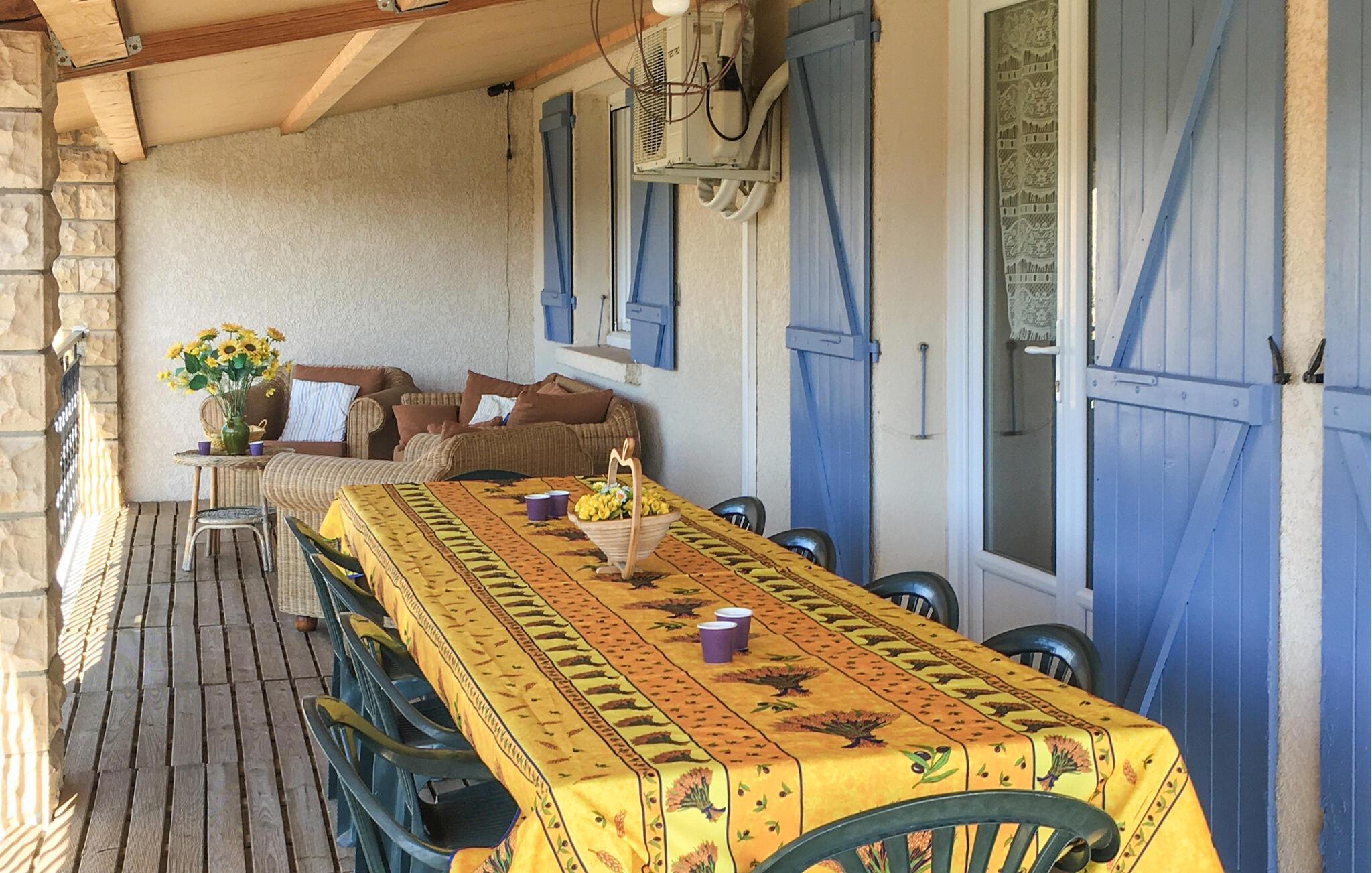Das ruhig gelegene Ferienhaus bietet eine praktische Unterkunft für Familien oder kleine Gruppen, die entspannte Urlaubstage im Süden Frankreichs verbringen möchten. Das Grundstück liegt am Rande eines kleinen Dorfs und ist von duftendem Lavendel und üppigem Grün umgeben. Treten Sie ein in den Wohnbereich mit bequemen Sitzmöbeln, Fernseher und Kamin. Nutzen Sie den großen Esstisch für gemeinsame Mahlzeiten mit Blick nach draußen. In der rustikalen Küche können Sie auch im Urlaub einfache Mahlzeiten zubereiten.