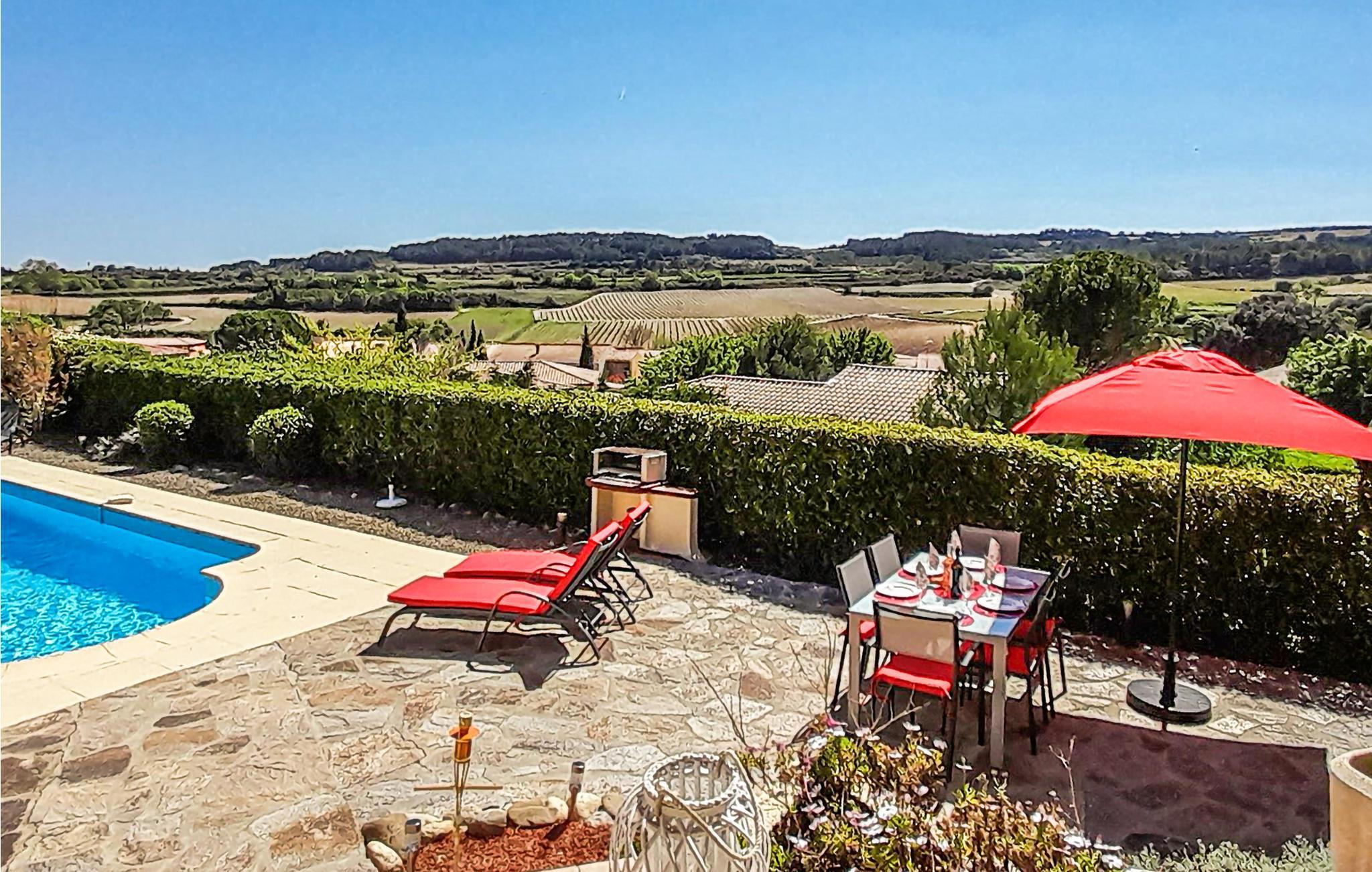 Dieses schöne Ferienhaus in Südlage verfügt über einen Privatpool und einen fantastischen Blick auf die Weinberge von Cruzy, im Hérault, 11 km vom Canal du Midi entfernt.
