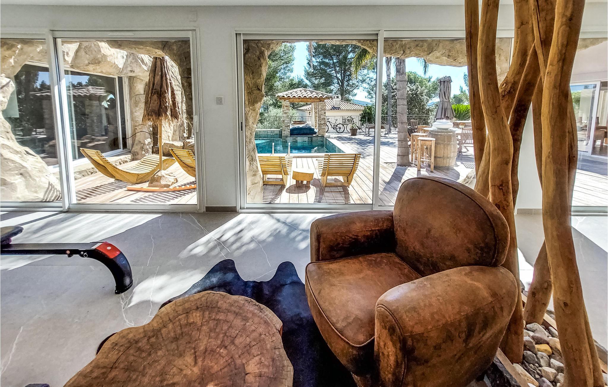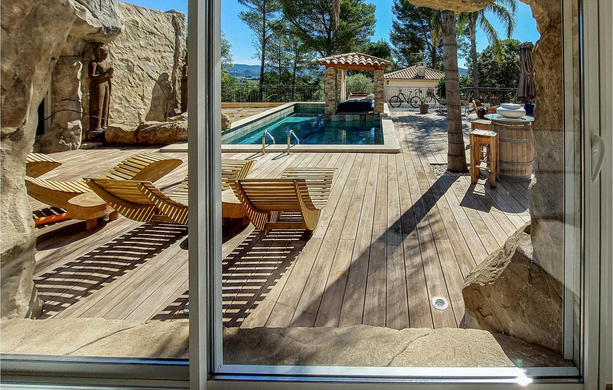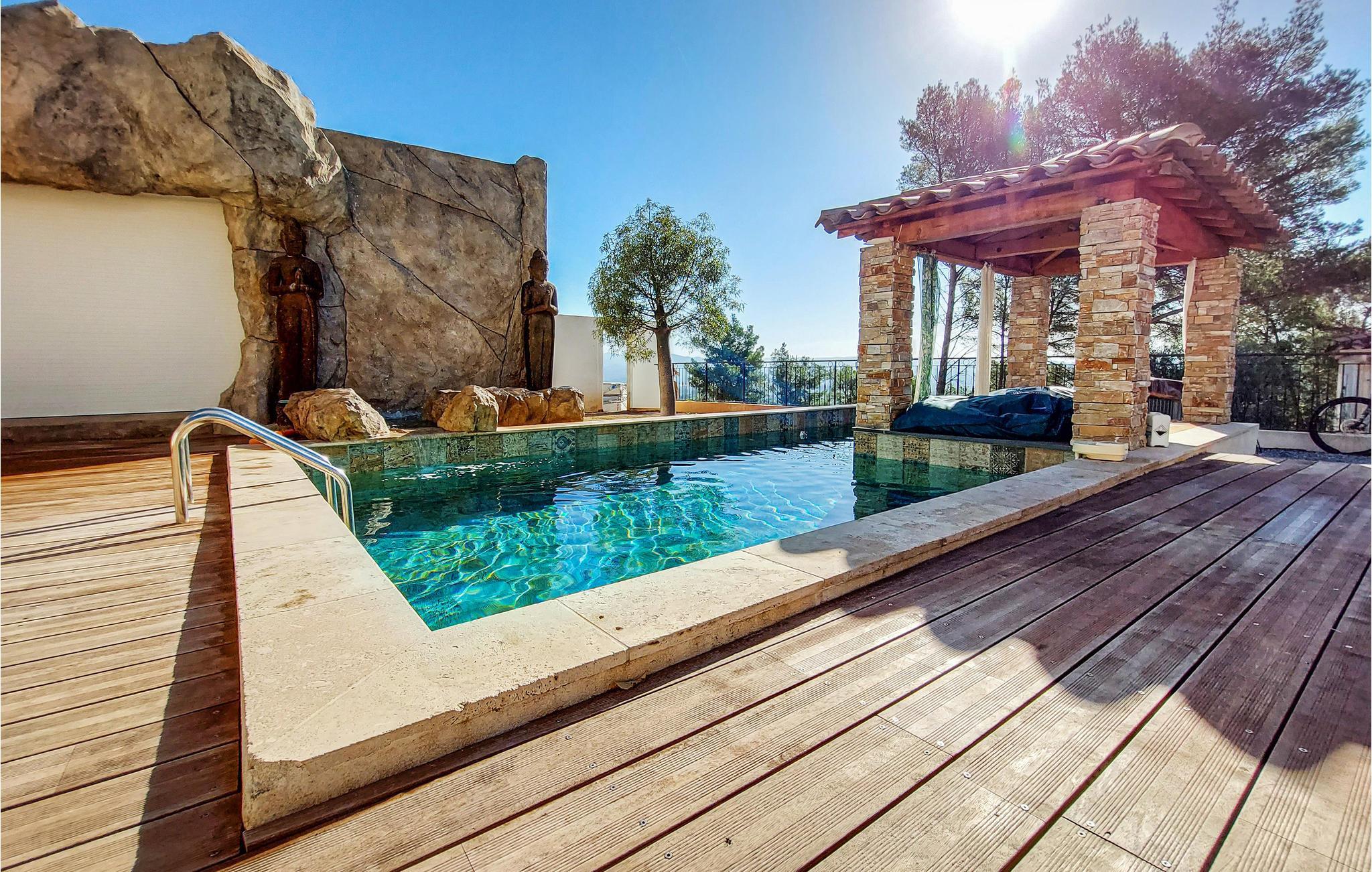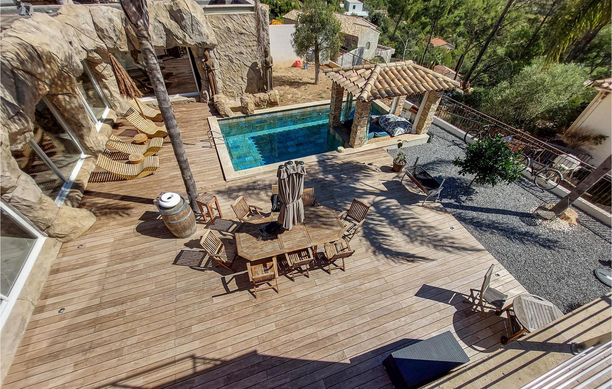 Die schöne Terrasse mit anschließendem Swimmingpool versprüht den Charme einer Grotte, da das Dekor der Hausaußenwände sehr daran erinnern. Hier können Sie Baden und sich nach Herzenslust entspannen. Auch eine große und schöne Terrasse im oberen Stockwerk lässt Sie die Sonne anbeten.