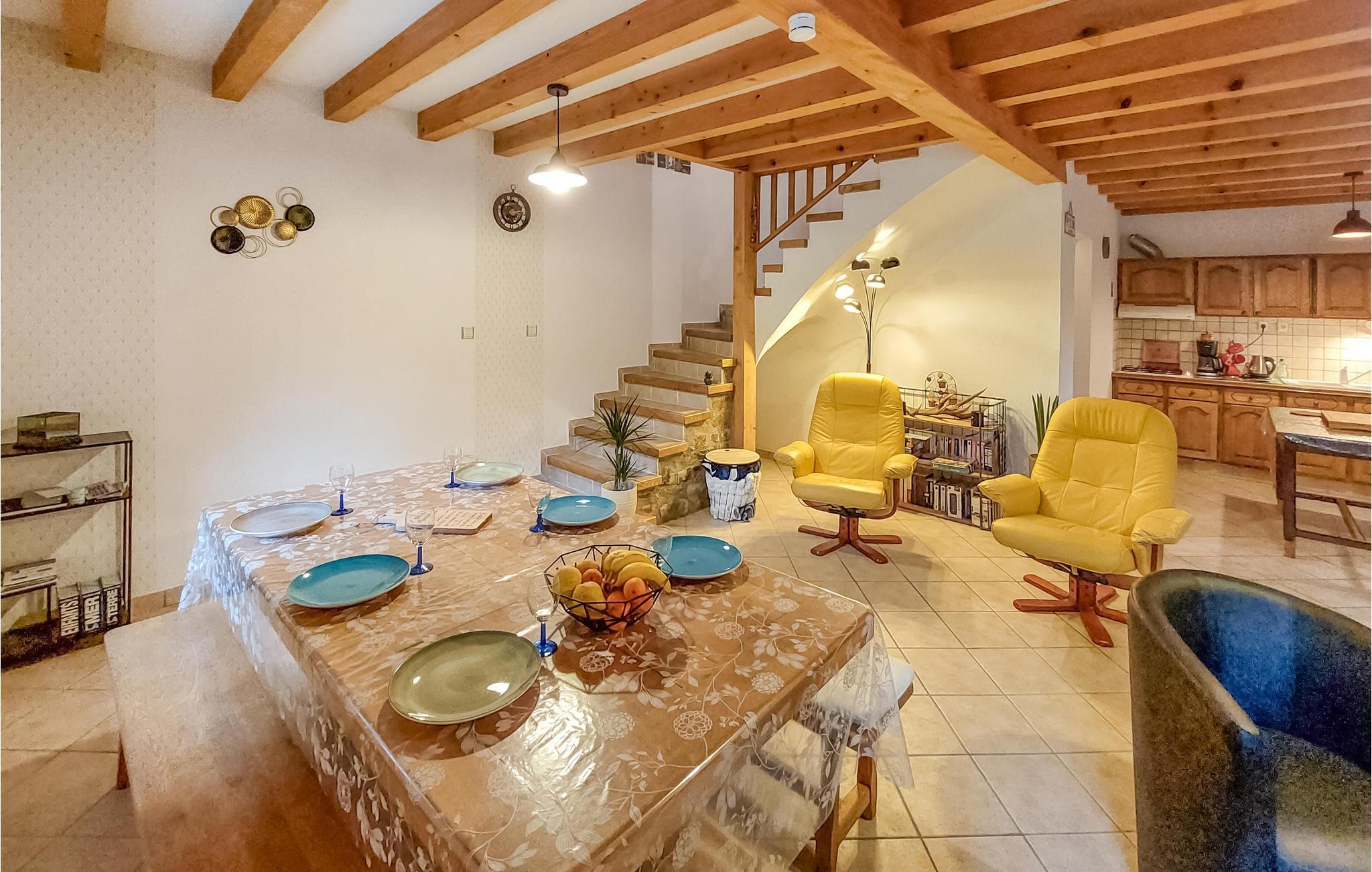Das charmante Steinhaus begrüßt Sie in idyllischer Umgebung. Hier können Sie in hellen, rustikal anmutenden Räumen so richtig entspannen und in ansprechendem Ambiente eine wunderbare Zeit verbringen. Freuen Sie sich auf gemeinsame Mahlzeiten am langen Esstisch und gemütliche Abende in der bequemen Sofalandschaft. Der prasselnde Kamin schafft eine behagliche Atmosphäre.