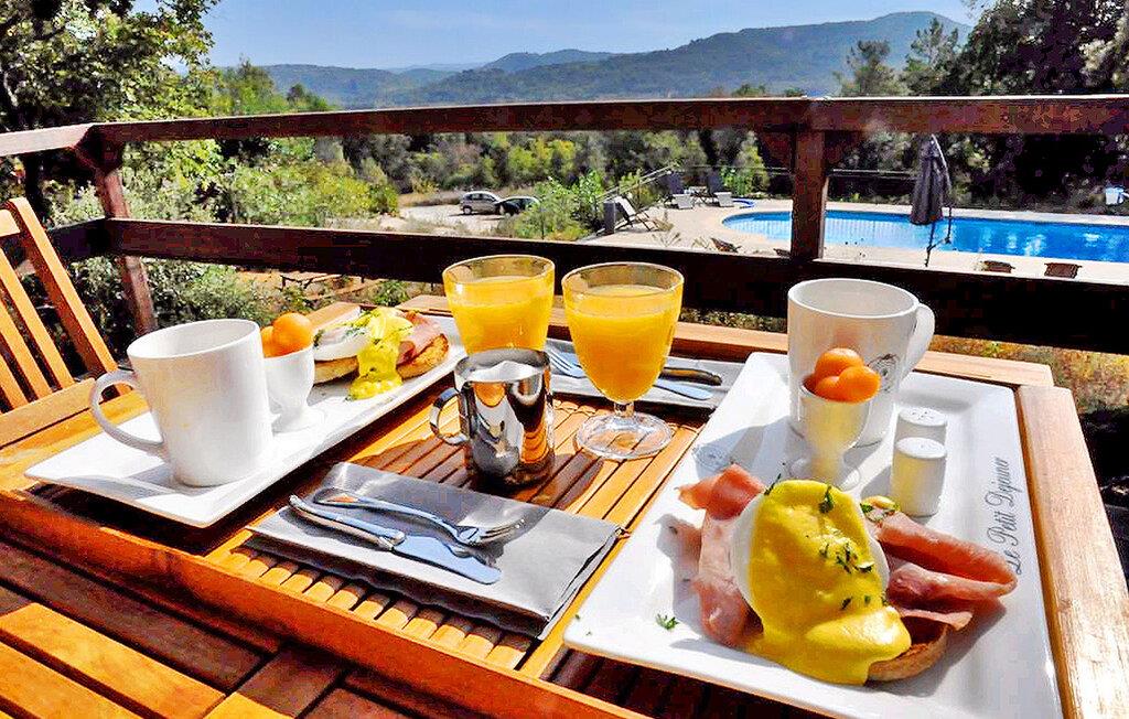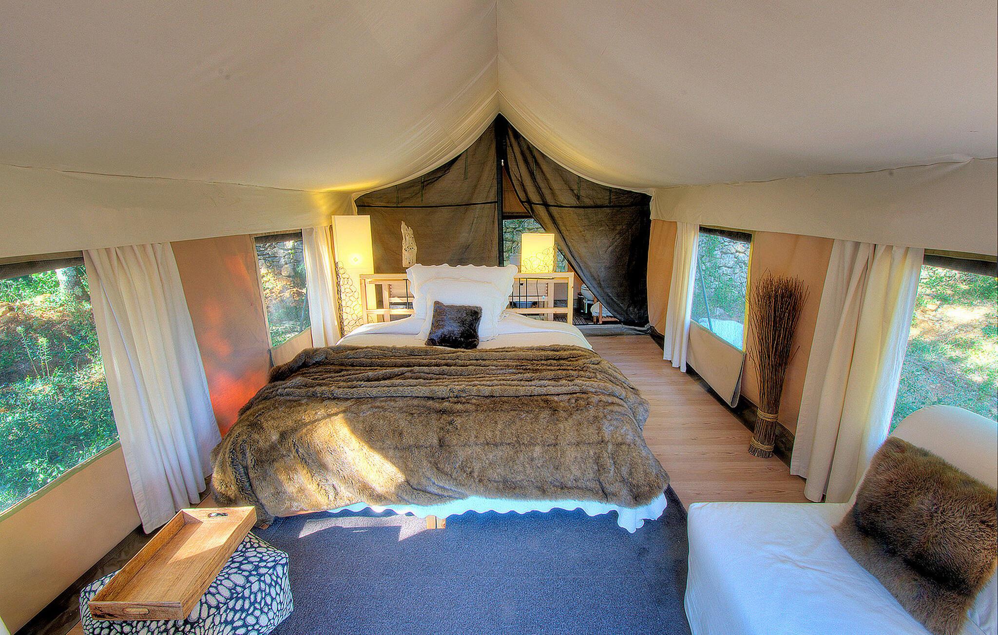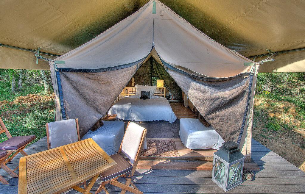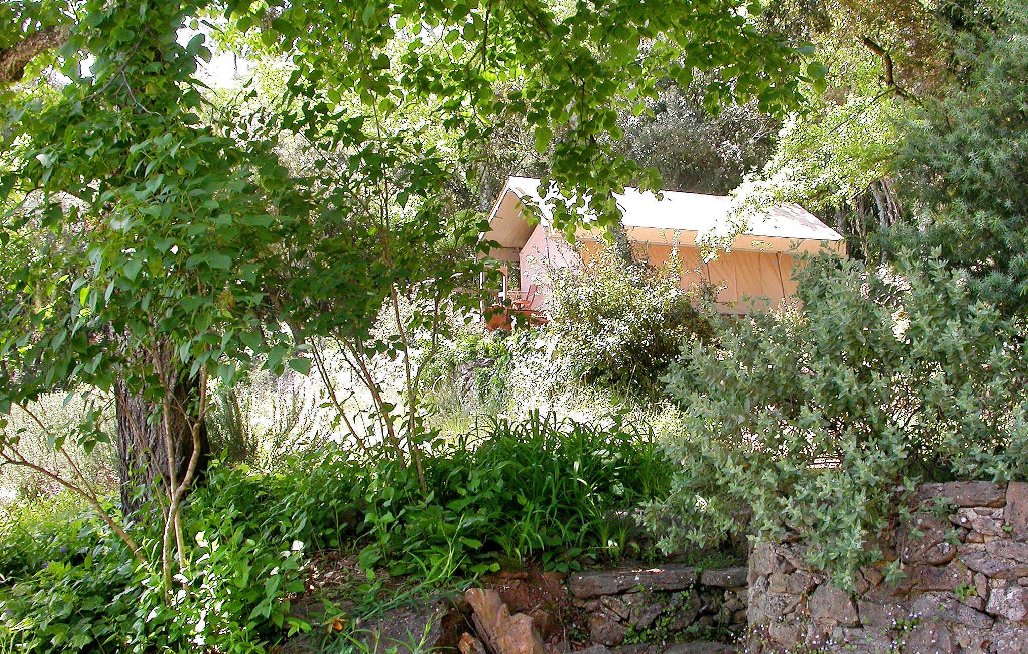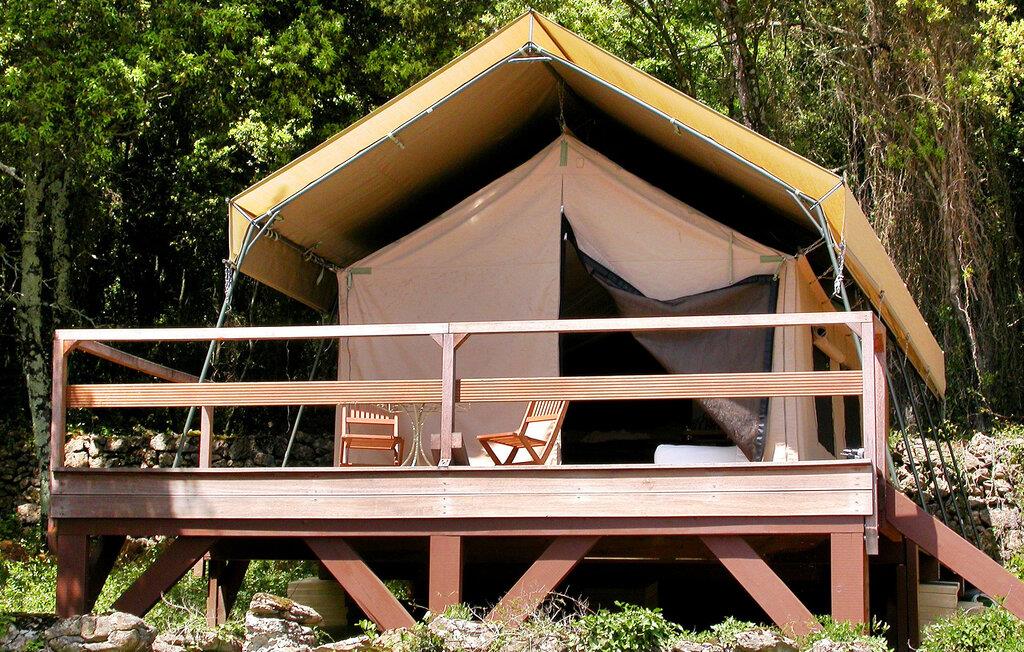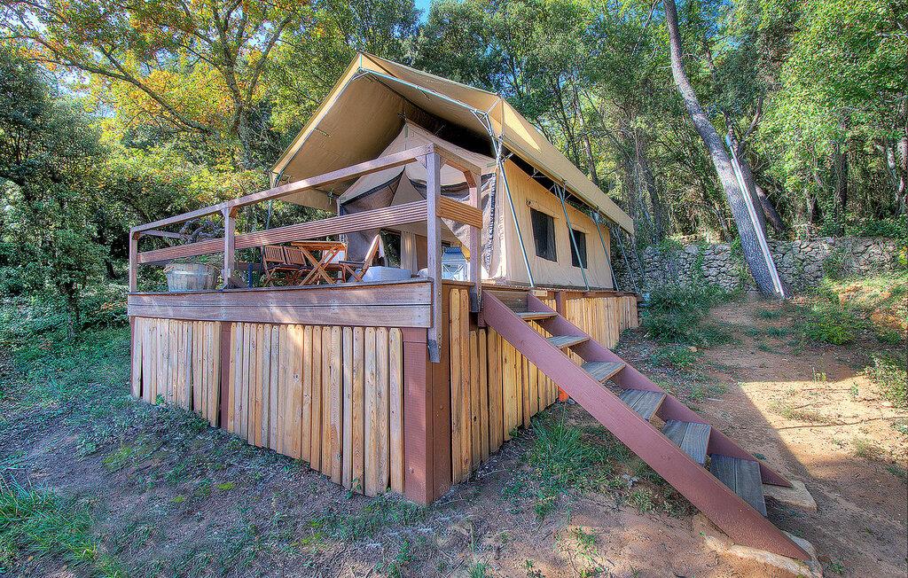 Eingebettet in ein 4,5 Hektar großes Waldgebiet in der Nähe von Goudargues verspricht dieses einzigartige Steinanwesen einen romantischen Urlaubsort. Übernachten Sie in einem luxuriösen 30 m² großen Zelt mit privater Terrasse und Zugang zu einem Gemeinschaftspool. Das Zelt verfügt über einen Schlafbereich mit einem Doppelbett (180 x 200), zwei Kinderbetten (0,90 x 190), einer Nespresso-Maschine, einem Wasserkocher und einem Weinkühlschrank. Der Badezimmerbereich umfasst eine Dusche, ein Waschbecken und ein WC. Draußen lockt eine exotische Holzplattform (50 m²) mit Gartenmöbeln. Das von Urlaubern gemeinsam genutzte Anwesen bietet einen ruhigen Rückzugsort und verfügt über einen Parkplatz für ein Auto. Ein 10 x 4,50 m großer Gemeinschaftspool mit großzügiger Terrasse und Liegestühlen lädt zum Entspannen ein. Bitte beachten Sie, dass das Kochen in den Zelten nicht gestattet ist. Der Eigentümer bietet ein kostenloses Frühstück und optional Abendessen an. Der Table d'hôtes kostet zweimal pro Woche 29,50 Euro pro Person. An anderen Abenden ist ein luxuriöser Speiseservice in Ihrem Zelt für 39,50 Euro pro Person verfügbar.