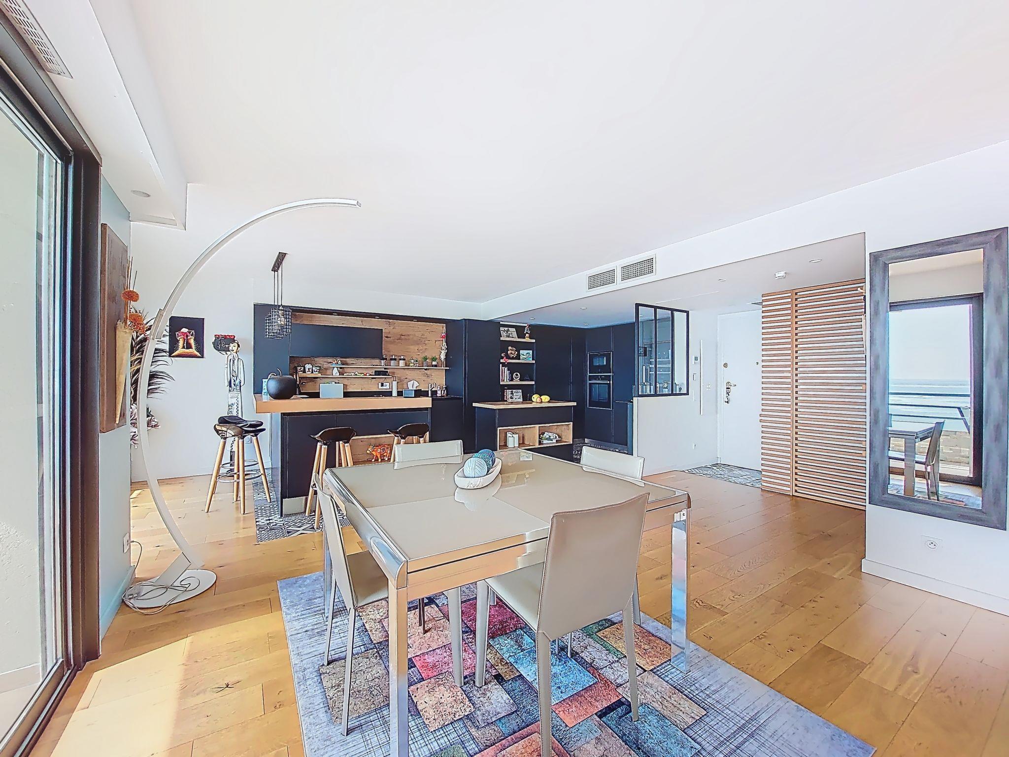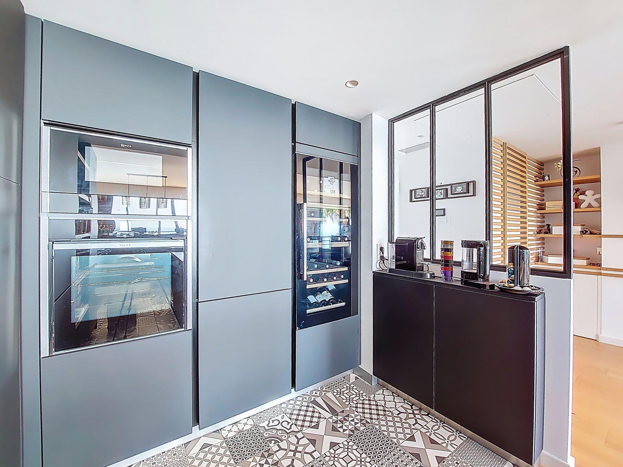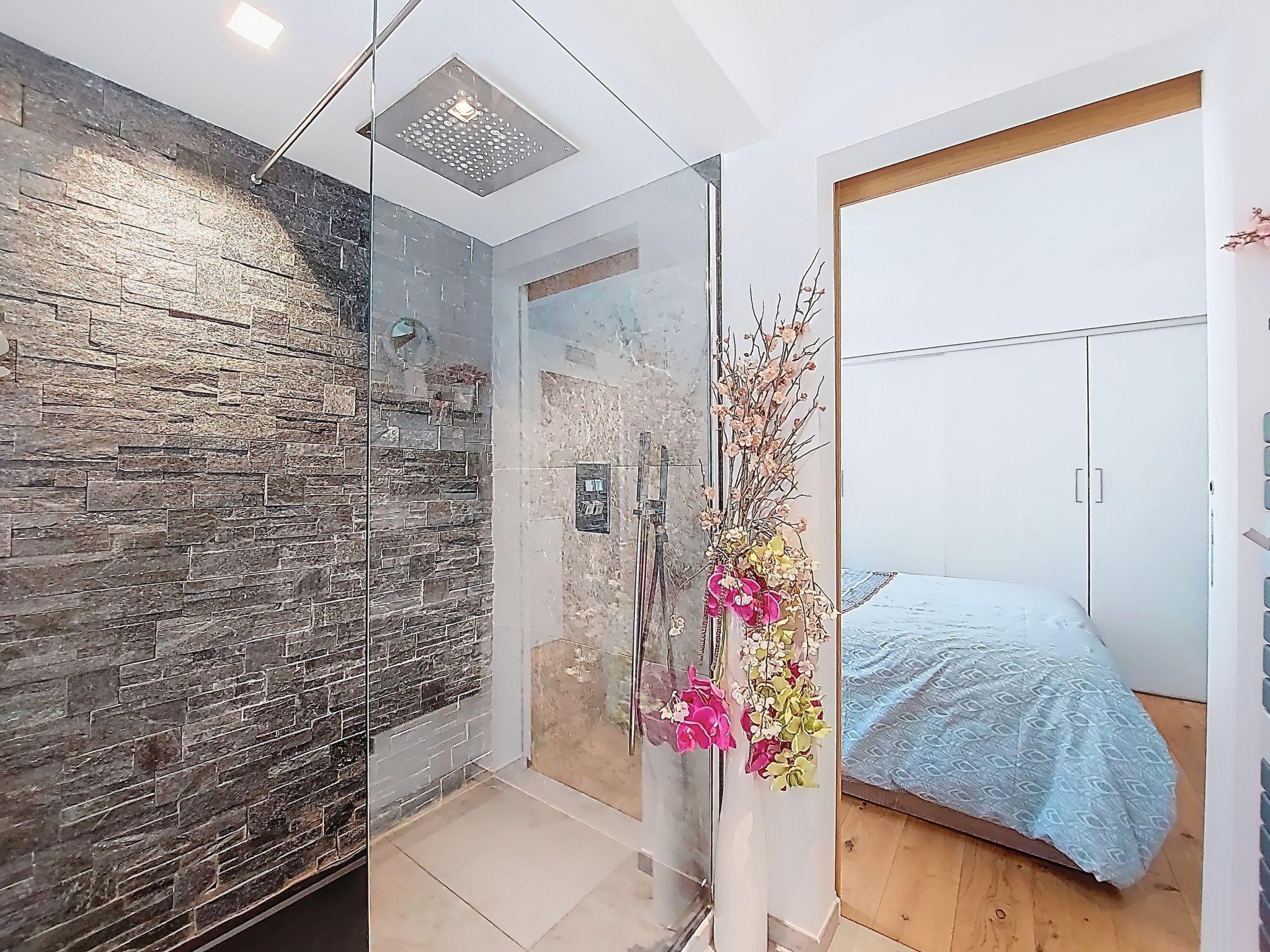 3-Zimmer-Wohnung 100 m2 im 4. Stock. Geräumig und hell, schön und modern eingerichtet: Wohn-/Esszimmer mit Panoramafenster mit TV (Flachbildschirm). Ausgang zur Terrasse. 1 Zimmer mit 1 franz. Bett (140 cm, Länge 190 cm), TV (Flachbildschirm). 1 Zimmer mit 1 franz. Bett (140 cm, Länge 190 cm). Offene Küche (Backofen, Geschirrspüler, 4 Induktionskochplatten, Toaster, Wasserkocher, Mikrowelle, elektrische Kaffeemaschine, Kapseln für die Kaffeemaschine (Nespresso) extra, Kochinsel) mit Bar. Ausgang zur Terrasse. Bad, sep. WC. Heizung, Klimaanlage. Grosse Terrasse. Terrassenmöbel, Liegestühle. Panoramasicht auf das Meer und die Landschaft. Zur Verfügung: Waschmaschine, Wäschetrockner, Bügeleisen, Haartrockner. Internet (Wireless LAN, gratis). Garage Nr. 31 (1 Auto). Bitte beachten: Rauchmelder. 06104000879T8