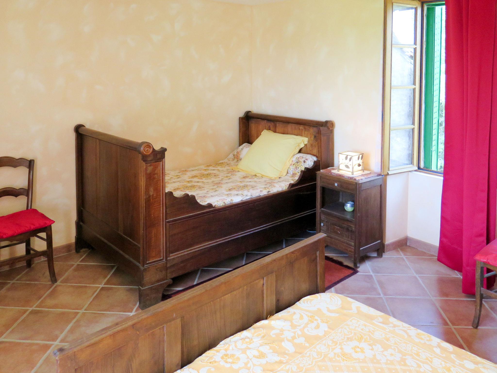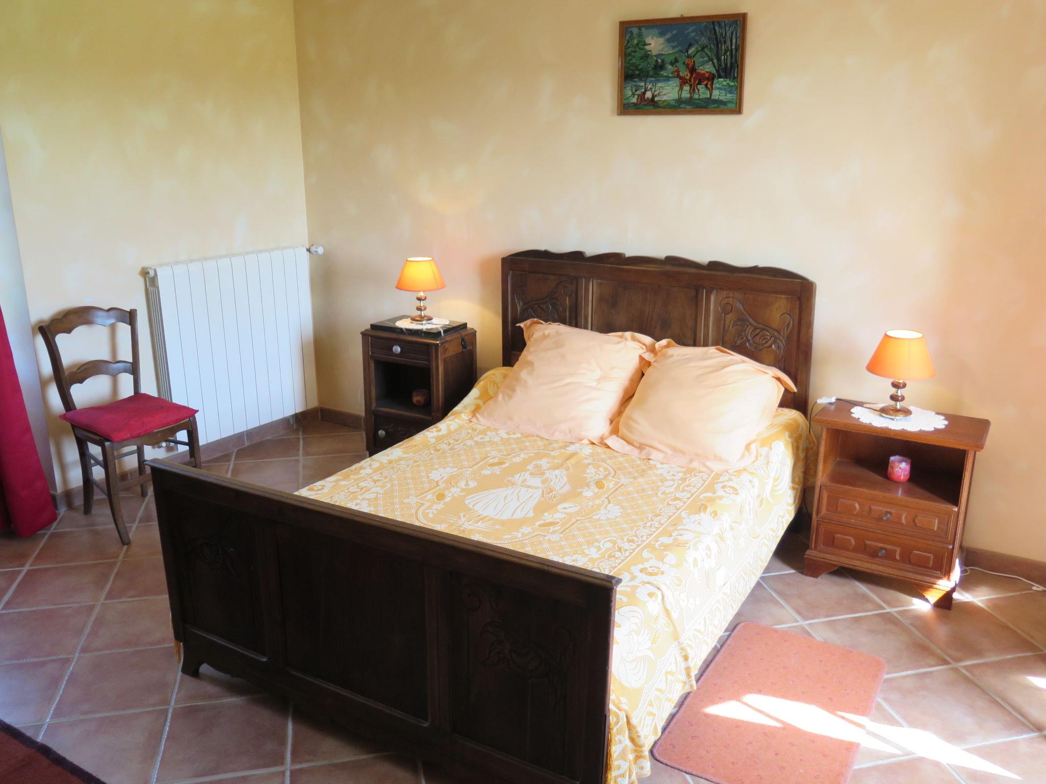 "Le Mas de Serre", 3-Zimmer-Haus 115 m2, im erhöhten Erdgeschoss. Objekt geeignet für 5 Erwachsene. Rustikal und antik eingerichtet: Wohn-/Esszimmer mit offenem Kamin, Esstisch und Sat-TV (Flachbildschirm). Ausgang zur Terrasse. 1 Zimmer mit 1 Bett (120 cm, Länge 190 cm), 1 franz. Bett (140 cm, Länge 190 cm). 1 Zimmer, auf 2 Ebenen mit 1 Bett (110 cm, Länge 190 cm), 1 franz. Bett (140 cm, Länge 190 cm). Offene Küche (Backofen, Geschirrspüler, 4 Flammen, Toaster, Wasserkocher, Mikrowelle, Tiefkühler, elektrische Kaffeemaschine) mit Bar, Esstisch. Bad, sep. WC. Ölheizung. Holzdielenboden. Terrasse. Terrassenmöbel, Gartengrill (mobil), Liegestühle, Loggia. Schöne Sicht auf die Landschaft. Zur Verfügung: Waschmaschine, Kinderhochstuhl, Babybett, Holz (gratis). Bitte beachten: Nichtraucher-Haus. Maximal 2 Haustiere/Hunde erlaubt. Rauchmelder. Flexibilität bei der Bettenaufteilung: Es stehen mehr Schlafmöglichkeiten zur Verfügung als die maximal zugelassene Personenzahl, diese darf dennoch nicht überschritten werden.