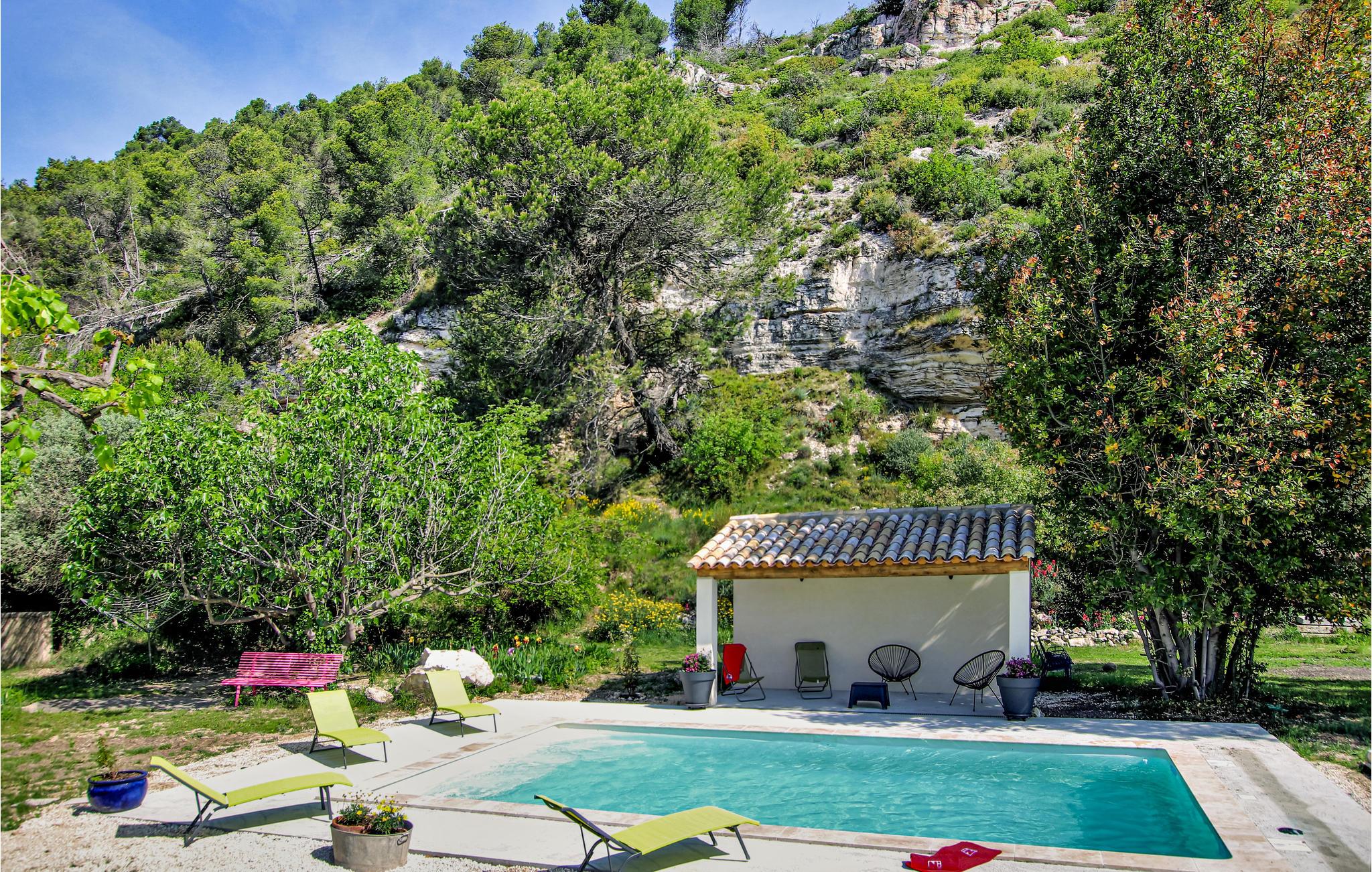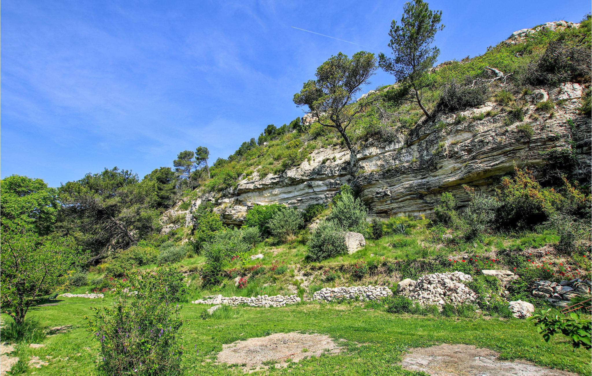 Der weitläufige Garten mit Sträuchern, Blumenbeeten und einem Picknickbereich, schmiegt sich an eine wunderschöne Kalksteinklippe. Entspannen Sie im Schutz eines jahrhundertealten Baums auf der großen, halb überdachten Terrasse mit Gartenmöbeln und Grill und kühlen Sie sich an warmen Tagen im Pool ab.