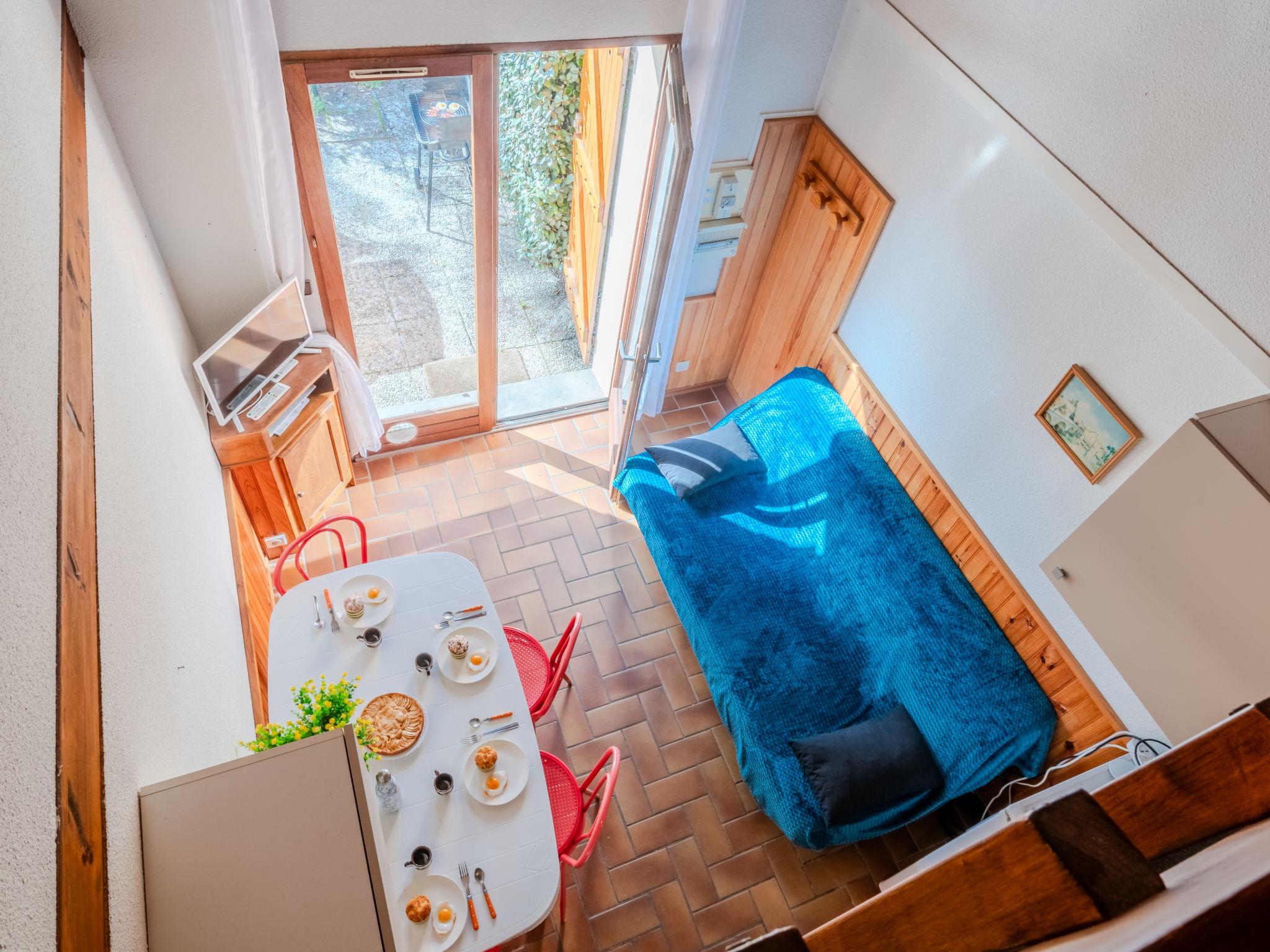 3-Zimmer-Reihenhaus 39 m2 auf 2 Stockwerken, Südlage. Rustikal eingerichtet: kleines Wohn-/Esszimmer mit TV (Flachbildschirm). Ausgang zur Terrasse. 1 Zimmer mit 1 x 2 Etagenbetten (90 cm). Kochnische (2 Kochplatten, Backofen, Mikrowelle). Dusche, sep. WC. Obergeschoss: (steile Treppe) 1 abgeschrägtes, offenes Zimmer, Deckenhöhe 110 - 150 cm mit 1 franz. Bett (140 cm). E-Heizung. Terrassenmöbel, Gartengrill (mobil). Zur Verfügung: Waschmaschine. Internet (WLAN, extra). Bitte beachten: Nichtraucher-Unterkunft. Maximal 1 kleines Haustier/Hund erlaubt. TV nur FR. Rauchmelder.