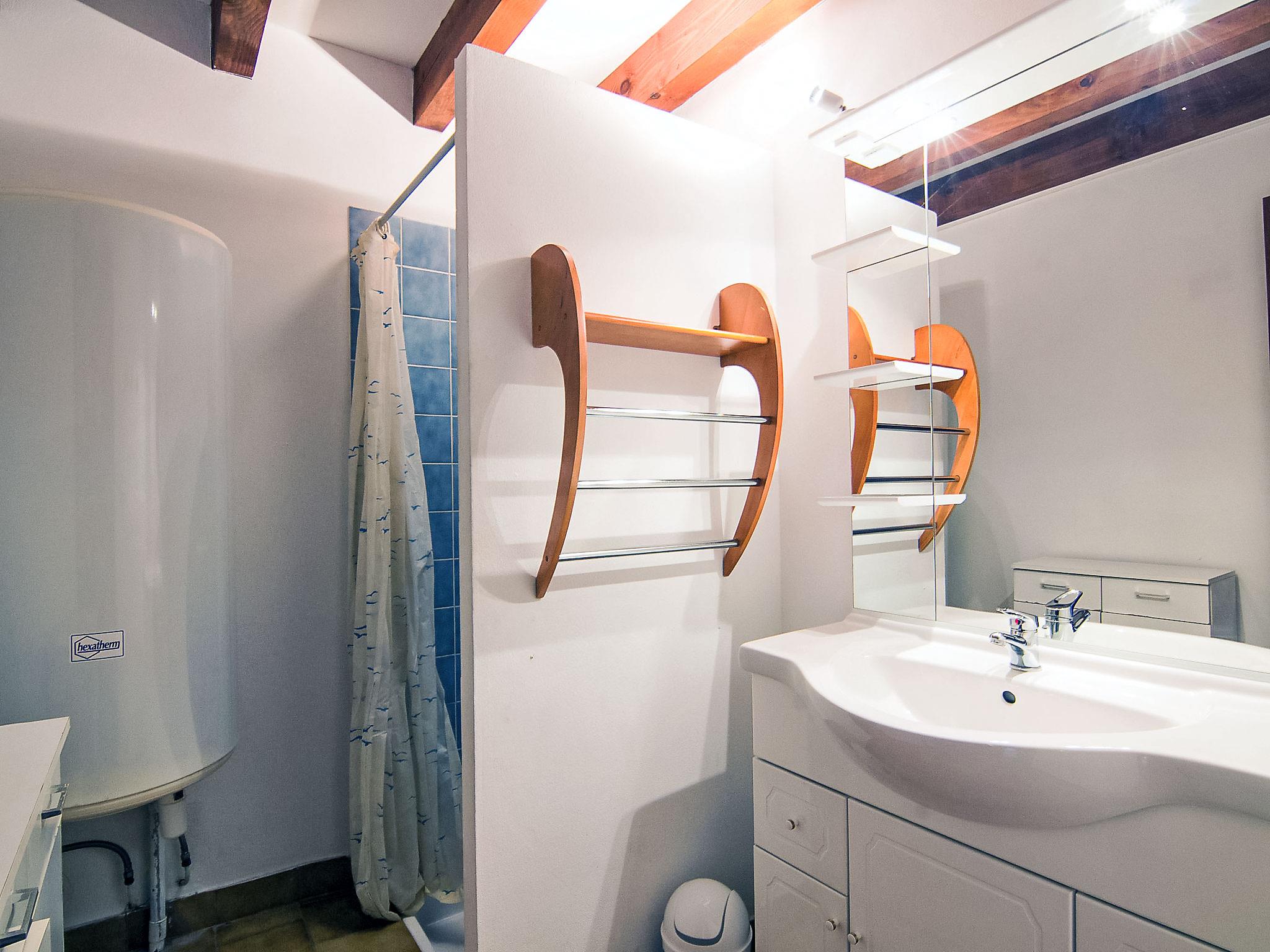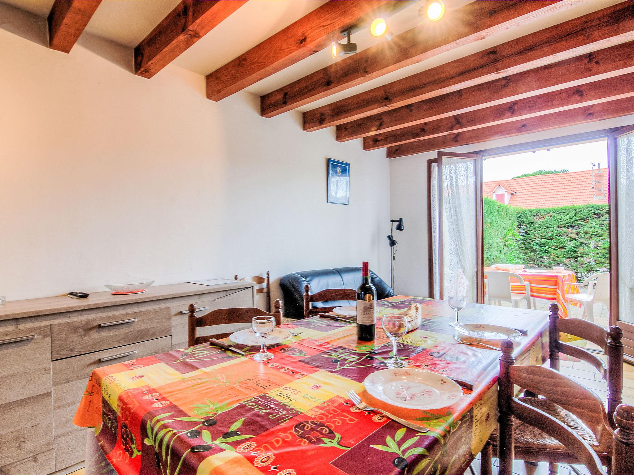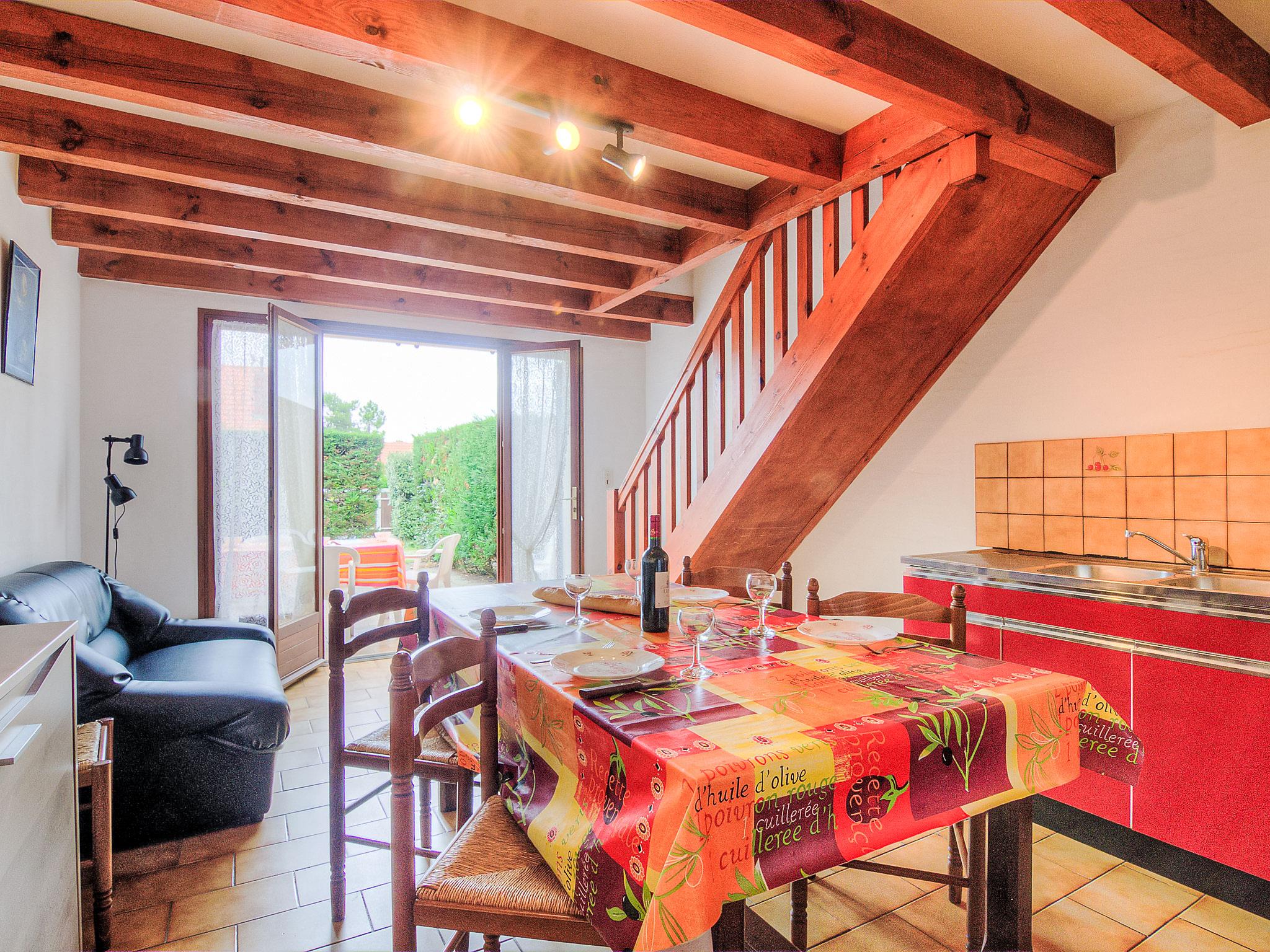 3-Zimmer-Reihenhaus 50 m2 auf 2 Stockwerken. Einfach eingerichtet: Wohn-/Esszimmer mit TV und Internationale TV-Sender (Flachbildschirm). Ausgang zur Terrasse. Kochnische (1 Kochplatte, Mini-Backofen, Backofen, 4 Flammen, Toaster, Wasserkocher, Mikrowelle, elektrische Kaffeemaschine, Kapseln für die Kaffeemaschine (filtre) extra). Dusche, sep. WC. Heizung nicht in allen Räumen. Obergeschoss: 1 abgeschrägtes Zimmer mit 2 Betten (90 cm, Länge 190 cm). 1 abgeschrägtes Zimmer mit 1 Bett (90 cm, Länge 190 cm), 1 franz. Bett (1 x 140 cm, Länge 190 cm). Terrasse. Terrassenmöbel, Liegestühle (1). Zur Verfügung: Internet (WLAN, gratis). Bitte beachten: Maximal 1 Haustier/Hund erlaubt. Rauchmelder.