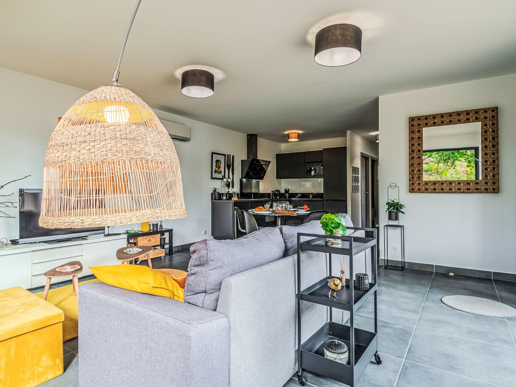 3-Zimmer-Haus 67 m2. Modern eingerichtet: Wohn-/Esszimmer mit 1 Diwanbett (130 cm, Länge 190 cm), TV und Internationale TV-Sender (Flachbildschirm), Klimaanlage und elektrischem Rollladen. Ausgang zur Terrasse. 1 Zimmer mit 1 franz. Bett (160 cm, Länge 200 cm). 1 Zimmer mit 1 franz. Bett (160 cm, Länge 200 cm). Offene Küche (Backofen, Geschirrspüler, 3 Induktionskochplatten, Mikrowelle, elektrische Kaffeemaschine, Kapseln für die Kaffeemaschine (filtre) extra). Dusche, sep. WC. E-Heizung. Holzdielenboden. Terrassenmöbel, Gartengrill. Zur Verfügung: Waschmaschine, Bügeleisen. Internet (Wireless LAN, gratis). Parkplatz (1 Auto). Bitte beachten: Nichtraucher-Haus. Rauchmelder.