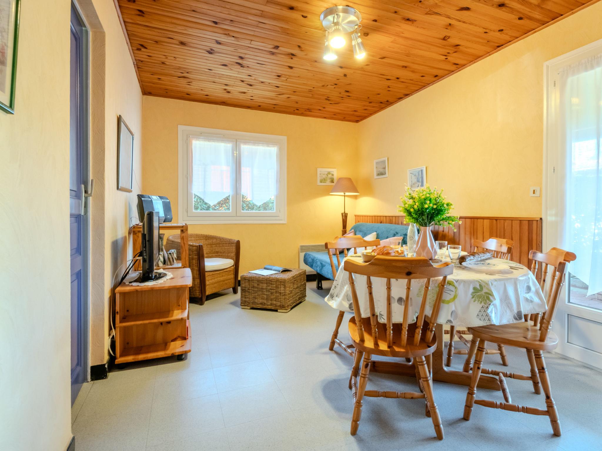 3-Zimmer-Haus 60 m2. Schön eingerichtet: Wohn-/Esszimmer mit 1 Diwanbett (120 cm), Sat-TV und Internationale TV-Sender (Flachbildschirm), Stereoanlage und DVD. Ausgang zur Terrasse. 1 Zimmer mit 1 franz. Bett (1 x 140 cm, Länge 190 cm). Ausgang zur Terrasse. 1 Zimmer mit 1 franz. Bett (1 x 140 cm, Länge 190 cm). Küche (4 Kochplatten, Backofen, Geschirrspüler, Mikrowelle). Dusche, sep. WC. E-Heizung. Terrasse überdacht, Nordlage Terrasse, Südlage. Terrassenmöbel, Liegestühle (4). Zur Verfügung: Waschmaschine. Internet (WLAN, gratis). Bitte beachten: Maximal 1 Haustier/Hund erlaubt. Rauchmelder.