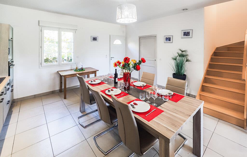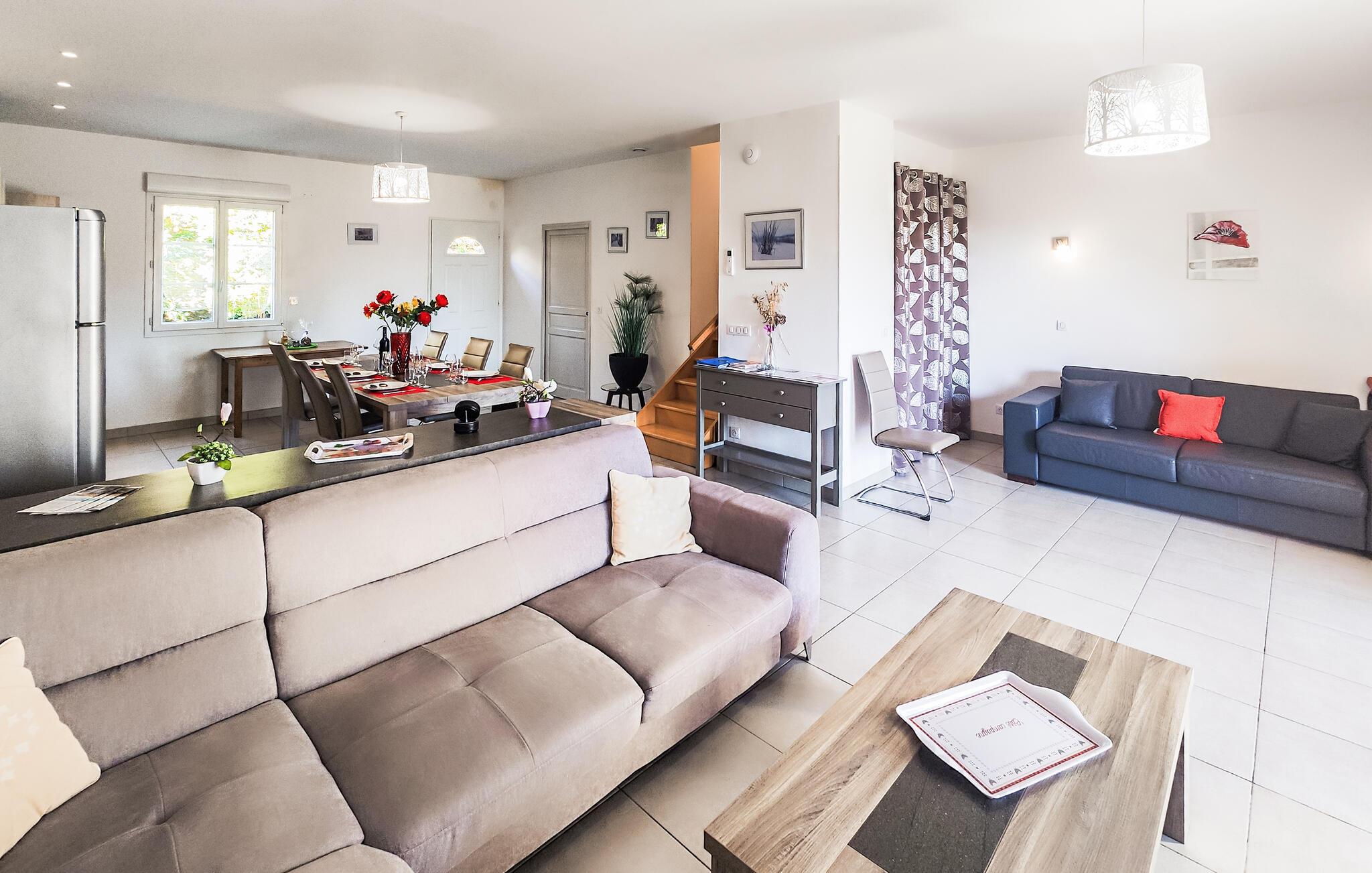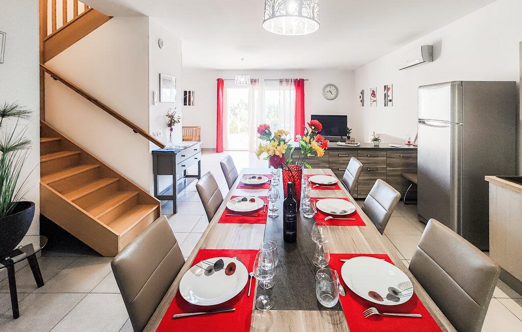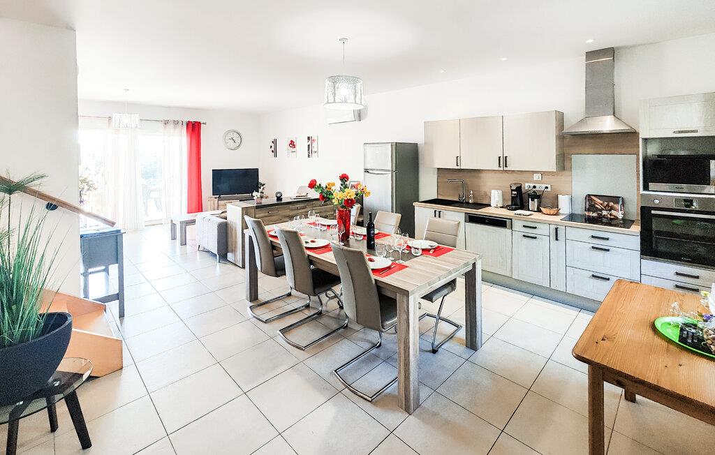 Genießen Sie die helle, freundliche Atmosphäre des modernen Wohnbereichs, der Sie mit klaren Linien und viel Tageslicht willkommen heißt. Entspannen Sie sich bei einem duftenden Kaffee, schmieden Sie Pläne für den kommenden Urlaubstag oder hören Sie in ruhiger Umgebung Ihre Lieblingsmusik. Kochen Sie zusammen in der offenen Küche und verbringen Sie gesellige Stunden mit Familie oder Freunden.