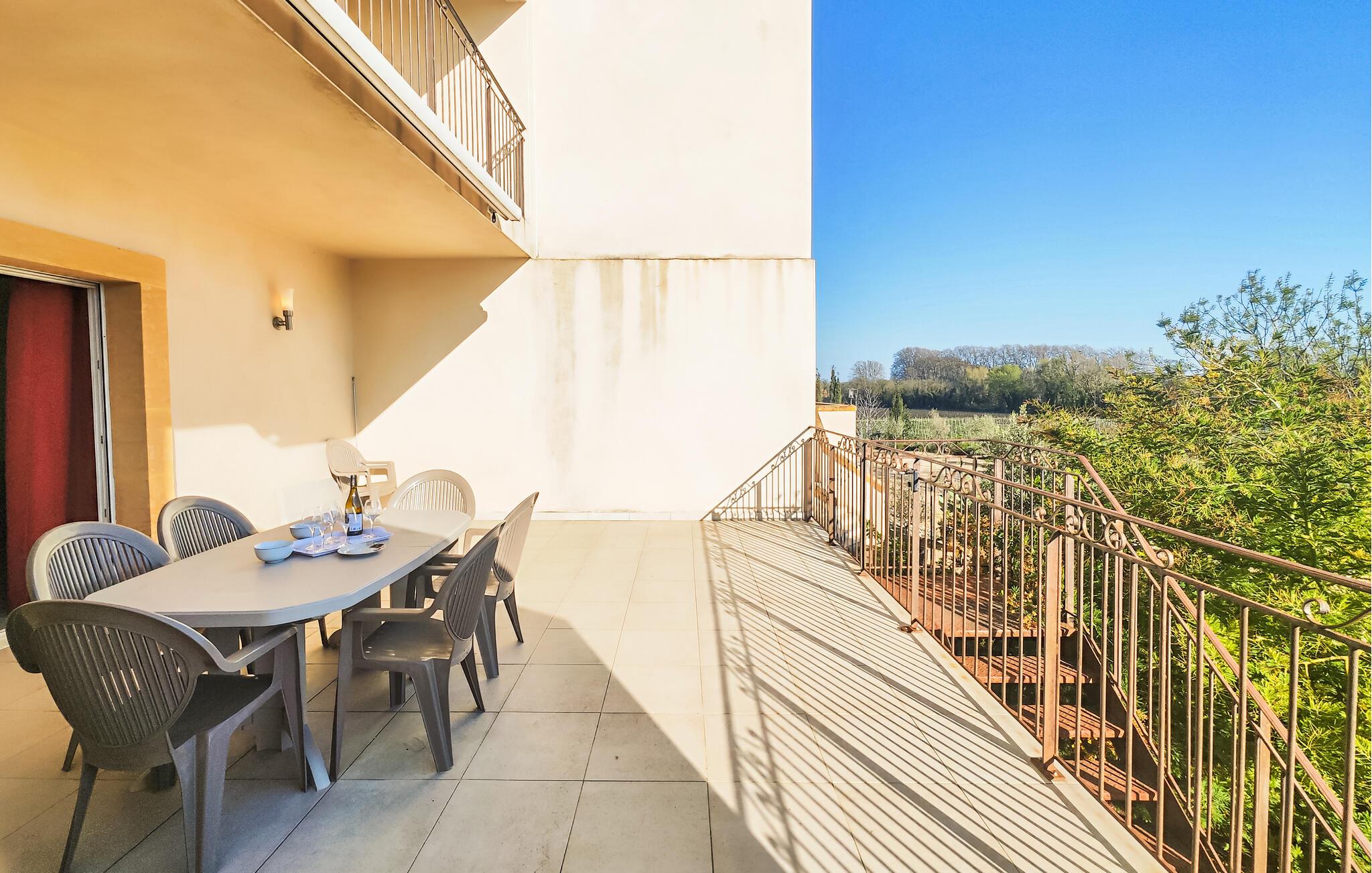 Von Ihrem Balkon aus haben Sie einen wunderbaren Blick über die weite Landschaft – frühstücken Sie hier oder vertiefen Sie sich in Ihre Urlaubslektüre. Erfrischen Sie sich jederzeit im gemeinsamen Pool und genießen Sie die Ruhe im grünen Garten auf einem der Liegestühle.
