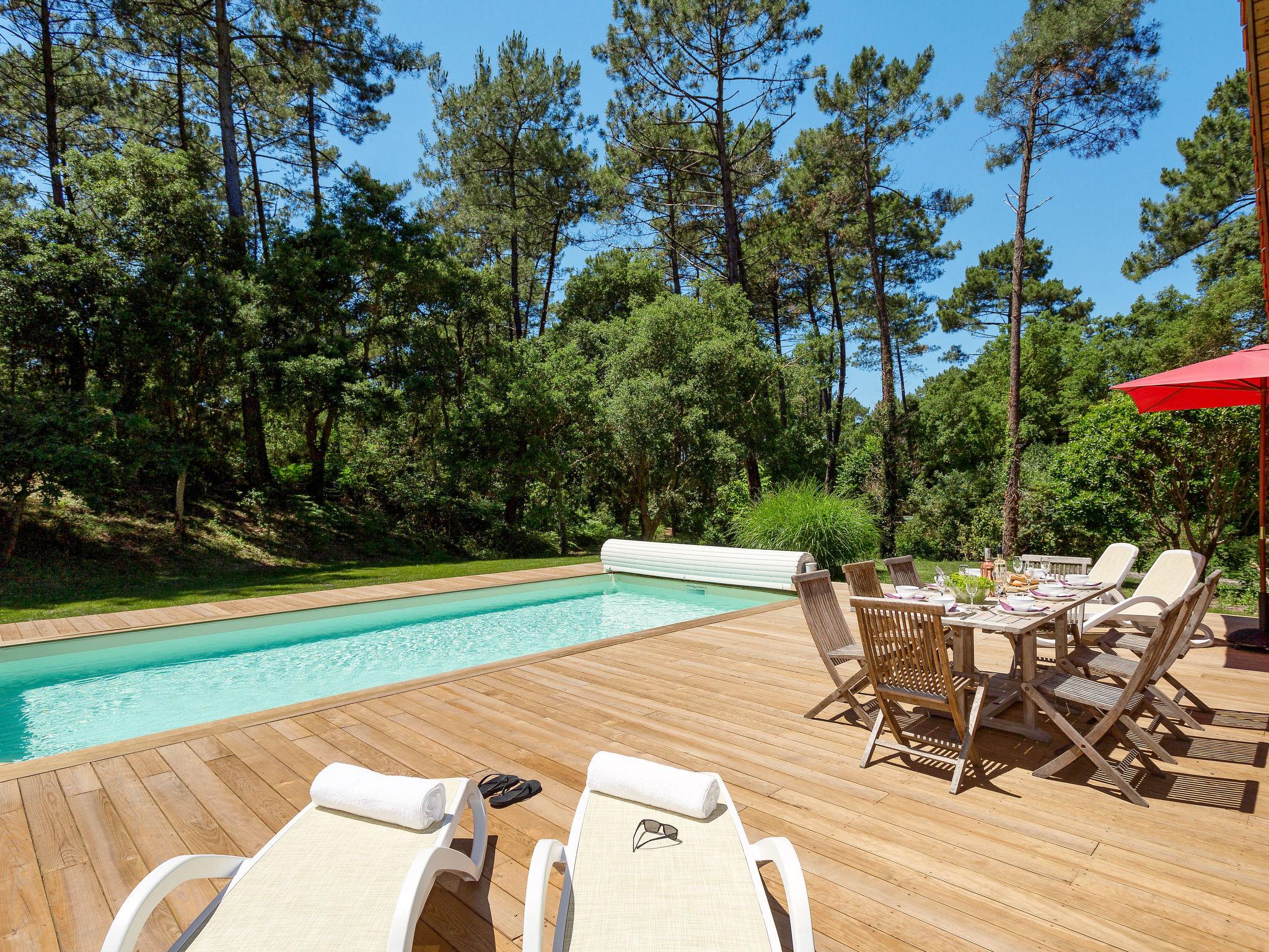 Schöne, komfortable Ferienanlage "Clairière aux Chevreuils". 29 Häuser im Ferienresort. 2 km vom Zentrum von Moliets-Bourg, 8 km vom Zentrum von Vieux Boucau, 35 km vom Zentrum von Dax, 1.8 km vom Meer. Zur Alleinbenutzung: Grundstück 600 m2 mit Rasen und Bäumen, Schwimmbad (saisonale Verfügbarkeit: 23.Mai. - 03.Okt.). In der Anlage: Empfang, Wireless LAN. Brötchenservice. Parkplatz auf dem Grundstück. Einkaufsgeschäft 2 km, Supermarkt 6 km, Bahnstation "Dax" 35 km, Sandstrand 2.5 km. Jacht-Hafen 30 km, Golfplatz (18 Loch) 1.5 km. Bitte beachten: Das Foto ist nur ein Hausbeispiel. Die Mietobjekte können sich in Wohnfläche, Raumaufteilung, Ausstattung und Einrichtung unterscheiden. Pro Person liegt ein Bademantel bereit. Ebenso wird pro Haus ein Begrüßungskorb mit Getränken bereitgestellt.