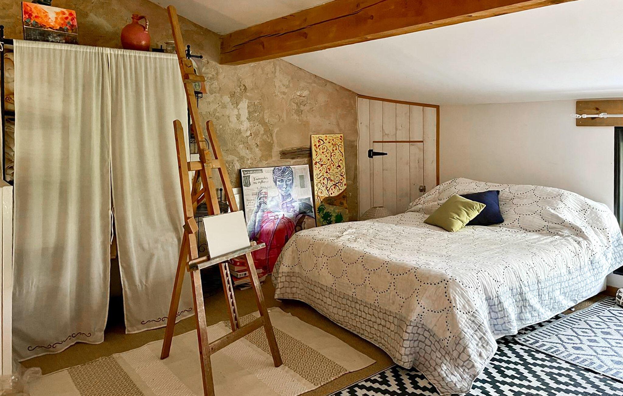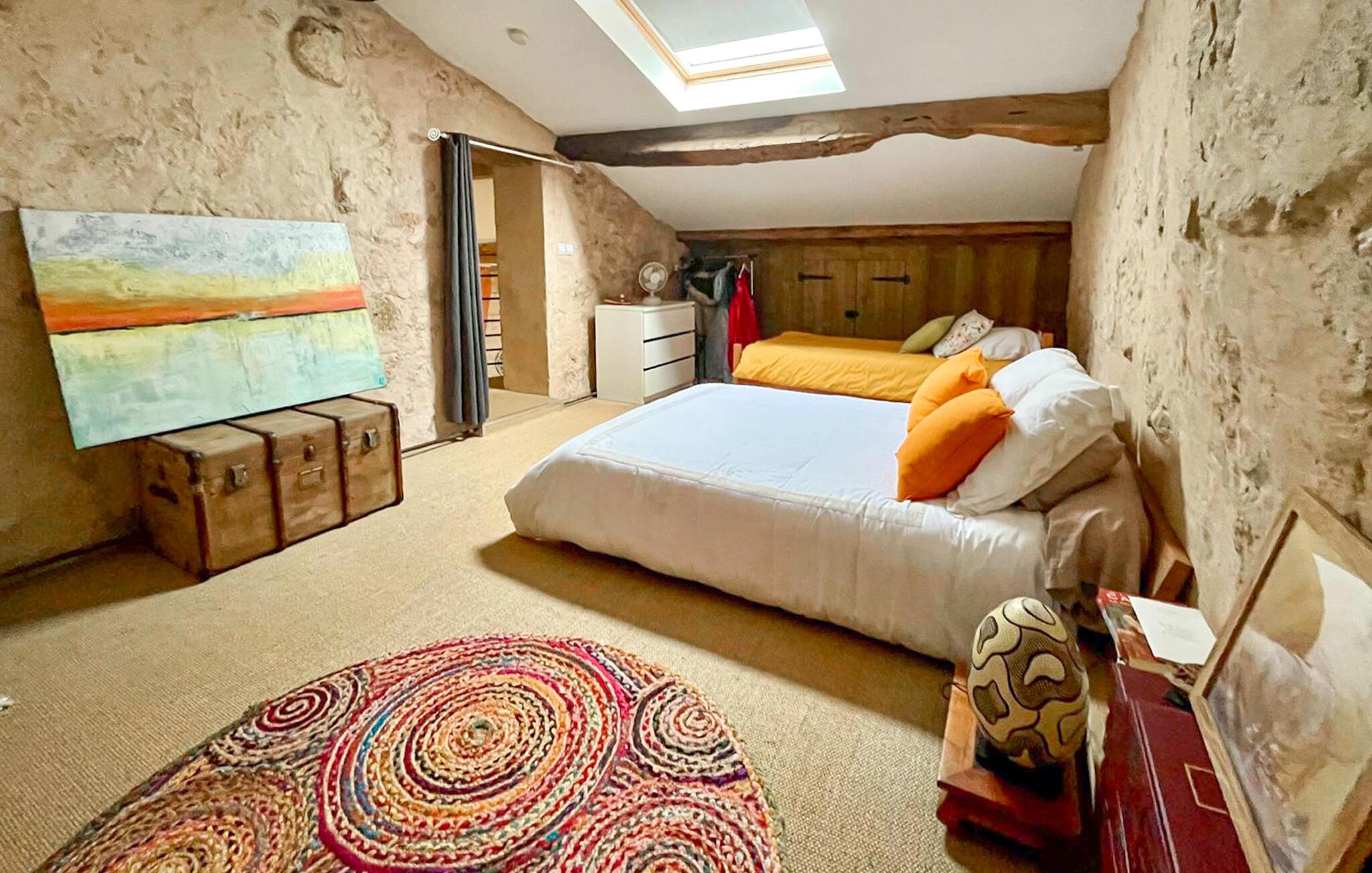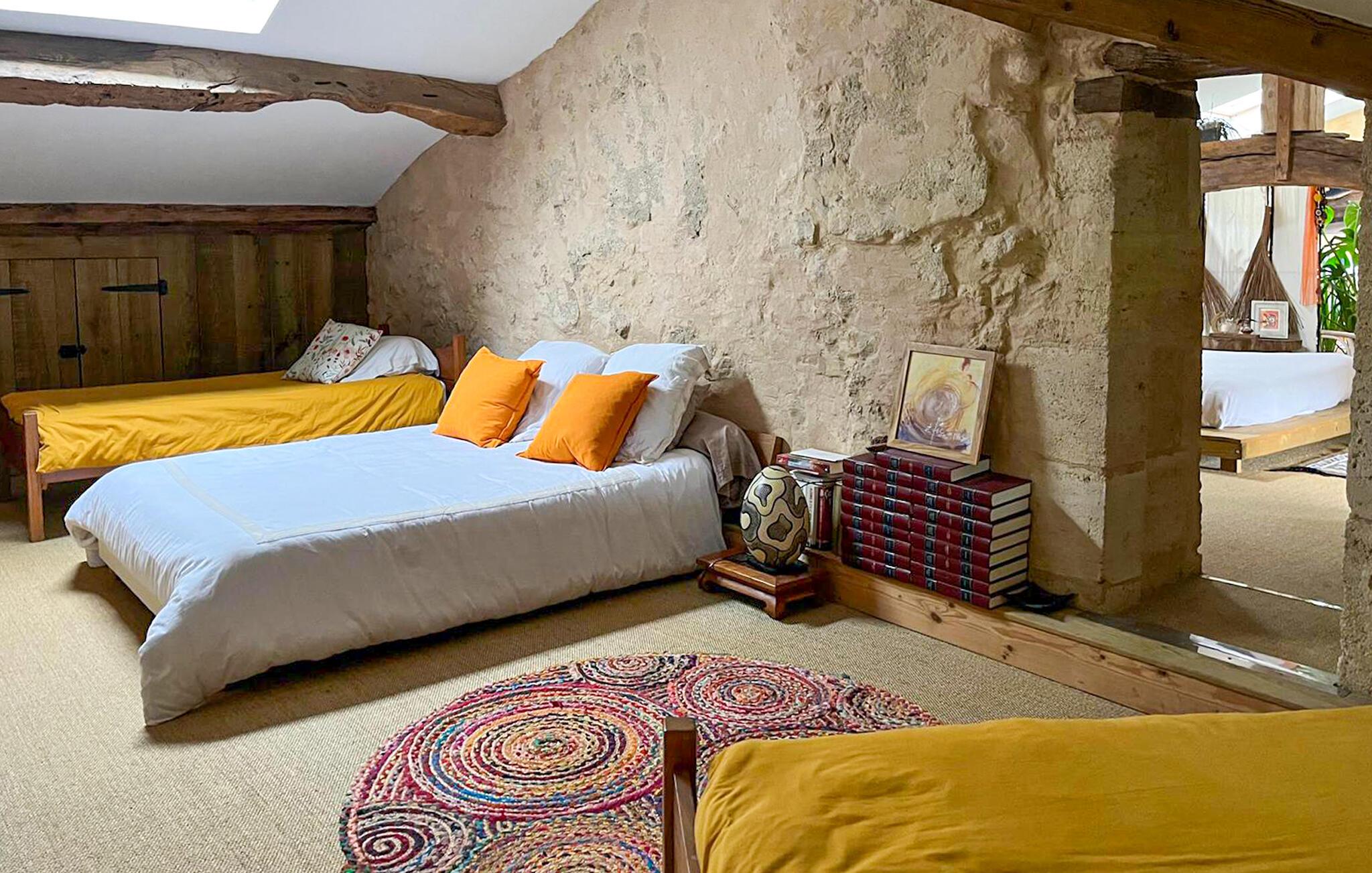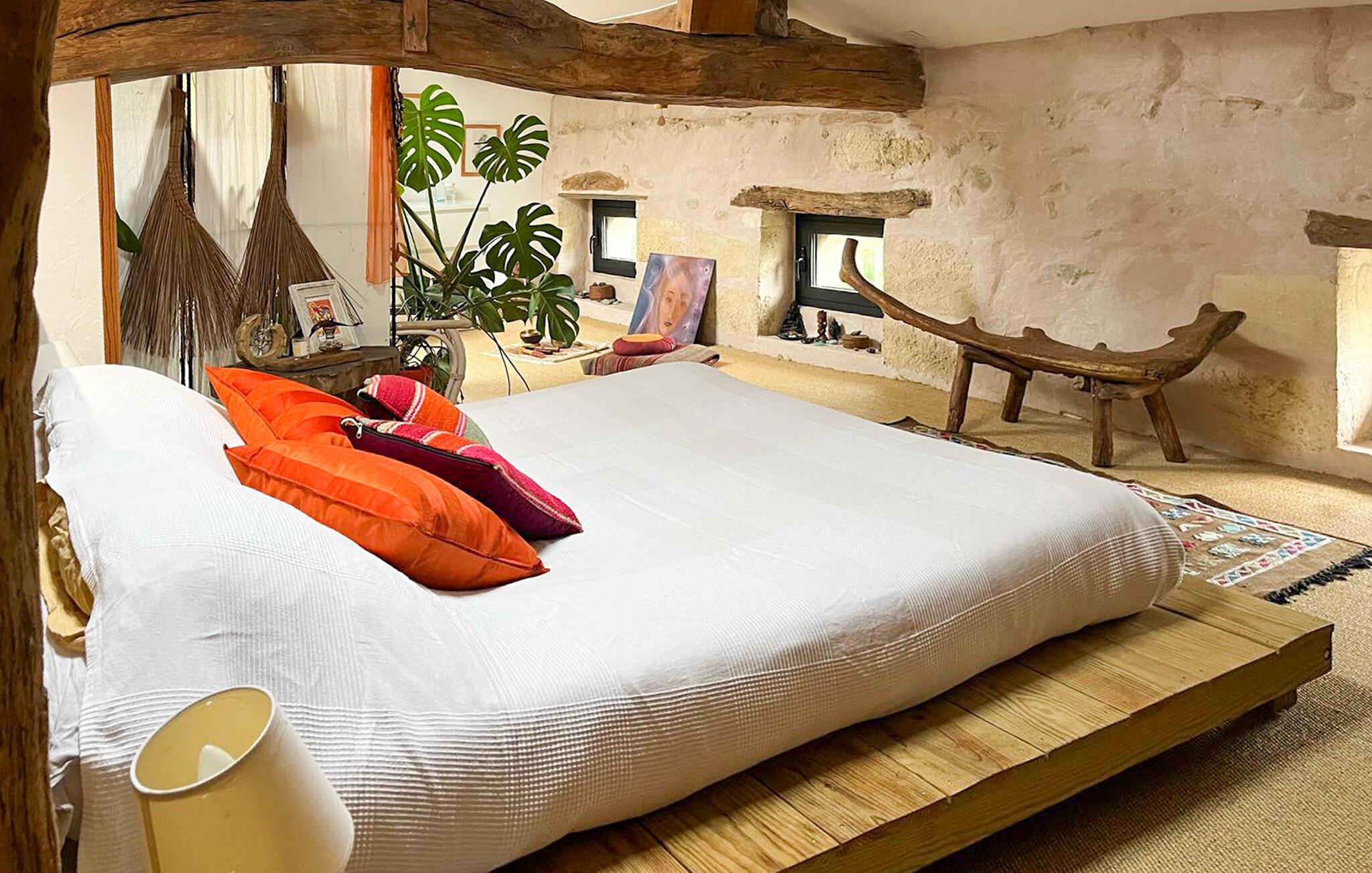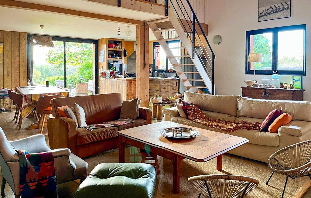 Dieses im Weinanbaugebiet Bordelais gelegene Haus verbindet historischen Charme und Komfort auf harmonische Weise. Natursteinwände, Holzbalken und ein imposanter Kamin schaffen eine Atmosphäre, die behaglich und gediegen zugleich ist. Entspannen Sie sich auf dem bequemen Sofa bei einem guten Glas Wein, hören Sie Ihre Lieblingsmusik oder folgen Sie einem spannenden Podcast. In der praktischen Küche können Sie neue Rezepte ausprobieren und gemeinsam am rustikalen Tisch essen.