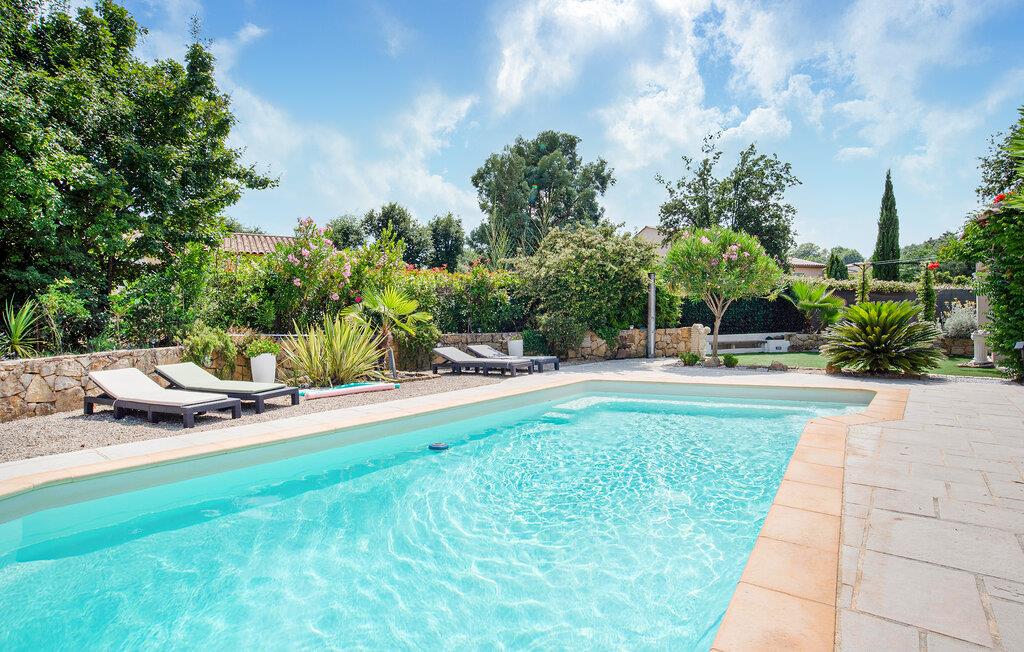 Draußen erwartet Sie ein herrlicher Pool, in dem Sie sich nach Lust und Laune erfrischen können. Servieren Sie sich ofenfrische Croissants auf der Terrasse, tanken Sie Sonne auf der Liege und lassen Sie bei stimmungsvollen Grillabenden bei Kerzenschein die friedliche Atmosphäre auf sich wirken.