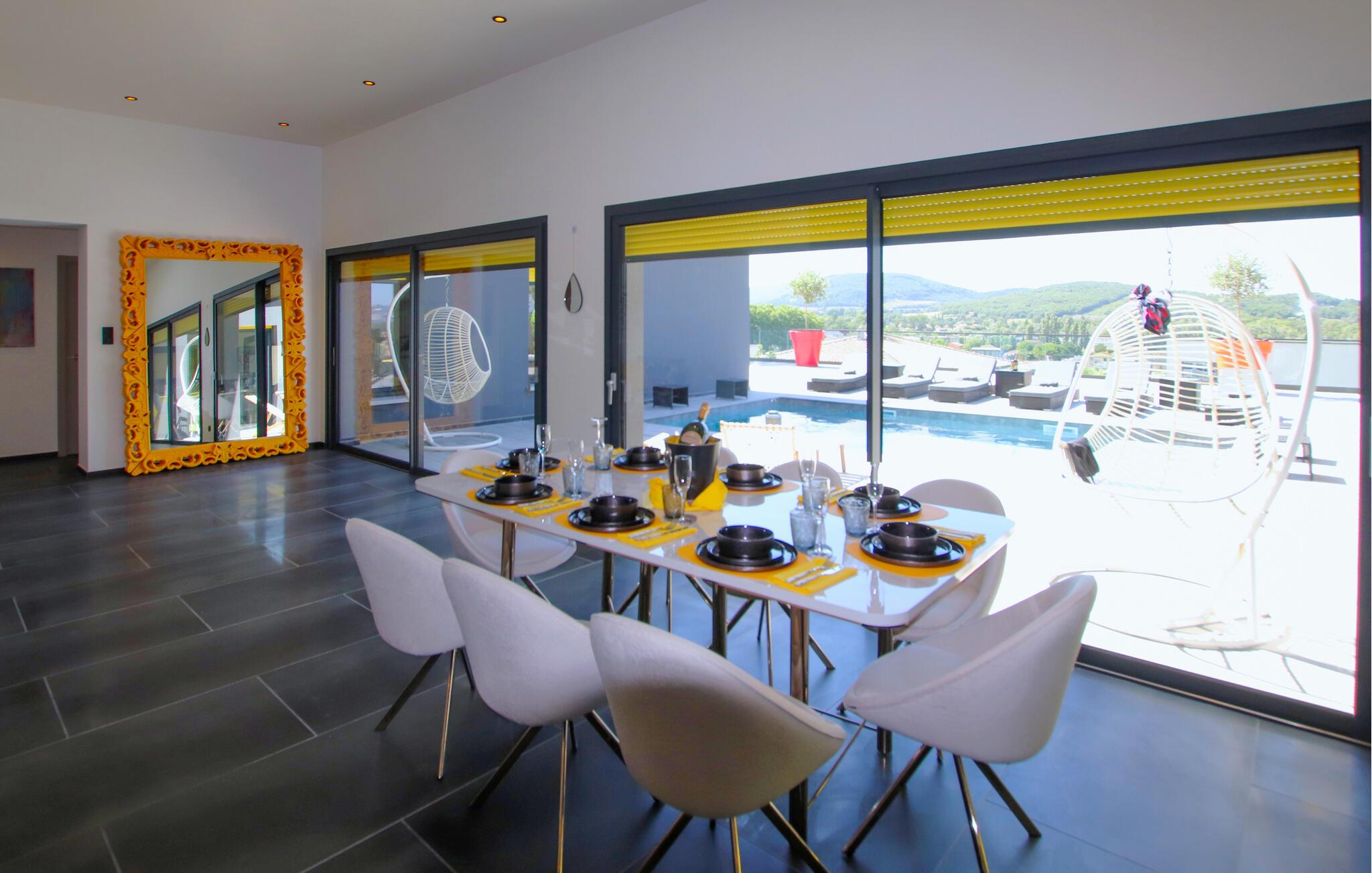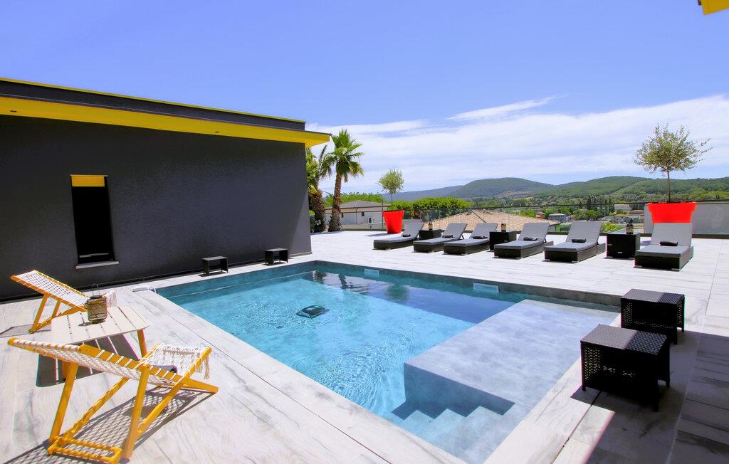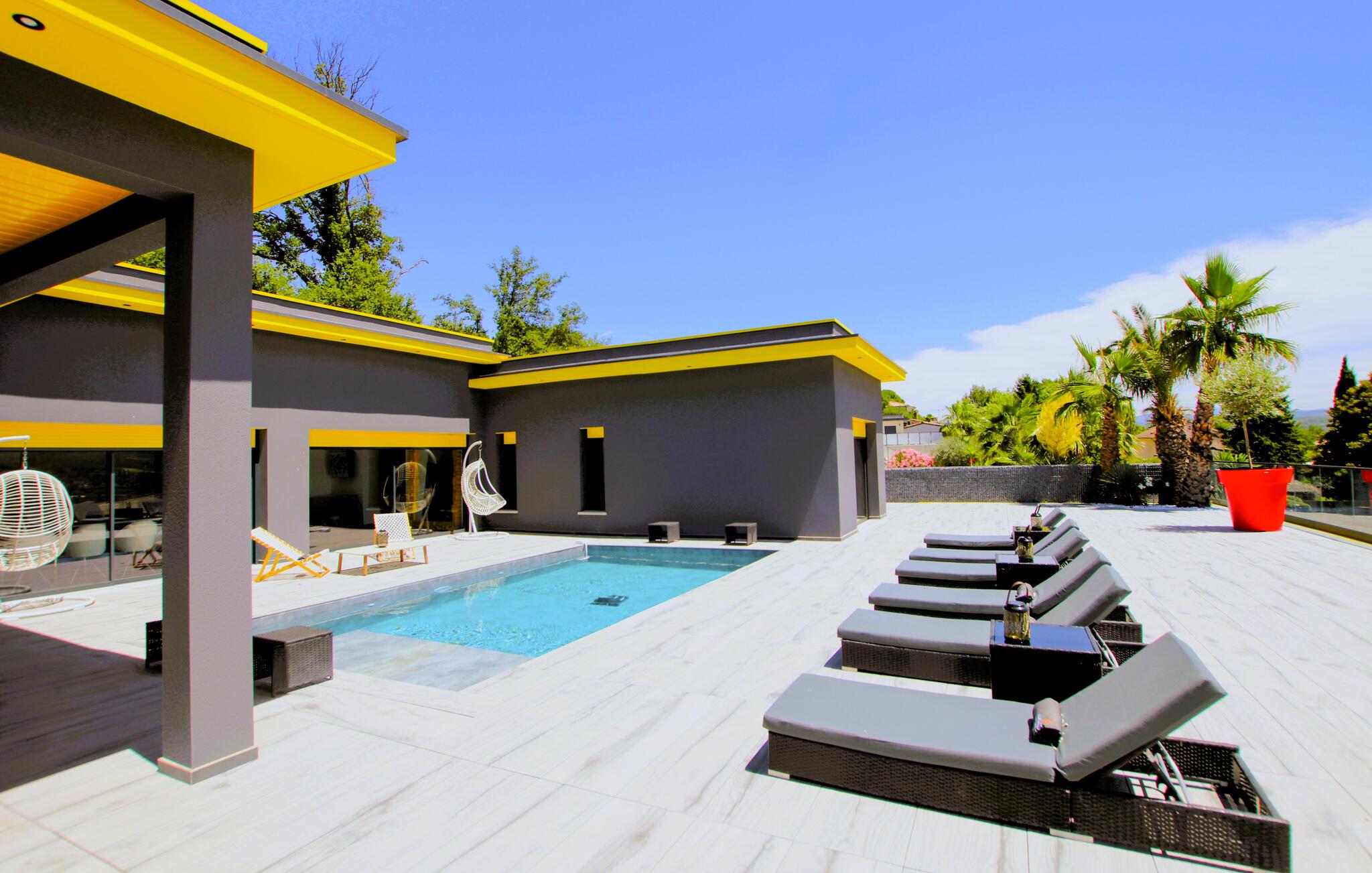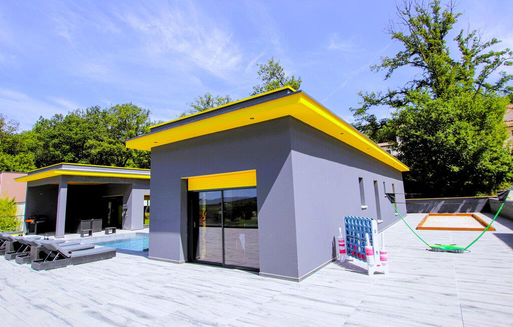 Der überdachte, nach Südosten ausgerichtete Patio bietet einen herrlichen Blick auf das Vercors-Massiv. Hier entspannen Sie auf bequemen Sonnenliegen und erfrischen sich nach Lust und Laune im herrlichen Pool. Entfachen Sie den Grill und genießen Sie stimmungsvolle Abende mit mediterranem Flair.